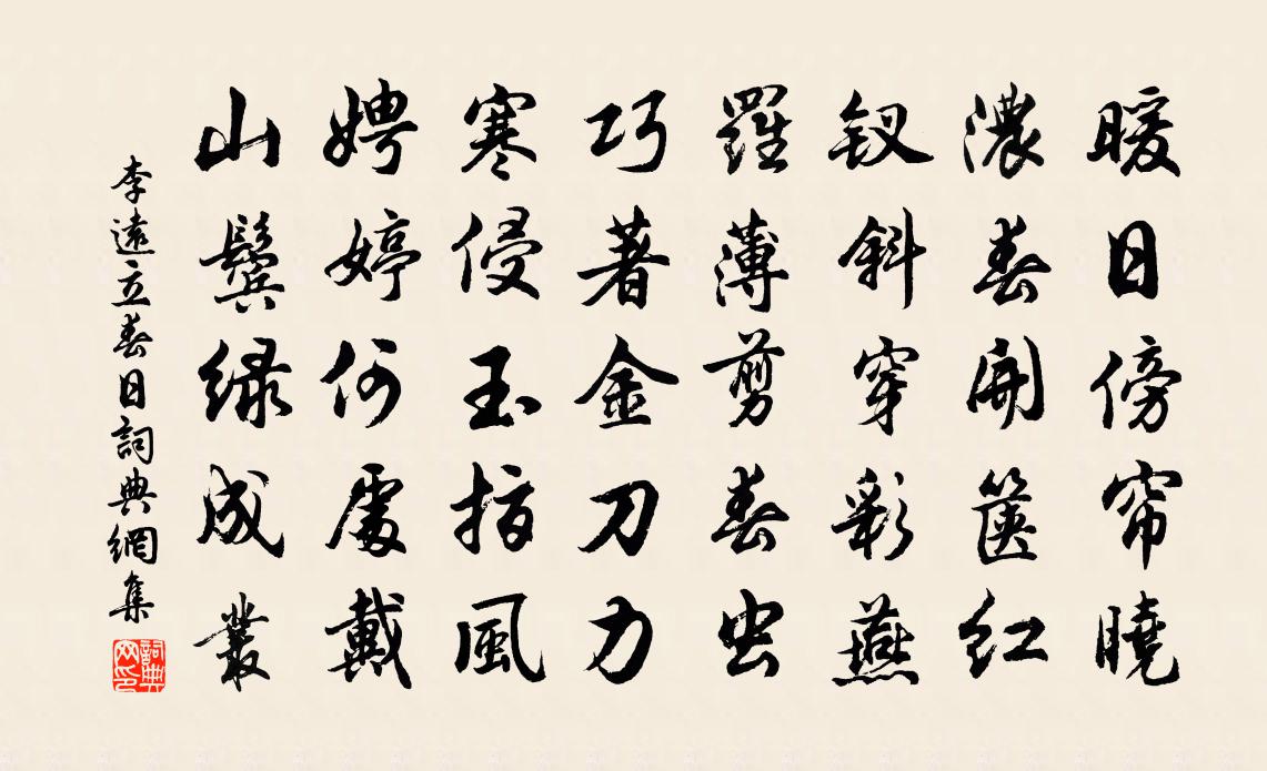 詩詞名句歷史字典書法欣賞書法字典國語詞典說文解字康熙字典古漢語字典標 題 作 者 詩 句 立春日作者:李遠 朝代:唐代立春日原文暖日傍簾曉,濃春開篋紅。釵斜穿彩燕,羅薄剪春蟲。巧著金刀力,寒侵玉指風。娉婷何處戴,山鬢綠成叢。詩詞問答問:立春日的作者是誰?答:李遠問:立春日寫於哪個朝代?答:唐代問:立春日是什麼體裁?答:五律李遠立春日書法欣賞立春日書法作品注釋全唐詩:卷519-1詩詞推薦次韻杏花三首王安石〔宋代〕只愁風雨劫春回,怕見枝頭爛熳開。野鳥不知人意緒,啄教零亂點蒼苔。金陵晚眺艾可叔〔宋代〕星移物換千年事,虎踞龍蟠萬雉城。歸巷烏衣秋縹緲,點州白鷺雪分明。江分南北天為限,淮接東西地最平。目斷八月十五夜月二首杜甫〔唐代〕滿目飛明鏡,歸心折大刀。轉蓬行地遠,攀桂仰天高。水路疑霜雪,林棲見羽毛。此時瞻白兔,直欲數秋毫。稍下漁家傲王哲〔元代〕跳出凡籠尋性命。人心常許依清靜。便是修行真捷徑。親禪定。虛中轉轉觀空迥。認得祖宗醒復醒。紅紅赫赫如金次韻伯元季奕送成父因以見寄五絕句趙蕃〔宋代〕輕薄紛紛覆手空,兩家交契百年中。要折青蘭為遠贈,同心更助服之衷。歸來曲侯善淵〔元代〕真常道,日用遍三千。大則包羅天地外,小周沙芥亦如然。物物盡通玄。威神力,混里任循環。撞破虛空七八片,春夜韋明府宅宴得春字駱賓王〔唐代〕酌桂陶芳夜,披薜嘯幽人。雅琴馴魯雉,清歌落范塵。宿雲低迥蓋,殘月上虛輪。幸此承恩洽,聊當故鄉春。和毛君州宅八詠其五李八百洞蘇轍〔宋代〕洞府山川百里賒,洞門藤蔓鎖煙霞。神仙不與人間異,弟妹還應共一家。大孤山祠晁補之〔宋代〕江吞湖卷氣俱豪,崛起孤峰百仞高。歸為嬋娟買絲屨,卻應還我所忘刀。野花羅鄴〔唐代〕拂露叢開血色殷,枉無名字對空山。時逢舞蝶尋香至,少有行人輟棹攀。若在侯門看不足,為生江岸見如閒。結根渚宮亂後作鄭谷〔唐代〕鄉人來話亂離情,淚滴殘陽問楚荊。白社已應無故老,清江依舊繞空城。高秋軍旅齊山樹,昔日漁家是野營。牢落鷓鴣天 錦峰晴雪沈禧〔元代〕蜀錦峰頭雪半融。倚空一朵玉芙蓉。面朝陽處光消釋。背向陰邊尚積重。天氣朗,日光瞳。看來渾似畫圖中。灞橋秋懷十首韓元吉〔宋代〕朝行佛屋魚千里,暮借僧床鷯一枝。窗下秋蟲解人意,似憐羈客伴喔詩。句李白〔唐代〕心為 * 劍,淚是報恩珠。大水次友人韻戴栩〔宋代〕天公豈是出新奇,漲潦茫茫秋暮時。牽浪何曾傳雨信,回南不用制風旗。拍浮瓮盎鳴相屬,顛倒籬牆去若馳。數日夏雲峰(傷春)仲殊〔宋代〕天闊雲高,溪橫水遠,晚日寒生輕暈。閒階靜、楊花漸少,朱門掩、鶯聲猶嫩。悔匆匆、過卻清明,旋占得餘芳,南柯子 自誡馬鈺〔元代〕兒女心頭盡,田園意上除。金銀財寶與妻孥。物物般般,屏棄恰如無。卻著人情事,堪嗟性蠢愚。不如一撥守清虛朝中措(月季)趙師俠〔宋代〕開隨律琯度芳辰。鮮艷見天真。不比浮花浪蕊,天教月月常新。薔薇顏色,玫瑰態度,寶相精神。休數歲時月季,南鄉子·落日照樓船朱熹〔宋代〕落日照樓船,穩過澄江一片天。珍重使君留客意,依然,風月從今別一川。離緒悄危弦,永夜清霜透幕氈。明日回小池楊萬里〔宋代〕泉眼無聲惜細流,樹陰照水愛晴柔。小荷才露尖尖角,早有蜻蜓立上頭。名句推薦明朝事與孤煙冷,做滿湖、風雨愁人。吳文英《渡江雲三犯·西湖清明》 地白風色寒,雪花大如手。李白《嘲王歷陽不肯飲酒》 腸斷月明紅豆蔻,月似當時,人似當時否?納蘭性德《鬢雲松令·枕函香》 慟哭六軍俱縞素,衝冠一怒為紅顏。吳偉業《圓圓曲》 人情似紙張張薄,世事如棋局局新。佚名《增廣賢文·上集》 雞鳴紫陌曙光寒,鶯囀皇州春色闌。岑參《奉和中書舍人賈至早朝大明宮》 逢人且說三分話,未可全拋一片心。佚名《增廣賢文·上集》 玉皇開碧落,銀界失黃昏。毛滂《臨江仙·都城元夕》 但看三五日,相見不如初。佚名《增廣賢文·上集》 奸巧語,穢污詞。市井氣,切戒之。李毓秀《弟子規·信》