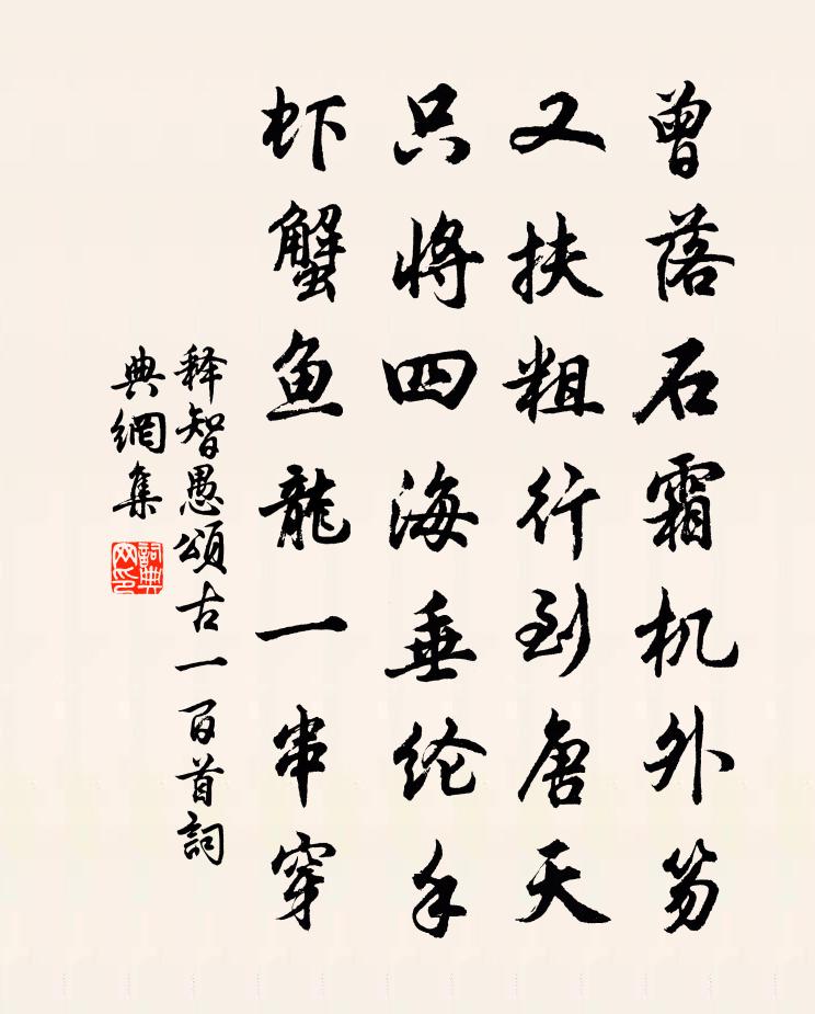 詩詞名句歷史字典書法欣賞書法字典國語詞典說文解字康熙字典古漢語字典標 題 作 者 詩 句 頌古一百首作者:釋智愚 朝代:宋代頌古一百首原文曾落石霜機外笏,又扶粗行到唐天。只將四海垂綸手,蝦蟹魚龍一串穿。詩詞問答問:頌古一百首的作者是誰?答:釋智愚問:頌古一百首寫於哪個朝代?答:宋代釋智愚頌古一百首書法欣賞頌古一百首書法作品詩詞推薦觀開西湖次吳左丞韻道潛〔宋代〕偉人謀議不求多,事定紛紛自唯阿。盡放龜魚還綠淨,肯容蕭葦障前坡。一朝美事誰能紀,百尺蒼崖尚可磨。天上漢宮春(九日登豐樂樓)佚名〔宋代〕手捻黃花,對西風無語,雙鬢蕭蕭。韶華暗中過眼,零落心交。登臨把酒,更誰伴、破橘持螯。惟只有,湖邊鷗鷺趙季茂遺予郭索侑之以詩予早上亦遣山餚兩介岳珂〔宋代〕倚桂傍岩麓,采芝行谷湄。偶因山雨駐,何有嶺雲持。鼎芼朝欺腹,窗寒夜切肌。開奩應一笑,會有憶人時。酌貪泉吳隱之〔魏晉〕古人云此水,一歃懷千金。試使夷齊飲,終當不易心。風入松周紫芝〔宋代〕禁菸過後落花天。無奈輕寒。東風不管春歸去,共殘紅、飛上鞦韆。看盡天涯芳草,春愁堆在闌乾。楚江橫斷夕陽憶秦娥(三之三)賀鑄〔宋代〕著春衫、玉鞭鞭馬南城南。南城南。柔條芳草,留駐金銜。粉娥采葉供新蠶。蠶飢略許攜纖纖。攜纖纖。湔裙淇上常州郡齋六首陳襄〔宋代〕山亭側畔構山房,便是耕雲鉤月鄉。未達功名窮飲水,此生應不誤行藏。驀山溪王炎〔宋代〕鶯啼花謝,斷送春歸去。雨後聽鵑聲,恰似訴、留春不住。韶光易邁,暗被老相催,無個事,沒些愁,方是安身處同慶府魯百能〔宋代〕山占仇池地,江分白馬氐。潭深龍自蟄,亭迥鳳曾棲。十疊劉克莊〔宋代〕有花多處便憑欄,插在金瓶不必看。百斛量珠真富貴,兩枝剪彩太寒酸。答費司法方岳〔宋代〕斐然偶成章,和者蓋凡幾。風騷李杜壇,可望不可至。而況濂洛徒,每嘆吾已已。豈無願學心,衰懦鼓不起。何方奉酬侍御家兄東洛閒居夜晴觀雪之什竇庠〔唐代〕洛陽宮觀與天齊,雪淨雲消月未西。清淺乍分銀漢近,輝光漸覺玉繩低。綠醽乍熟堪聊酌,黃竹篇成好命題。應念卜運算元辛棄疾〔宋代〕修竹翠羅寒,遲日江山暮。幽逕無人獨自芳,此恨知無數。只共梅花語。懶逐遊絲去。著意尋春不肯香,香在無尋雪霽晨起李德裕〔唐代〕雪覆寒溪竹,風卷野田蓬。四望無行跡,誰憐孤老翁。雜詩曹植〔魏晉〕轉蓬離本根,飄搖隨長風。何意回飈舉,吹我入雲中。高高上無極,天路安可窮?類此遊客子,捐軀遠從戎。毛褐吊程貢元許月卿〔宋代〕灑淚陳情表,何心貢澤宮。波平看躍鯉,浪急不成龍。花誥榮孀母,藍袍付畫工。無人儔孝友,煙樹慘新封。古城陳襄〔宋代〕蘆葦蕭疏天氣清,水含山色照重城。綠鞠何處管弦地,碧落舊時鐘鼓聲。三峽橋邊秋雨過,六鰲宮裡夜潮生。蕭郎餞怡齋胡憲使王義山〔宋代〕不是胸中熟呂刑,如何議讞極詳明。嚴於三尺古來法,寬以一分天好生。仁意滿腔皆惻隱,政聲交口說廉平。玉堂代人上平江徐郎五首曾協〔宋代〕巍峨冠冕聳精神,好傍軒墀對紫宸。一德擬推黃帝莢,紀年還數絳人旬。懸知紫詔馳三節,肯使朱轓駐兩輪。聞說歸風便賀鑄〔宋代〕津亭薄晚張離燕。紅粉□歌持酒歡。歌聲煎淚欲沾襟,酒色□□□□□。□□會有歸風便。休道相忘秋後□。□□名句推薦年年歲歲望中秋,歲歲年年霧雨愁。曾幾《癸未八月十四日至十六夜月色皆佳》 酒意詩情誰與共?淚融殘粉花鈿重。李清照《蝶戀花·暖雨晴風初破凍》 城隅南對望陵台,漳水東流不復回。岑參《登古鄴城》 舉棋不定,不勝其耦。左丘明《左傳·襄公·襄公二十五年》 又疑瑤台鏡,飛在青雲端。李白《古朗月行》 憶昔花間相見後,只憑縴手,暗拋紅豆。歐陽炯《賀明朝·憶昔花間相見後》 逕直夫何細!橋危可免扶?楊萬里《寒食上冢》 大雪壓青松,青松挺且直。陳毅《青松》 聖人不治已病,治未病;不治已亂,治未亂佚名《黃帝內經·素問·四氣調神大論》 提三尺劍以定四海吳兢《貞觀政要·卷八·論貢賦》
