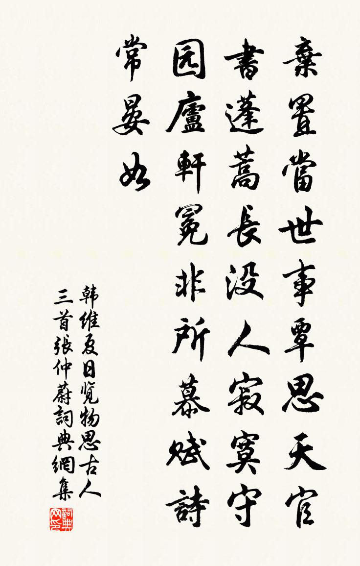 詩詞名句歷史字典書法欣賞書法字典國語詞典說文解字康熙字典古漢語字典標 題 作 者 詩 句 夏日覽物思古人三首張仲蔚作者:韓維 朝代:宋代夏日覽物思古人三首張仲蔚原文棄置當世事,覃思天官書。蓬蒿長沒人,寂寞守園廬。軒冕非所慕,賦詩常晏如。詩詞問答問:夏日覽物思古人三首張仲蔚的作者是誰?答:韓維問:夏日覽物思古人三首張仲蔚寫於哪個朝代?答:宋代韓維夏日覽物思古人三首張仲蔚書法欣賞夏日覽物思古人三首張仲蔚書法作品詩詞推薦庚寅二月朔積雪初霽過和山見雪深堂瑞香盛艾性夫〔宋代〕煙雨庭前錦繖張,一般穠郁雪深堂。偶扶晴日孤筇出,連挹春風兩屋香。供佛省燒蒼柏子,薰書不藉綠芸囊。冰霜大龍湫杜范〔宋代〕半世名聞始見之,洞心無語立多時。經行處處皆奇絕,此比諸峰更絕奇。過家黃庭堅〔宋代〕絡緯聲轉急,田車寒不運。兒時手種柳,上與雲雨近。舍傍舊傭保,少換老欲盡。宰木郁蒼蒼,田園變畦畛。招延呈子肅三首趙蕃〔宋代〕憶過君家黃堰居,春風楊柳政扶疏。人生離合自多感,邂逅更當搖落余。謁金門(和巽吾重賦海棠)劉辰翁〔宋代〕花露濕。紅淚裛成珠粒。比似昭陽恩未得。睡來添醉色。一笑嬌波滴滴。再顧羞潮拂拂。恨血千年明的皪。千年人次韻趙帥登平山堂陳造〔宋代〕修月於今第一功,後車九萬蜀箋紅。詩供寒食鶯花課,袖拂平山楊柳風。匝坐蕙蘭歌似剪,生香笑語酒如空。胡床偈頌一百零四首釋紹曇〔宋代〕玉版阿師,錦繃稚子。潁脫叢林,頭角呈露。參透尚未煎石磉盤,飽經鰲煉翻身去。塞斷咽喉,更須吞吐。毗耶未再謝見寄胡寅〔宋代〕非關糧盡不能興,自嘆車中蹭蹬鱗。詩客頗能憐逐客,饔人知復受鮫人。為憐飛箸千條玉,不忘牽潭百尺綸。腹似偈頌二十三首釋雲岫〔宋代〕如來藏中有一常圓之月,大如車輪,冷如冰雪,犀牛扇子何曾別。怒濤推出海,恰值中秋節。若也喚作白蓮花,浮漁家樂唐寅〔明代〕世泰時豐芻米賤,買酒頗有青銅錢。夕陽半落風浪舞,舟船入港無危顛。烹鮮熱酒招舍己,滄浪迭唱仿扣舷。醉來再用韻謝王簿來詩褒借過當之意虞儔〔宋代〕早魃爭攘袂,群龍僅守龕。雲峰疑燎火,天色轉澄藍。甘露元同注,叢林莫遍參。新來焦渴甚,無夢到沉酣。寄題張仲欽左司盤澗陸游〔宋代〕劍溪之南有佳處,山靈屍之不輕付。張公鼻祖晉司空,談笑得地開窗戶。溪光如鏡新佛拭,白雲青嶂無朝暮。伏几五更出舍郎王哲〔元代〕三更哩出舍郎。最相當。神丹就,養兒娘。一對陰陽真箇好,坐車廂。金牛子,載搬忙。別袁州司戶司馬行二首彭龜年〔宋代〕一見已草草,那堪更別離。事當防快意,學亦進潛思。此道今誰語,如公豈我私。何時一窗下,重與論心期。再次前韻呈林郎中五首陳造〔宋代〕清詩似奏韶樂音,林侯宿世孤山林。疎雲時漏涼月影,雛鳳獨嘯修竹陰。金華後山儼在目,非子誰復鉤其深。掩鄭如夢令 蒙友惠詞王哲〔元代〕明月古今長有。怎奈華宗海口。黑窟裡頭居。黯不分夜晝。吾友。吾友。問你如何下手。絕句三首張耒〔宋代〕藹藹晴郊花氣浮,午窗正睡擁駝裘。覺來鳥雀茅檐靜,屋角春風怒未休。初至毗陵簡巽老時有所懷也李處權〔宋代〕從來語默有千鈞,亂後相逢氣益振。好鳥開窗如應客,清風挽竹故留人。更貧豈顧墦間祭,已老猶堪席上珍。說到題郭索集趙文〔宋代〕鉤輈格磔李群玉,嵬眼澒耳樊宗師。人生歌哭貴適意,閒倚秋江聽竹枝。餞用晦侄南安令趙汝騰〔宋代〕作邑無他法,精神在拊摩。吏肥民必瘦,酒少飯宜多。寧拙催科考,須知於為歌。莫將還債看,好事易蹉跎。名句推薦為問元戎竇車騎,何時返旆勒燕然。皇甫冉《春思》 雨濕花房,風斜燕子,池閣晝長春晚。呂渭老《選冠子·雨濕花房》 微風搖紫葉,輕露拂朱房。沈約《詠芙蓉》 非鬼亦非仙,一曲桃花水辛棄疾《生查子·獨游雨岩》 歷冰霜、不變好風姿,溫如玉。陸容《滿江紅·詠竹》 庭樹不知人去盡,春來還發舊時花。岑參《山房春事二首》 篳路藍縷,以啟山林。左丘明《左傳·宣公·宣公十二年》 惟有兩行低雁,知人倚、畫樓月。范成大《霜天曉角·梅》 芙蓉生在秋江上,不向東風怨未開。高蟾《下第後上永崇高侍郎》 悲歌可以當泣,遠望可以當歸。佚名《悲歌》