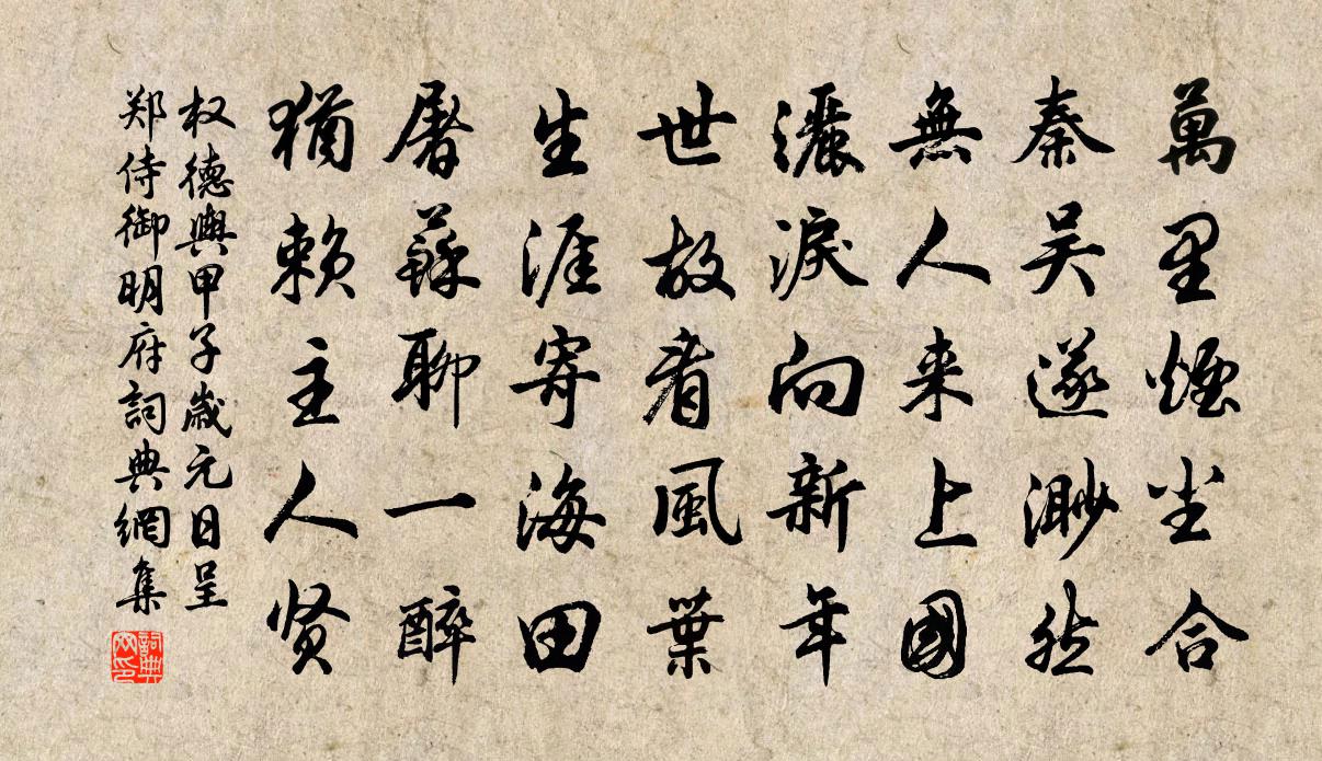 詩詞名句歷史字典書法欣賞書法字典國語詞典說文解字康熙字典古漢語字典標 題 作 者 詩 句 甲子歲元日呈鄭侍御明府作者:權德輿 朝代:唐代甲子歲元日呈鄭侍御明府原文萬里煙塵合,秦吳遂渺然。無人來上國,灑淚向新年。世故看風葉,生涯寄海田。屠蘇聊一醉,猶賴主人賢。詩詞問答問:甲子歲元日呈鄭侍御明府的作者是誰?答:權德輿問:甲子歲元日呈鄭侍御明府寫於哪個朝代?答:唐代問:甲子歲元日呈鄭侍御明府是什麼體裁?答:五律權德輿甲子歲元日呈鄭侍御明府書法欣賞甲子歲元日呈鄭侍御明府書法作品注釋全唐詩:卷325-17詩詞推薦道傍水行可愛孫應時〔宋代〕寒風鳴歲陰,芸物已歸靜。郊原何蕭瑟,松竹自清整。道傍足幽意,林屋甚井井。雞犬在籬落,沙水暮光映。古來三十六灣許渾〔唐代〕縹緲臨風思美人,荻花楓葉帶離聲。夜深吹笛移船去,三十六灣秋月明。去郡日寄居諸公作餞即席奉呈吳芾〔宋代〕三年江上守孤城,日日思歸去未能。雖愧憩棠無惠政,卻欣伐木有良朋。花開後圃春同醉,月滿高樓夜共燈。別後與顏錢塘登障樓望潮作孟浩然〔唐代〕百里聞雷震,鳴弦暫輟彈。府中連騎出,江上待潮觀。照日秋雲迥,浮天渤澥寬。驚濤來似雪,一坐凜生寒。菩薩蠻舒亶〔宋代〕朱簾乍卷層煙起。露華深淺初疑洗。困倚玉闌風。綺羅知幾重。向人如有意。不醉何時醉。便得一枝紅。猶勝兩鬢謁告得歸拜呈內機知府郎官五首程公許〔宋代〕違覆由來諱詭隨,民勞未有甚今時。一分寬受一分賜,喜見留屯奏便宜。偶述鄙懷奉呈僕射相公李至〔宋代〕從來迂僻寡朋儔,今日優恩豈自酬。抱病也容居粉署,好吟仍使在蓬丘。利名場裡心尤拙,少俊叢中鬢獨秋。早晚御苑採茶歌十首熊蕃〔宋代〕紛綸爭徑蹂新苔,回首龍園曉色開。一尉鳴鉦三令趣,急持煙籠下山來。書田俊卿北征紀行詩廖行之〔宋代〕南北東西一個天,區區二偶漫相憐。而今若說悲遊子,不似當時王仲宣。再和二首劉克莊〔宋代〕少小從軍事袴鞾,只今廟算主通和。胡來復去兔三窟,民散未收蜂一窩。病覺風光於我薄,老知書冊誤人多。罪言新喻道上史彌寧〔宋代〕翠分濃淡山開畫,紅暈淺深花弄妝。詩料自來尋老子,句成渾費思量。雜劇·崔鶯鶯待月西廂記·張君瑞慶團園(第五本)王實甫〔元代〕楔子(末引僕人上,開,雲)自暮秋與小姐相別,倏經半載之際。托賴祖宗之蔭,一舉及第,得了頭名狀元。如今紹興祀岳鎮海瀆四十三首佚名〔宋代〕有岌斯安,有涵斯洽。聿相厥成,允祀是答。爰飭迺奏,迺三既協。於昭降止,是遵是接。和梅摯北池十詠蔣堂〔宋代〕池上有修竹,遙聞手自栽。幾因風韻響,時感隼旟來。粉籜經梅脫,虬根遇石回。嬋娟綠陰下,小閣為誰開。徐介卿赴召經筵二詩送之李曾伯〔宋代〕袂判平山十五年,喜迎召節下樓船。交情一見歲寒在,世事幾番春夢然。我亦將歸謀佚老,公今此去類登仙。一杯畫壁鄧深〔宋代〕松柏雙雙夾竹青,來遊仙客稱閒情。一時幻出誰能爾,四者依然太瘦生。鬱郁相交堪掬翠,昂昂自得若聞聲。如何沖寂觀李堅〔宋代〕玉兔朝天去不回,空餘露井薦晨杯。屋鈴不語湖如掌,無復凌空逸士來。方稚川恕齋五絕曾豐〔宋代〕視後而著鞭,書此以自儆。一言行終身,要處君已領。送王殿丞西京簽判司馬光〔宋代〕清白世風存,王公復有孫。挺生如玉樹,不竭似淮源。日背嵩峰紫,春添洛水喧。幕中多勝友,肯使負芳樽。航海之賓陀防真歇師兄釋正覺〔宋代〕至人親見古觀音,化跡今居海上岑。煙機外分青嶂骨,水天中見白雲心。潮痕擁岸稜稜雪,月魄浮波爛爛金。根境名句推薦待到山花爛漫時,她在叢中笑。 * 《卜運算元·詠梅》 相逢意氣為君飲,系馬高樓垂柳邊。王維《少年行四首》 舉頭紅日近,回首白雲低。寇準《詠華山》 漸老多憂百事忙,天寒日短更心傷。李覯《秋晚悲懷》 守恬淡以養道,處卑下以養德,去嗔怒以養性,薄滋味以養氣。陳繼儒《小窗幽記·集景篇》 關山多雨雪,風水損毛衣。李遠《詠雁》 莫唱當年長恨歌,人間亦自有銀河。袁枚《馬嵬》 此夜曲中聞折柳,何人不起故園情。李白《春夜洛城聞笛 / 春夜洛陽城聞笛》 問君何事輕離別,一年能幾團圓月。納蘭性德《菩薩蠻·問君何事輕離別》 南國有佳人,容華若桃李。曹植《雜詩·南國有佳人》