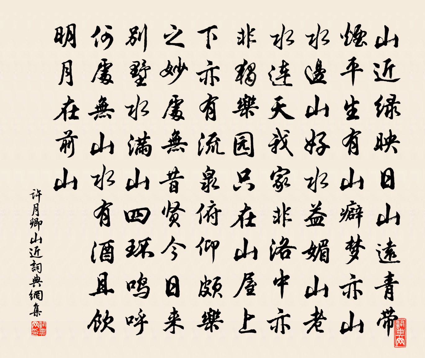 詩詞名句歷史字典書法欣賞書法字典國語詞典說文解字康熙字典古漢語字典標 題 作 者 詩 句 山近作者:許月卿 朝代:宋代山近原文山近綠映日,山遠青帶煙。平生有山癖,夢亦山水邊。山好水益媚,山老水連天。我家非洛中,亦非獨樂園。只在山屋上,下亦有流泉。俯仰頗樂之,妙處無昔賢。今日來別墅,水滿山四環。鳴呼何處無山水,有酒且飲明月在前山。詩詞問答問:山近的作者是誰?答:許月卿問:山近寫於哪個朝代?答:宋代許月卿山近書法欣賞山近書法作品詩詞推薦病暑賀鑄〔宋代〕早夏景延永,烈日天中央。欻欻燎原野,中人如探湯。病肺苦焦渴,吐舌生喉瘡。蔗漿與茗飲,未易蘇膏盲。稍驚與鄭錫遊春李嘉祐〔唐代〕東門垂柳長,回首獨心傷。日暖臨芳草,天晴憶故鄉。映花鶯上下,過水蝶悠颺。借問同行客,今朝淚幾行。飲酒樂陸機〔魏晉〕蒲萄四時芳醇,瑠璃千鍾舊賓。夜飲舞遲銷燭,朝醒弦促催人。仙跡岩題詩二十三首道院佚名〔宋代〕幽棲枹朴古先精,宴坐參同元化並。一炷青香騰瑞靄,雲端時透步虛聲。去冬蒙君實示嘉篇懶拙不即修謝臨書走筆深愧韓維〔宋代〕南園百草雨中秋,把燭題詩寄驛郵。意重不辭終日看,韻強深愧隔年酬。登山屢赴幽人約,築野猶稽聖主求。命駕次韻趙寄庵陳著〔宋代〕家住黃沙綠水灣,功名土苴任天慳。顧瞻宇宙驚多礙,收卷江湖憩一閒。處子聲容心自鐵,太公年幾鬢才斑。老來王君貺宣徽垂示嵩山祈雪詩十章合為一篇以酬司馬光〔宋代〕今秋少雨冬不雪,麥寄浮埃根欲絕。聖主焦心閔萬民,負扆不怡常膳撤。詔書朝下遍九州,岳瀆百神俱禱求。西都句張先〔宋代〕霓舟忽艤鱸魚鄉,槎閣卻凌雲漢域。有感十首吳芾〔宋代〕延福池台荊棘深,上皇無復更登臨。寂寥崇觀當年事,愁絕關河萬里心。再委趙丞陽山送龍禱雨虞儔〔宋代〕傳聞神姥產英靈,雷電當時亦晦冥。好雨因宜隨禱應,夜窗曾誤幾番聽。關心病守頭空白,失喜農夫眼倍青。水溢內直以金橘送七兄周必大〔宋代〕晝臥玉堂殿,眼看金彈丸。禹包經歲月,鄭驛助杯盤。黃帶霜前綠,甘移醉後酸。江湖有兄弟,此日憶團欒。秋日閒詠馬臻〔元代〕西湖晴雨畫圖間,坐倚闌乾自解顏。無酒可供千日醉,有錢難買一生閒。草衰春色來時路,鶴宿秋聲起處山。橫笛野蠶於濆〔唐代〕野蠶食青桑,吐絲亦成繭。無功及生人,何異偷飽暖。我願均爾絲,化為寒者衣。江上吟曉王貞白〔唐代〕一葉野人舟,長將載酒游。夜來吟思苦,江上月華秋。曉露滿紅蓼,輕波颺白鷗。漁翁似有約,相伴釣中流。久雨曾幾〔宋代〕誰言春雨散如絲,一月垂空似綆縻。雲去雲來何日了,花開花落不曾知。直愁排盪根荄盡,安用栽培桃李為。政恐喜涼亭吳機〔宋代〕小亭新築藕花邊,為愛陂塘五月天。最好一番風雨過,瓊珠無數落清泉。題吳若愚一經堂劉子翬〔宋代〕老矣惟書愛未消,喜聞新塾出塵囂。軒窗近水來無厭,弦誦因風聽忽遙。遊藝定知輕拾芥,正心端欲似耘苗。一經寄廣文張博士王建〔唐代〕春明門外作卑官,病友經年不得看。莫道長安近於日,升天卻易到城難。再賦前韻五首王洋〔宋代〕高臥江濱百慮清,獨於詩思尚營營。不勞刻楮三年力,攻破劉郎五字城。心重答身白居易〔唐代〕因我疏慵休罷早,遣君安樂歲時多。世間老苦人何限,不放君閒奈我何。名句推薦善不積不足以成名,惡不積不足以滅身。佚名《易傳·繫辭傳下·第五章》 蘭溪三日桃花雨,半夜鯉魚來上灘。戴叔倫《蘭溪棹歌》 軍聽了軍愁,民聽了民怕。王磐《朝天子·詠喇叭》 憂民之憂者,民亦憂其憂。孟子《孟子·梁惠王章句下·第四節》 碧海年年,試問取、冰輪為誰圓缺?納蘭性德《琵琶仙·中秋》 山下孤煙遠村,天邊獨樹高原。王維《田園樂七首·其五》 持斧伐遠揚,荷鋤覘泉脈。王維《春中田園作》 故人何不返,春華復應晚。柳惲《江南曲》 人情似紙張張薄,世事如棋局局新。佚名《增廣賢文·上集》 大丈夫生居天地間,豈能鬱郁久居人下!羅貫中《三國演義·第九回》