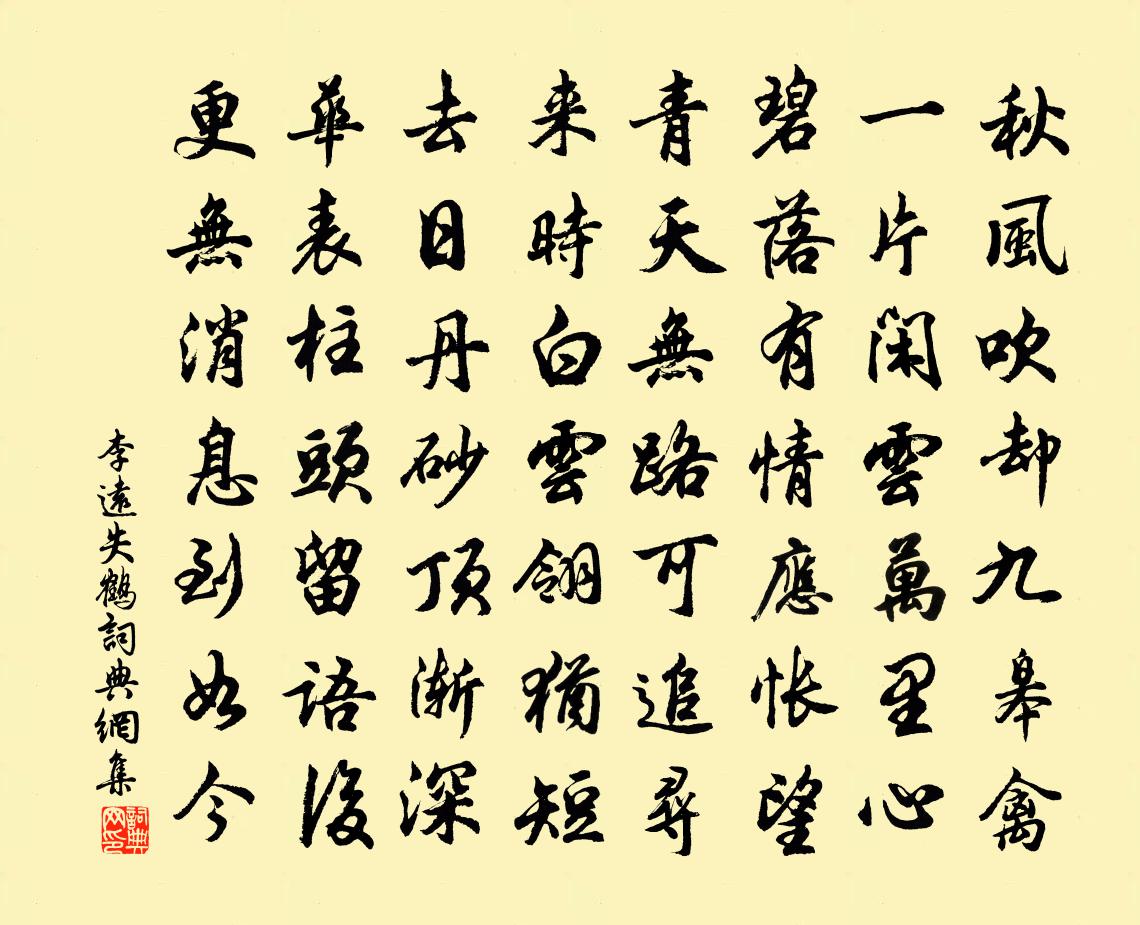 詩詞名句歷史字典書法欣賞書法字典國語詞典說文解字康熙字典古漢語字典標 題 作 者 詩 句 失鶴作者:李遠 朝代:唐代失鶴原文秋風吹卻九皋禽,一片閒雲萬里心。碧落有情應悵望,青天無路可追尋。來時白雲翎猶短,去日丹砂頂漸深。華表柱頭留語後,更無訊息到如今。詩詞問答問:失鶴的作者是誰?答:李遠問:失鶴寫於哪個朝代?答:唐代問:失鶴是什麼體裁?答:七律李遠失鶴書法欣賞失鶴書法作品注釋全唐詩:卷519-16詩詞推薦句王嵒〔宋代〕暗穿地脈龍先覺,密贊天工雨不知。金剛隨機無盡頌能淨業障分第十六釋印肅〔宋代〕冰泮春池日,野岸花狼藉。傷嗟今古人,幾個知恩力。題南山刻石詩許給〔宋代〕聖主崇儒本,文宣教愈口。嚴祠加整葺,賢守口遵依。將欲更□□,先來相翠微。小山開亂石,幽谷駐涵暉。澤炎五鼓孔武仲〔宋代〕永夜無塵事,閒眠似道堂。紙窗分曉色,絮被借春陽。萬慮此中息,一身今可忘。周公不足夢,佳趣在羲皇。淮陰張耒〔宋代〕蘆梢林葉雨蕭蕭,獨臥孤舟聽楚謠。生計飄然一搔首,西風沙上趁歸潮。次和天童僧惠杲書記袖詩來訪三首陳著〔宋代〕當年颶捲地輪移,拄杖東還雲與飛。太白岩前綠陰下,相逢無語聽催歸。思賢黃庭堅〔宋代〕楊家事業絕當時,百家疏通問不疑。高文大冊書鴻烈,潤色論思禁林傑。堂堂司直社稷臣,諫有用否不辱身。勁氣元會觀禮呈僕射相國呂公宋庠〔宋代〕乾歷端辰啟,王庭慶禮昭。虞篇五端輯,漢句九賓朝。物象開蒼陸,聲明薄絳霄。寒依朱燎盡,春入綵旗遙。舞翟令逸作歲寒知松柏題詩因作趙蕃〔宋代〕不有桃歲寒時,桃若為松柏桃知。南方桃故多暖,此物寧能奇。漫道同生植,何雲盛衰齊。不臣真浪說,難用空增寧宗朝享三十五首真宗〔宋代〕聖有謨訓,詒謀燕翼。奉天酌祖,萬世維則。維皇孝熙,乾乾夕陽。禮既式旋,惟福之錫。神宗皇帝輓詞三首蘇轍〔宋代〕稽古堯無作,勤邦禹有功。政新天地力,事改漢唐風。禮樂寰中盛,梯航海外通。華封徒有誦,龍御忽乘空。承平清水驛叢竹天水趙雲余手種一十二莖柳宗元〔唐代〕檐下疏篁十二莖,襄陽從事寄幽情。只應更使伶倫見,寫盡雌雄雙鳳鳴。山居客至圖唐寅〔明代〕紅樹黃茅野老家,日高山犬吠籬笆。合村會議無他事,定是人來借花時。送楊岳歸巴陵周賀〔唐代〕何處得鄉信,告行當雨天。人離京口日,潮送岳陽船。孤鳥背林色,遠帆開浦煙。悲君唯此別,不肯話回年。貧居釋智圓〔宋代〕山廚灶上苔痕碧,齊盂生塵無粒食。可憐雀鼠未知貧,穿屋穿墉不暫息。畦桑詞劉基〔明代〕編竹為籬更栽刺,高門大寫畦桑字。縣官要備六事忙,村村巷巷催畦桑。畦桑有增不可減,準備上司來計點。新官楚騷有正有反予既以數語詠獨開荷花諸公寵和劉學箕〔宋代〕一從炎暑變秋風,識破維摩色想空。豈有三乘無盡法,尚憐孤艷十分紅。唯慚寡陋吟懷劣,卻愛諸賢句法工。共倚益壽美金花侯善淵〔元代〕擘開鬼窟。杳杳冥冥精恍惚。滿目華陽。*耀靈珠映日光。至真無物。寶燦精*明返復。致死不忘。星*丹霄得久題趙大年小景張舜民〔宋代〕生長深宮不識山,騷人一見便開顏。分明記得經行處,青草湖邊第幾灣。夢仙韓偓〔唐代〕紫霄宮闕五雲芝,九級壇前再拜時。鶴舞鹿眠春草遠,山高水闊夕陽遲。每嗟阮肇歸何速,深羨張騫去不疑。澡練名句推薦致治在於任賢,興國在於務農。陳壽《三國志·魏書·辛毗楊阜高堂隆傳》 鴻雁不堪愁里聽,雲山況是客中過。李頎《送魏萬之京》 善有善報,惡有惡報。不是不報,時候未到。佚名《增廣賢文·上集》 紙灰飛作白蝴蝶,淚血染成紅杜鵑。高翥《清明日對酒》 一片閒愁,想丹青難貌柳永《尾犯·夜雨滴空階》 不管垂楊珠淚進,滴碎荷聲千頃。王夫之《清平樂·詠雨》 愔愔坊陌人家,定巢燕子,歸來舊處。周邦彥《瑞龍吟·大石春景》 撩亂舞晴空,發人無限思。劉禹錫《柳花詞三首》 寧為蘭摧玉折,不作蕭敷艾榮。劉義慶《世說新語·言語》 天與短因緣,聚散常容易。晏幾道《生查子·狂花頃刻香》