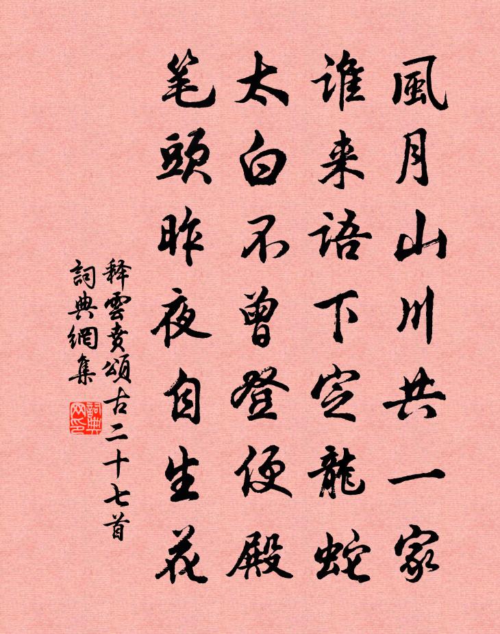 詩詞名句歷史字典書法欣賞書法字典國語詞典說文解字康熙字典古漢語字典標 題 作 者 詩 句 頌古二十七首作者:釋雲賁 朝代:宋代頌古二十七首原文風月山川共一家,誰來語下定龍蛇。太白不曾登便殿,筆頭昨夜自生花。詩詞問答問:頌古二十七首的作者是誰?答:釋雲賁問:頌古二十七首寫於哪個朝代?答:宋代釋雲賁頌古二十七首書法欣賞頌古二十七首書法作品詩詞推薦寄送於去非三首趙蕃〔宋代〕三載尉雖卑,諸公況己知。薦書常沓至,賓幕每牢辭。玉立風神峻,河傾議論馳。他年繼質肅,應有後人祠。沁園春宋先生〔宋代〕速速修行,惜取身中,無價□珍。把金烏玉兔,爐中煉用,陰陽造化,養就陽神。虎嘯龍吟丹田裡,頂內時時仙樂次韻劉後村所贈延慶主僧圭復翁詩三首陳著〔宋代〕清到復翁方是清,不求名處莫逃名。南湖一片平鋪水,中有拍天波浪聲。舟中雜紀 其九王冕〔元代〕野水連天碧,秋花夾路黃。順風船過疾,落日鳥飛忙。感物獨惆悵,逢時喜老蒼。文章隨氣運,不必論班揚。即席次君禮年兄韻秦觀〔宋代〕情舒喜面山浮翠,袖滿薰風涼透時。萍碎錦鱗金網舉,影差簾燕玉鉤垂。輕輕篆鼎凝香細,款款方壼轉漏遲。清興鵲橋仙 張古齊送古銅研滴,書此為謝劉敏中〔元代〕烏瞻三足,蟾看*腹。矯首驚虬突兀。走來便吸繡江波,卻只是、陶泓舊物。玄卿如故,毛生未禿。老楮猶堪一拂燕春台(送鄭毅齋入觀)趙以夫〔宋代〕錦里春回,玉墀天近,東風穩送雕韉。祖帳移來,光流萬斛金蓮。十分香月娟娟。照人間、一點魁躔。此時新事,七十生朝制坡帽衛宗武〔宋代〕喜到生朝疾有瘳,旋裁坡老帽蒙頭。肖形雅稱氅披鶴,緩步何須杖策鳩。皓首今為七十老,黃花更有幾番秋。明年章徵君見和所寄詩再次本韻酬贈楊億〔宋代〕武夷山秀建溪清,身隱心閒事不縈。前古是非為己任,故鄉人物與誰憑。勸農春壠巾頻折,逢客秋郊蓋暫傾。彩服早秋過郭涯書堂(一作郭勁書齋)周賀〔唐代〕暑消岡舍清,閒語有餘情。澗水生茶味,松風滅扇聲。遠分臨海雨,靜覺掩山城。此地秋吟苦,時來繞菊行。次韻潛師放魚蘇軾〔宋代〕法師說法臨泗水,無數天花隨麈尾。勸將淨業種西方,莫待夢中呼起起。哀哉若魚竟坐口,遠愧知幾穆生醴。況逢庚子三月二十七日又易守當塗四月十一日發辭岳珂〔宋代〕去載西陲夏正初,首驚禹閣下除書。璇杓導旨方螭陛,珍圉迎釐又燕居。三見綸音傳詔璽,六看{肇去聿加木}信御筵送李宣徽知真定府司馬光〔宋代〕秋風蕭瑟引華旌,祖宴高張出斗城。玉饌芳菲羅百鐵,繡衣照耀擁千兵。驪歌未闋長楊苑,騎吹先臨細柳營。雨露別同志鄭谷〔唐代〕所立共寒苦,平生同與游。相看臨遠水,獨自上孤舟。天淡滄浪晚,風悲蘭杜秋。前程吟此景,為子上高樓。柳(一作和白樂天詔取永豐柳植上苑,時為東都留守)韓琮〔唐代〕折柳歌中得翠條,遠移金殿種青霄。上陽宮女含聲送,不忿先歸舞細腰。天童玲瓏岩樓鑰〔宋代〕捫蘿歷棧上層峰,寖覺芒鞋踏半空。七竅幾時開渾沌,八窗無處不玲瓏。已欣古洞容身過,直恐丹丘有路通。俯視觀鹽井二首袁說友〔宋代〕桔槔汲水三千丈,頃轉輪餘一日回。蓑笠傍城埋井底,皮囊契出滷泉來。虎溪羅與之〔宋代〕沖飆吹客襟,飄拂虎溪渡。遠想三笑時,此意固有寓。孰知秘密藏,奚間笑默語。繩繩徹上下,綿綿貫今古。東林送崔融杜審言〔唐代〕君王行出將,書記遠從征。祖帳連河闕,軍麾動洛城。旌旃朝朔氣,笳吹夜邊聲。坐覺煙塵掃,秋風古北平。即事陸游〔宋代〕老來百事似嬰兒,美睡甘餐只自知。陋屋略如營窟世,淳風不減結繩時。名句推薦運往無淹物,年逝覺已催。謝靈運《歲暮》 寒隨一夜去,春逐五更來。史青《應詔賦得除夜》 歲華向晚愁思,誰念玉關人老?蔡挺《喜遷鶯·霜天秋曉》 知君仙骨無寒暑。蘇軾《木蘭花令·次馬中玉韻》 老景蕭條,送君歸去添淒斷。毛滂《燭影搖紅·送會宗》 春未綠,鬢先絲。人間別久不成悲。姜夔《鷓鴣天·元夕有所夢》 聽風聽雨過清明。愁草瘞花銘。吳文英《風入松·聽風聽雨過清明》 似此星辰非昨夜,為誰風露立中宵。黃景仁《綺懷》 低頭弄蓮子,蓮子清如水佚名《雜曲歌辭·西洲曲》 樓台處處迷芳草,風雨年年怨落花。曾棨《維揚懷古》