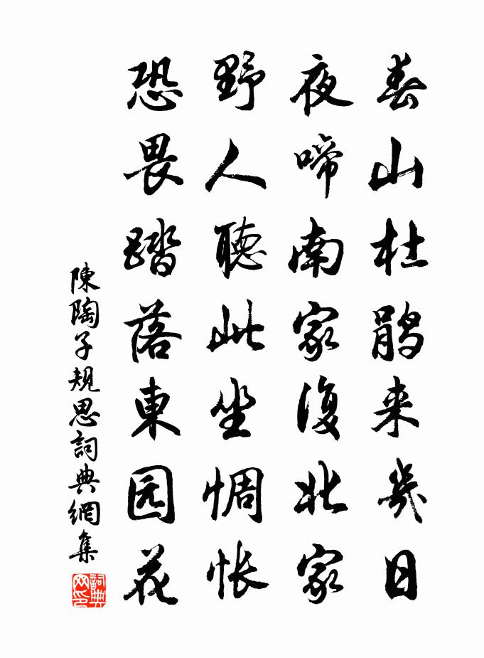 詩詞名句歷史字典書法欣賞書法字典國語詞典說文解字康熙字典古漢語字典標 題 作 者 詩 句 子規思作者:陳陶 朝代:唐代子規思原文春山杜鵑來幾日,夜啼南家復北家。野人聽此坐惆悵,恐畏踏落東園花。詩詞問答問:子規思的作者是誰?答:陳陶問:子規思寫於哪個朝代?答:唐代問:子規思是什麼體裁?答:七絕陳陶子規思書法欣賞子規思書法作品注釋全唐詩:卷746-43詩詞推薦壺中天慢/念奴嬌曾覿〔宋代〕素飆漾碧,看天衢穩送、一輪明月。翠水瀛壺人不到,比似世間秋別。玉手瑤笙,一時同色,小按霓裳疊。天津橋東歸出城留別知己徐夤〔唐代〕韋蒙屈指許非才,三載長安共酒杯。欲別未攀楊柳贈,相留擬待牡丹開。寒隨御水波光散,暖逐衡陽雁影來。他日從駕玉津園二首曹勛〔宋代〕花梢糝糝動朱欄,萱草侵苔雪已乾。行闕風光隨處樂,春台人物不知寒。偶得雙鯽陸游〔宋代〕今朝溪女留鮮鯽,灑掃茅檐旋置樽。養老不須煩祝鯁,從來楚俗慣魚餐。聞李四光丞頻游北園因有懷寄楊億〔宋代〕漢相沙堤連甲第,石家金谷有名園。雍容陌上鹽邛騎,瀲灩齊中北海樽。過閏已驚春色早,離城殊少谷塵喧。無由賦新繁周表權如詔亭吳中復〔宋代〕君構義方亭,人知善教成。恩封新誥命,詞合舊題名。承襲詩庭訓,輝光里閈榮。如今彩衣養,藹藹振家聲。雨不止題壁錢謙益〔清代〕憑仗鞋尖與杖頭,浮生腐骨總悠悠。天公盡放狂風雨,不到天都死不休!菩薩蠻(梅林渡寄興伯)趙師俠〔宋代〕行舟蕩漾鳴雙槳。江流為我添新漲。指顧隔汀洲。人歸心尚留。陽關三疊舉。怨柳離情苦。何似莫來休。不來無許三月二十五日安之以詩二絕見招作真率會光以司馬光〔宋代〕直率由來無次第,經旬逾月不為稀。籃輿但恨無人舉,坐想紛紛醉落暉。句黃庚〔宋代〕颯颯片帆輕。送文安撫出師文天祥士〔宋代〕出師自古尚張皇,何況長江恣擾攘。聞道義旗離漕口,已驅北騎走池陽。先將十萬來迎敵,最好諸軍自裹糧。說與贈璣上人曾豐〔宋代〕幼拋南聚落,晚據北叢林。道貌枯中澤,禪機淺處深。山腰雲出沒,水面月浮沉。賈鳥勘還破,牢籠付一吟。更漏子晏殊〔宋代〕蕣華濃,山翠淺。一寸秋波如剪。紅日永,綺筵開。暗隨仙馭來。遏雲聲,回雪袖。占斷曉鶯春柳。才送目,又顰十二時/憶少年佚名〔宋代〕皇家景運合無疆。天子坐明堂。豐年多黍,四方爭報時康。酒常清,花易好,壽君王。天宮見玉女,大笑億千場。新陽前口占衛宗武〔宋代〕初見草生池,俄驚草又衰。秋山縮鱗甲,寒渚燭鬚眉。花露先春信,林存傲歲枝。新陽已潛動,為報眾芳知。泛春池白居易〔唐代〕白蘋湘渚曲,綠筱剡溪口。各在天一涯,信美非吾有。何如此庭內,水竹交左右。霜竹百千竿,煙波六七畝。泓澄題庵壁陸游〔宋代〕萬里東歸白髮翁,閉門不復與人通。綠樽浮蟻狂猶在,黃紙棲鴉夢已空。薄技徒勞真刻楮,浮生隨處是飛蓬。湖邊送潘華陽祖無擇〔宋代〕河陽苗裔有英翹,年少聲名動帝明。月桂我欣同賜第,澗松人藉此沈僚。金牛開道秦川險,笮馬來賓漢使遙。想到別建安陸游〔宋代〕欹帽揚鞭晚出城,驛亭燈火向人明。多情葉上蕭蕭雨,更把新涼送客行。上禫除恭謝迎駕有作孔武仲〔宋代〕仗衛風生下玉宸,傾都瞻望屬車塵。乾龍已應飛翔始,震鬯方觀薦奠新。星象低回隨曲蓋,天閶蒼莽入鉤陳。麟台名句推薦休問梁園舊賓客,茂陵秋雨病相如。李商隱《寄令狐郎中》 瀉水置平地,各自東西南北流。鮑照《擬行路難十八首》 此情無計可消除,才下眉頭,卻上心頭。李清照《一剪梅·紅藕香殘玉簟秋》 白日依山盡,黃河入海流。王之渙《登鸛雀樓》 黃河落天走東海,萬里寫入胸懷間。李白《贈裴十四》 聚散匆匆,此恨年年有。魏夫人《點絳唇·波上清風》 激氣已能驅粉黛,舉杯便可吞吳越。史達祖《滿江紅·中秋夜潮》 千古風流八詠樓,江山留與後人愁。李清照《題八詠樓》 已駕七香車,心心待曉霞。李商隱《壬申七夕》 可惜一溪風月,莫教踏碎瓊瑤。蘇軾《西江月·頃在黃州》