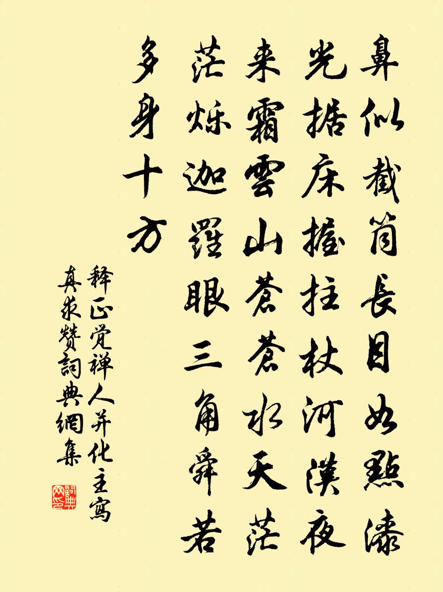 詩詞名句歷史字典書法欣賞書法字典國語詞典說文解字康熙字典古漢語字典標 題 作 者 詩 句 禪人並化主寫真求贊作者:釋正覺 朝代:宋代禪人並化主寫真求贊原文鼻似截筒長,目如點漆光。據床握拄杖,河漢夜來霜。雲山蒼蒼,水天茫茫。爍迦羅,眼三角,舜若多,身十方。詩詞問答問:禪人並化主寫真求贊的作者是誰?答:釋正覺問:禪人並化主寫真求贊寫於哪個朝代?答:宋代釋正覺禪人並化主寫真求贊書法欣賞禪人並化主寫真求贊書法作品詩詞推薦次韻趙景文見寄懷親陳著〔宋代〕薄俗滔滔逐水流,誰能古道兩綢繆。白雲終日靜相向,紫氣有時來更留。啼鳥已呼春到了,醉驢曾記舊遊不。山林挽文魁母齊魏國夫人三首鄧剡〔宋代〕客談剪髻德,鄰識斷機心。梭壁風雲早,諼春雨露深。安輿神物相,歸旐路足欽。滂母猶難比,生兒振古今。頌古四十四首釋師範〔宋代〕兀兀地思量,無可得思量。無可思量處,直個好思量。大庾嶺頭逢六祖,鰲山店上見曾郎。江行晚興陳與義〔宋代〕曾聽石樓水,今過邵州灘。一笑供舟子,五年經路難。雲間落日淡,山下東風寒。煙嶺叢花照,夕灣群鷺盤。生身又和蔡子直蘇頌〔宋代〕官局誠俱冷,交盟信不寒。風霜兩鬢白,冰櫱一心丹。未剖方州竹,猶熏畫省蘭。北宮陪論定,應似漢丁桓。明月歌姜特立〔宋代〕月在天兮保高,我居世兮何卑。高卑相去幾萬里,年年夜夜長相隨。明月入我懷,我攬明月輝。妙明中間含萬象,夏日都門送司馬員外逸客孫員外佺北征沈佺期〔唐代〕二庭追虜騎,六月動周師。廟略天人授,軍麾相國持。復言征二妙,才命重當時。畫省連征橐,橫門共別詞。雲迎次韻周邠寄《雁盪山圖》二首蘇軾〔宋代〕西湖三載與君同,馬入塵埃鶴入籠。東海獨來看出日,石橋先去踏長虹。遙知別後添華發,時向樽前說病翁。所恨題僧泰恭院二首溫庭筠〔唐代〕昔歲東林下,深公識姓名。爾來辭半偈,空復嘆勞生。憂患慕禪味,寂寥遺世情。所歸心自得,何事倦塵纓。微生題武夷馮端榮〔宋代〕花滿晴煙樹滿雲,我來寧是學仙人。願將九曲溪頭水,散作年年百里春。望江南/憶江南廖剛〔宋代〕蓬山曉,龜鶴倚芝庭。雲覆寶熏迷舞鳳,玉扶瓊液薦文星。棠蔭署風清。人盡道,天遣瑞昇平。九萬鵬程才振翼,再試茉莉二絕范成大〔宋代〕憶曾把酒泛湘漓,茉莉球邊擘荔枝。一笑相逢雙玉樹,花香如夢鬢如絲。七夕宴懸圃二首崔顥〔唐代〕長安城中月如練,家家此時持針線。仙裙玉佩空自知,天上人間不相見。長信深陰夜轉幽,瑤階金閣數螢流。班姬放姑惡喻良能〔宋代〕為憐心折骨仍驚,四十方兄博汝生。從此直須防巧中,著身未穩莫先鳴。灌園陸游〔宋代〕八十身猶健,生涯學灌園。溪風吹短褐,村雨暗衡門。眼正魔軍怖,心安疾豎奔。午窗無一事,梨棗弄諸孫。有贈余以端溪綠石枕與蘄州竹簟皆佳物也余既歐陽修〔宋代〕端溪琢出缺月樣,蘄州織成雙水紋。呼兒置枕展方簟,赤日正午天無雲。黃琉璃光綠玉潤,瑩淨冷滑無埃塵。憶昨鷓鴣天姬翼〔元代〕暮落朝開木槿榮。圓荷出水露珠傾。火雲千丈燒空際,汗雨淋漓倦鬱蒸。虛白室,誦黃庭。洒然風度有餘清。坐看【仙呂】翠裙腰纏令呂止庵〔元代〕【翠裙腰】老來多病逢秋驗,便覺嫩涼添,懶搖紈扇閒紋簟。卷朱簾,晚妝樓外月纖纖。【金盞兒】更西風釅,微送陳知錄赴班改秩陳杰〔宋代〕相看同味少,又送可人行。曉日朝天旆,春江下水程。方將有民社,何患不公卿。還憶南樓夜,論心霜月明。滿禪人畫臨濟像請贊釋曇華〔宋代〕臨濟禿,無眼目,討便宜兮不知足。高懸羊頭賣狗肉,秤頭斤兩惜如玉。胸中更有一般毒,天下無人敢輕觸。名句推薦畫船撐入花深處,香泛金卮。歐陽修《採桑子·荷花開後西湖好》 運往無淹物,年逝覺已催。謝靈運《歲暮》 江闊雲低、斷雁叫西風。蔣捷《虞美人·聽雨》 不經一番寒徹骨,怎得梅花撲鼻香。黃櫱禪師《上堂開示頌》 我是人間惆悵客,知君何事淚縱橫,斷腸聲里憶平生。納蘭性德《浣溪沙·殘雪凝輝冷畫屏》 微陽下喬木,遠色隱秋山。馬戴《落日悵望》 慟哭六軍俱縞素,衝冠一怒為紅顏。吳偉業《圓圓曲》 一別如斯,落盡梨花月又西。納蘭性德《採桑子·當時錯》 風水人間不可無,也須陰騭兩相扶。馮夢龍《醒世恆言·卷一》 漢臣曾此作縲囚,茹血衣毛十九秋。汪遵《詠北海》