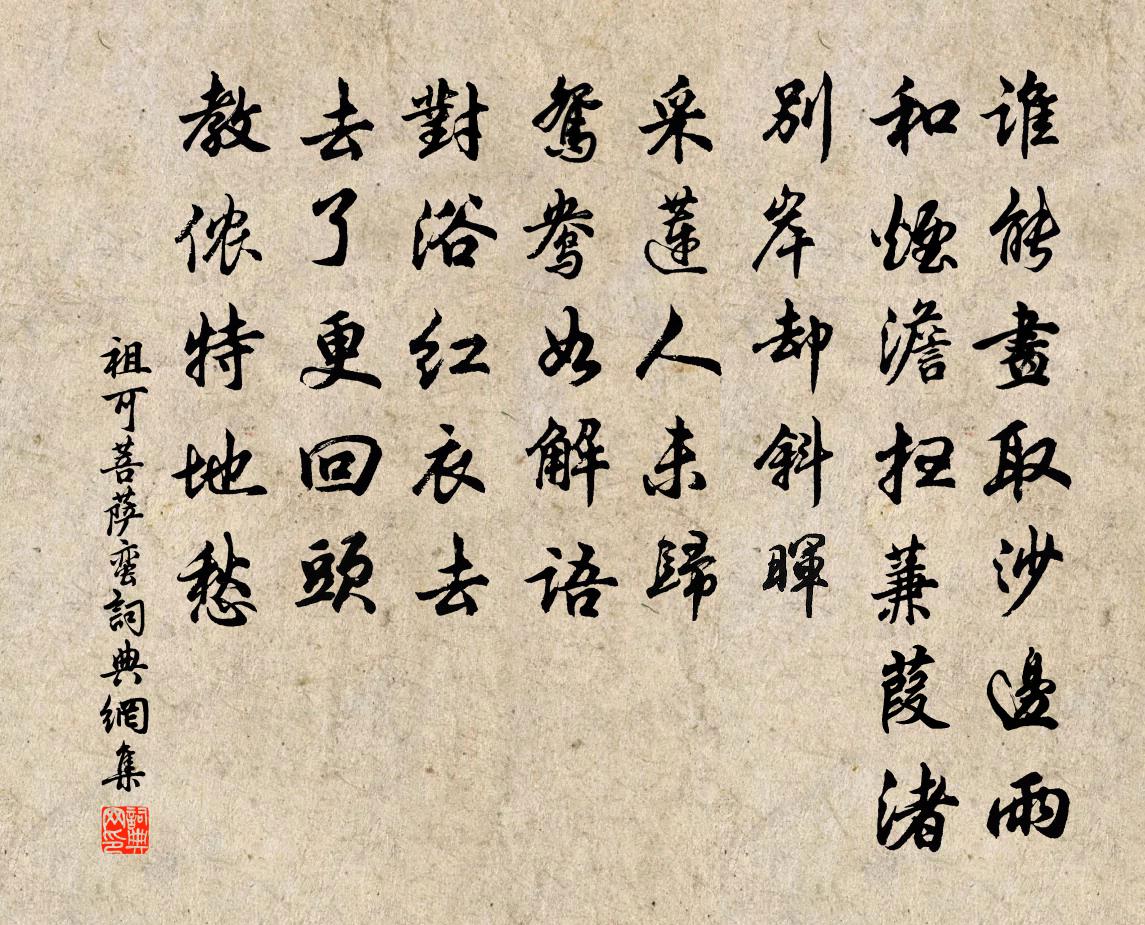 詩詞名句歷史字典書法欣賞書法字典國語詞典說文解字康熙字典古漢語字典標 題 作 者 詩 句 菩薩蠻作者:祖可 朝代:宋代菩薩蠻原文誰能畫取沙邊雨。和煙澹掃蒹葭渚。別岸卻斜暉。採蓮人未歸。鴛鴦如解語。對浴紅衣去。去了更回頭。教儂特地愁。詩詞問答問:菩薩蠻的作者是誰?答:祖可問:菩薩蠻寫於哪個朝代?答:宋代問:菩薩蠻是什麼體裁?答:詞祖可菩薩蠻書法欣賞菩薩蠻書法作品詩詞推薦王子立寄三絕句雲常詣夏頤吉卜雲宜見君子子李廌〔宋代〕久依鳳翼與龍鱗,萬里青雲可致身。聖主求賢如不及,夜光豈復怒無因。次韻和王希知縣見贈魏野〔宋代〕從前宰字絕文詞,喜遇今來並有詩。封禪榜偏推鳳藻,陶鎔筆肯轉稽遲。訟庭任靜猶忘寐,文會雖忙不後期。莫怪留別逢吉司馬光〔宋代〕君念承明臭味稀,相逢惜別重依依。會稽太守主坐嘯,東郭先生還步歸。樂飲林塘留節物,餞行里舍動光輝。雙旌沁園春 夢孚若劉克莊〔宋代〕何處相逢,登寶釵樓,訪銅雀台。喚廚人斫就,東溟鯨膾,圉人呈罷,西極龍媒。天下英雄,使君與操,餘子誰堪以坡公君如大江日千里我如此水千山底為韻作趙蕃〔宋代〕崎嶇千萬山,踏破青鞋底。何似引章泉,同耕老兄弟。念奴嬌程公許〔宋代〕然有懷,借韻作一首。曉涼散策,恨西風不貸,一池殘綠。誰與冰輪捴玉斧,恰好今宵圓足。樹杪翻光,莎庭轉影重經車輞谷司馬光〔宋代〕昔車道經車輞谷,直上七里監南皮。今年行役復到此,方春流汗如翻波。中塗太息坐盤石,涕泗不覺雙滂沱。我生沁園春(代壽直院陳文昌)李曾伯〔宋代〕今代清流,北斗以南,文昌一星。對露門進讀,鑾坡演翰,瑣闈批敕,寶牒成文。筆下權衡,胸中律度,禮樂人才婦女之孝二十首唐氏婦林同〔宋代〕姑今病且死,頗愧婦恩深。但願婦有子,皆如婦用心。阮郎歸黃庭堅〔宋代〕退紅衫子亂蜂兒。衣寬只為伊。為伊去得忒多時。教人直是疑。長睡晚,理妝遲。愁多懶畫眉。夜來算得有歸期。春日六言十二首劉克莊〔宋代〕七誡婦罕全者,四窮鰥居一焉。嗟余抱終身恨,與子結來生緣。回鄉偶書二首賀知章〔唐代〕少小離家老大回,鄉音無改鬢毛衰。(無改 一作:未改/難改)兒童相見不相識,笑問客從何處來。離別家鄉歲頌一百則釋重顯〔宋代〕頭兮第一,第二臥龍。不鑒止水,無處有月。波澄有處,無風浪起。棱禪客,棱禪客,三月禹門遭點額。奉和襲美茶具十詠。茶灶(《經》雲茶灶無突)陸龜蒙〔唐代〕無突抱輕嵐,有煙映初旭。盈鍋玉泉沸,滿甑雲芽熟。奇香襲春桂,嫩色凌秋菊。煬者若吾徒,年年看不足。寄林簿丘葵〔宋代〕一別又一載,相思入夢頻。以予拙生計,知子不為貧。鼠跡陶瓶粟,蛛絲范甑塵。莫將憔悴意,說與得時人。送梁和仲兼屬寄謝吳丈三首趙蕃〔宋代〕學詩將老竟無奇,猶有求交氣未移。臭味只知論翰墨,情親元乃與壎篪。見來草草都能幾,別去悠悠孰慰思。衢信太常引 樂府小雲張可久〔元代〕溶溶一葉不成衣。恰待弄春暉。幽懶意遲遲。只可向、山中自怡。清歌遏玉,嬌鬟*翠,纖月映蛾眉。來往且孤飛春雨熊禾〔宋代〕春來一月雨,米斗錢三千。江空盡絕市,灶冷廚無煙。我從莆城來,四望良悽然。濱海皆食淡,邏卒相尋挻。累累青玉案·弔古徐燦〔清代〕傷心誤到蕪城路,攜血淚,無揮處。半月模糊霜幾樹。紫簫低遠,翠翹明滅,隱隱羊車度。鯨波碧浸橫江鎖,故壘致仕後即事陸游〔宋代〕沉綿分已餞餘生,造物苛留未遣行。今日下床還健在,一編來就小窗明。名句推薦明君制民之產,必是仰足以事父母,俯足以畜妻子;樂歲終身飽,凶年免於死亡。孟子《孟子·梁惠王章句上·第八節》 巴子城頭青草暮。巴山重疊相逢處。張先《漁家傲·和程公辟贈》 關河底事空留客?歲月無情不貸人。于謙《立春日感懷》 遠看山有色,近聽水無聲王維《畫》 落木蕭蕭,琉璃葉下瓊葩吐。王十朋《點絳唇·素香丁香》 而天下皆曰其力也,必不能曰我見命焉。墨子《墨子·36章 非命(中)》 重岡已隔紅塵斷,村落更年豐。元好問《人月圓·重岡已隔紅塵斷》 萬里浮雲卷碧山,青天中道流孤月。李白《答王十二寒夜獨酌有懷》 風緊雁行高,無邊落木蕭蕭。納蘭性德《河瀆神·風緊雁行高》 雨晴煙晚。綠水新池滿。馮延巳《清平樂·雨晴煙晚》
