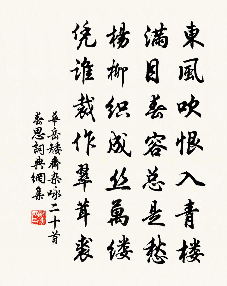 詩詞名句歷史字典書法欣賞書法字典國語詞典說文解字康熙字典古漢語字典標 題 作 者 詩 句 矮齋雜詠二十首春思作者:華岳 朝代:宋代矮齋雜詠二十首春思原文東風吹恨入青樓,滿目春容總是愁。楊柳織成絲萬縷,憑誰裁作翠茸裘。詩詞問答問:矮齋雜詠二十首春思的作者是誰?答:華岳問:矮齋雜詠二十首春思寫於哪個朝代?答:宋代華岳矮齋雜詠二十首春思書法欣賞矮齋雜詠二十首春思書法作品詩詞推薦賦葛天民栽葦葉紹翁〔宋代〕葉礙漁舟入,叢分水國寬。低回藏鷺渚,仿佛釣魚竿。盪戶和萍送,溪翁當竹看。所憐如許節,不耐雪霜寒。冬雷行洪咨夔〔宋代〕三月廿八雪,十月十九雷。日官起歷失氣朔,深春為臘冬為梅。衣巾暄淑糝白醭,研席昏濕凝青埃。階頭蠢{左月早春山中方岳〔宋代〕蘭未曾芽柳未絲,是渠春早是春遲。草塘尋見春風處,問訊如何自不知。無渡河李廌〔宋代〕無渡河,無渡河,中有龍門之雪浪,天池之洪波。上有碧崖之岌嶪,下有暗石之嵯峨。蛙蚓得志相譏訶,況復龍蜃次韻和酬永嘉聶從事除夜之什楊億〔宋代〕三百六旬今夜盡,寥寥虛室獨凝神。蓮城五鼓欲催曉,梅嶺一枝先報春。鄒律漸吹陰谷暖,堯蓂看榜土階新。海隅周五聲調曲 商調曲 三庾信〔南北朝〕禮樂既正。神人所以和。玉帛有序。志欲靜干戈。各分符瑞。俱誓裂山河。今日相樂。對酒且當歌。道德以喻。聽紗詩項安世〔宋代〕芙蕖供色更供絲,緝就沙溪水面漪。疏密整斜於雪似,香輕軟細與風宜。集堂妙得發均意,織藕新翻蜀客詞。喚作胥員外之復州景陵尉梅堯臣〔宋代〕城隅漢水闊,正足槎頭鱅。采荇兼登俎。施罛不貴錢。江帆風勢美,竹屋雨聲連。必有蒼苔碣,留為好事傳。送劉善長歸北安省親洪皓〔宋代〕九齡穎悟已驚人,乃父分茅善撫民。鄭忽身為周室質,賈生議屈漢庭臣。行攀郄桂榮三斧,暫著萊衣省二親。勿訝勸耕林采〔宋代〕釣螺江上一耕夫,誤掛簪裳計已疎。來此勸農申告誡,要渠僇力事耕鋤。田疇耒耜能無倦,禾稼收成自有餘。戶曉次韻和鄧慎思謝劉明復重畫道林秋景二首孔武仲〔宋代〕鈴齊清話未更端,一埽禪林景趣完。縹緲已裝新殿塔,縈紆仍引外峰巒。冷風有意生空闊,密雪無聲下廣寒。平昔法身頌釋曉聰〔宋代〕參禪學道莫茫茫,問透法身北斗藏。余今老倒尪羸甚,見人無力得商量。唯有钁頭知我意,栽松時復上金剛。雨後吳芾〔宋代〕朝來一雨灑炎光,陡覺園林處處涼。煙柳數行縈翠帶,風荷十里擁紅妝。莫憂鏡里朱顏改,且喜壺中白晝長。只恐金霞閣梅堯臣〔宋代〕登臨無盡興,清燕日徘徊。霞影緣觚落,嵐光入牖來。離宮分碧瓦,大液俯青槐。好待邀明月,瑤琴為一開。為釣台作程珌〔宋代〕人道秋風長桂時,天台散鍾未為遲。如君算到白榆窟,揀取南來第一枝。大晟府擬撰釋奠十四首佚名〔宋代〕庶幾屢空,淵源深矣。亞聖宣獻,百世宜祀。吉蠲斯辰,昭陳尊簋。旨酒欣欣,神其來止。太常引沈端節〔宋代〕三三五五短長亭。都只解、送人行。天遠樹冥冥。悵好夢、才成又驚。夜堂歌罷,小樓鍾斷,歸路已聞鶯。應是困九日登李明府北樓劉長卿〔唐代〕九日登高望,蒼蒼遠樹低。人煙湖草里,山翠縣樓西。霜降鴻聲切,秋深客思迷。無勞白衣酒,陶令自相攜。臨江仙許庭〔宋代〕不見灞陵原上柳,往來過盡蹄輪。朝離南楚暮西秦。不成名利,贏得鬢毛新。莫怪枝條憔悴損,一生唯苦征塵。兩河傳·春淺納蘭性德〔清代〕春淺,紅怨。掩雙環,微雨花間。畫閒,無言暗將紅淚彈。闌珊,香銷輕夢還。斜倚畫屏思往事。皆不是,空作相名句推薦小溪清水平如鏡,一葉飛來浪細生。徐璣《秋行》 西宮南內多秋草,落葉滿階紅不掃。白居易《長恨歌》 縱被無情棄,不能羞。韋莊《思帝鄉·春日游》 旅客三秋至,層城四望開。杜審言《登襄陽城》 凍臉有痕皆是血,酸心無恨亦成灰。曹雪芹《詠紅梅花得“梅”字》 目妄視則淫,耳妄聽則惑,口妄言則亂。劉安及其門客《淮南子·主術訓》 凡人之患,蔽於一曲,而闇於大理。荀子《荀子·解蔽》 樂者,所以道樂也,金石絲竹,所以道德也;樂行而民鄉方矣。荀子《荀子·樂論》 世事浮云何足問,不如高臥且加餐。王維《酌酒與裴迪》 歌中醉倒誰能恨,唱罷歸來酒未消。晏幾道《鷓鴣天·小令尊前見玉簫》