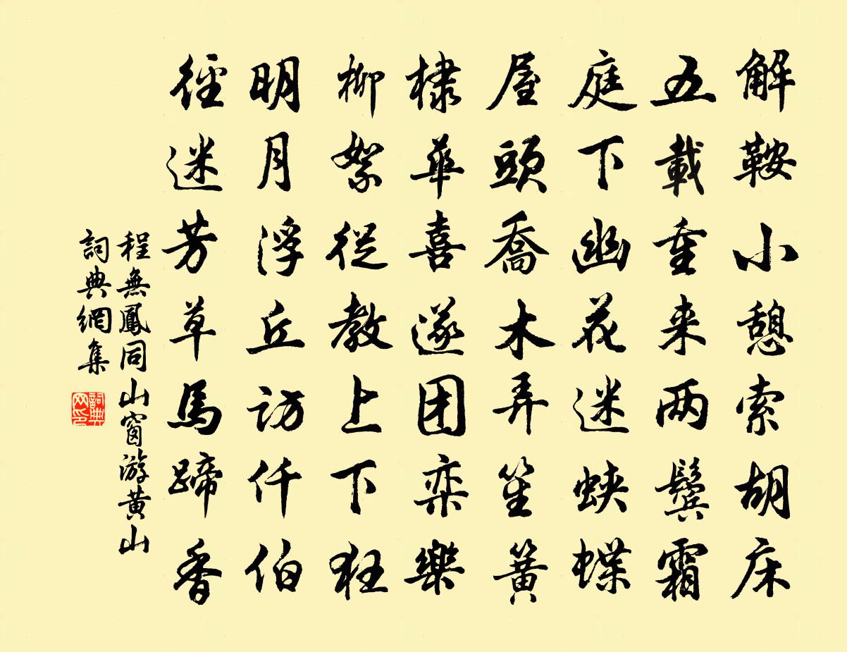 詩詞名句歷史字典書法欣賞書法字典國語詞典說文解字康熙字典古漢語字典標 題 作 者 詩 句 同山窗游黃山作者:程無鳳 朝代:宋代同山窗游黃山原文解鞍小憩索胡床,五載重來兩鬢霜。庭下幽花迷蛺蝶,屋頭喬木弄笙簧。棣華喜遂團欒樂,柳絮從教上下狂。明月浮丘訪仟伯,徑迷芳草馬蹄香。詩詞問答問:同山窗游黃山的作者是誰?答:程無鳳問:同山窗游黃山寫於哪個朝代?答:宋代程無鳳同山窗游黃山書法欣賞同山窗游黃山書法作品詩詞推薦觀月陸游〔宋代〕清風發疏林,皦月上素壁。悠然倚庭楯,愛此風月夕。人間好時節,俯仰成宿昔。少年不痛飲,老大空嘆息。何處難忘酒十首王令〔宋代〕何處難忘酒,欃槍世不平。孤兒未勝甲,孀母送為兵。氣絕心肝裂,號窮血淚橫。此時無一盞,何以活餘生。次韻和韓子華內翰於李右丞家移紅薇子種學士梅堯臣〔宋代〕紅薇花樹小扶疏,春種秋芳賞愛余。丞相舊園移帶土,侍臣清署看臨除。薄膚癢不勝輕爪,嫩乾生宜近禁廬。此地司空贈太傅康國韓公輓辭五首蘇頌〔宋代〕厚重資天粹,忠清襲世芳。周臣言諤諤,漢相貌堂堂。見象中台拆,傷時一鑒亡。罷朝仍制服,卹禮厚公王。柏舟佚名〔先秦〕泛彼柏舟,亦泛其流。耿耿不寐,如有隱憂。微我無酒,以敖以游。我心匪鑒,不可以茹。亦有兄弟,不可以據。淳化中朝會二十三首佚名〔宋代〕軒昊方同德,成康粗比肩。素風惟普暢,皇道本無偏。陰魄重輪滿,陽精五色圓。要荒鹹率服,卓越聖功全。滿庭芳俞國寶〔宋代〕南省西清,黃扉青瑣,五年歷遍中都。一封朝奏,無乃愛君歟。便作筠陽勝賞,東溪上、鷗鳥相娛。誰知道,心存香港感懷十首黃遵憲〔清代〕便積金如斗,能從聚窟消。蠻雲迷寶譬,脂夜盪花妖。龍女爭盤鏡,鮫人斗織綃。珠簾春十里,難遣可憐宵。和此陽先生感興詩二十首劉黻〔宋代〕交遊重金石,里巷毋泛尋。胸中抱明鏡,妍醜不相侵。熱交但以貌,冷交惟其心。勢利易苟合,道義難力任。詠春倚闌陸游〔宋代〕滿庭晴日破朝寒,粥罷披裘小倚欄。殘菊抱叢香欲盡,一株南燭獨如丹。與王昌齡宴王十一①孟浩然〔唐代〕歸來臥青山,常夢遊清都。漆園有傲吏,惠好在招呼。書幌神仙籙,畫屏山海圖。酌霞復對此,宛似入蓬壺。還京口殷堯藩〔唐代〕黃鶴山頭雪未消,行人歸計在今朝。城高鐵瓮江山壯,地接金陵草木凋。北府市樓聞舊酒,南橋官柳識歸橈。吏民惠墨鄭清之〔宋代〕老龍臥蒼海,千年抱明珠。神禹決淮泗,偃蹇不受驅。怒走崧岱頂,風雨撼八區。亭亭立天柱,化作青松株。蟠根送淳上人游九岩王銍〔宋代〕殘菊孤花留暮秋,勞師問路亂山頭。九岩只望孤雲去,舒捲如雲得自由。瑞上人求詩戴表元〔宋代〕寶葉山中源悟師,布衲百結面如痴。十年相憶忽在眼,談笑甚似仍耽詩。師仁再用韻復作一首李流謙〔宋代〕室中元自有天游,海內如何止九州。送老只憑書萬卷,傳家不用橘千頭。便當野服從逋客,未暇巍冠伴沐猴。一動張欽州輓詞樓鑰〔宋代〕姻好自諸馮,東床取阿戎。平時深念我,晚歲忍銘公。書字今猶濕,心期誰與同。回頭三十載,灑涕向西風。寄孫山人儲光羲〔唐代〕新林二月孤舟還,水滿清江花滿山。借問故園隱君子,時時來往住人間。第一百四十卷龍華寺傅大士真身像韓元吉〔宋代〕古寺郊丘側,鍾魚曉未喧。雙林有遺骨,瑞萼記名園。粒石嗟余飯,神槌想叩門。蠶桑猶有謁,鼓舞動山村。送宮人入道張籍〔唐代〕舊寵昭陽里,尋仙此最稀。名初出宮籍,身未稱霞衣。已別歌舞貴,長隨鸞鶴飛。中官看入洞,空駕玉輪歸。名句推薦五月五日午,贈我一枝艾。文天祥《端午即事》 秋天一夜靜無雲,斷續鴻聲到曉聞。張仲素《秋閨思二首》 城門失火,殃及池魚。司馬光《資治通鑑·梁紀·梁紀十六》 雨後雙禽來占竹,秋深一蝶下尋花。文同《北齋雨後》 天勢圍平野,河流入斷山。暢當《登鸛雀樓》 燕子銜將春色去,紗窗幾陣黃梅雨。司馬槱《黃金縷·妾本錢塘江上住》 空園白露滴,孤壁野僧鄰。馬戴《灞上秋居》 寒色孤村幕,悲風四野聞。洪升《雪望》 虢國夫人承主恩,平明騎馬入宮門。張祜《集靈台·其二》 此地朝來餞行者,翻向此中牧征馬。孟浩然《高陽池送朱二》