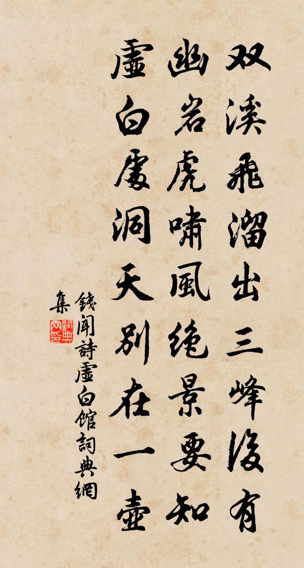 詩詞名句歷史字典書法欣賞書法字典國語詞典說文解字康熙字典古漢語字典標 題 作 者 詩 句 虛白館作者:錢聞詩 朝代:宋代虛白館原文雙溪飛溜出三峰,後有幽岩虎嘯風。絕景要知虛白處,洞天別在一壺。詩詞問答問:虛白館的作者是誰?答:錢聞詩問:虛白館寫於哪個朝代?答:宋代錢聞詩虛白館書法欣賞虛白館書法作品詩詞推薦頌證道歌證道歌釋印肅〔宋代〕依在心,殃在身,汝身非與我同真。臭爛腥臊無用處,識神沈劫墮迷津。寄陳州朱教授三首張耒〔宋代〕春雨江乾不肯晴,大江櫟岸轉雷霆。山頭方丈渾無事,掃地焚香看佛經。排悶陸游〔宋代〕棄官謂逍遙,勞苦殊未既。荒疇須墾闢,破屋久塗塈。疾深藥難求,食盡谷暴貴。安能作經營,但覺睡有味。秋高送程給事知越州何正臣〔宋代〕立京金城漳海邊,從來經制祗茫然。一千里候無宵警,十萬人家自晏眠。異域早聞回陳馬,將車從此罷樓船。功成滿江紅(劉左史光祖生日正月十日)魏了翁〔宋代〕見說新來,把閒事、都齊閣束。日用處、渾無凝滯,天機純熟。簾卷春風琴靜好,庭移曉日蘭芬馥。笑可曾,些子愛山喻良能〔宋代〕柳絲稀處見前山,半在雲間半霧間。回首亂紅濃翠里,春風啼鳥更綿蠻。導引佚名〔宋代〕鳳簫聲斷,縹緲溯丹邱。猶是憶河洲。熒煌寶冊來天上,何處訪仙遊。蔥蔥鬱郁瑞光浮。嘉酌侑芳羞。雕輿繡幰歸疏梅二首張耒〔宋代〕疏梅落寒晴,高柳暗春夕。低星上蒼寒,遠鍾韻澄寂。頗私朝市間,更得闤闠僻。且復罷經過,深泥濺馬臆。贊達磨大師釋宗元〔宋代〕十萬里來賣口嘴,宜乎打落當門齒,面壁九年誰采你。深雪之中若不得救苦救難觀世音菩薩,有甚面歸鄉里。三姝媚(次周公謹故京送別韻)王沂孫〔宋代〕蘭缸花半綻。正西窗淒淒,斷螢新雁。別久逢稀,謾相看華發,共成銷黯。總是飄零,更休賦、梨花秋苑。何況如題朱氏園張耒〔宋代〕東風邀客入芳菲,夾徑吹香李萬枝。啼鳥遠聞知晝靜,好花相續得春遲。連檣東去淮天闊,綠野南環楚澤卑。客至梁宗廟登歌 四沈約〔南北朝〕犧象既飾。罍俎斯具。我郁載馨。黃流乃注。峨峨卿士。駿奔是務。佩上鳴階。纓還拂樹。悠悠億兆。天臨日煦。春郊呂聲之〔宋代〕勝日游效外,嵐光入眼新。桃花開萬樹,又是一年人。偈頌一百二十三首釋普度〔宋代〕露滴滴,風淒淒。黃花香滿路,何獨在樂籬。高低普應,步步相隨。寄浮山遠禪師釋警玄〔宋代〕楊廣山頭草,憑君待價焞。異苗翻茂處,深密固靈根。次同叔見寄二首胡仲弓〔宋代〕歸期何日卜,雁不到天涯。謗有書盈篋,愁無地種花。吟梅銷旅況,刻竹記年華。心事憑誰說,憑欄數暝鴉。金陵雜興二百首蘇泂〔宋代〕方山四面不曾圓,中有仙人號葛玄。見說丹成渾不食,五雲破洞白升天。惜紅衣(贈伎雙波)張炎〔宋代〕兩剪秋痕,平分水影,炯然冰潔。未識新愁,眉心倩人貼。無端醉里,通一笑、柔花盈睫。痴絕。不解送情,倚銀泊江城下董嗣杲〔宋代〕雪後抵江城,江雲轉凝冱。我舟艤沙淺,煮酒御沉霧。少年繆誤多,今繆亦如故。流年無藥挽,如水必東注。失笑和惠思歲二日二絕王安石〔宋代〕懶讀書來已數年,從人嘲我腹便便。為嫌歸舍兒童聒,故就僧房借榻眠。名句推薦樂殊貴賤,禮別尊卑。周興嗣《千字文·全文》 驅馬天雨雪,軍行入高山。杜甫《前出塞九首》 啜苦咽甘,茶也。陸羽《茶經·五之煮》 今夜月明江上、酒初醒。黃庭堅《南歌子·槐綠低窗暗》 但憑闌無語,煙花三月春愁。鄭覺齊《揚州慢·瓊花》 愛之不以道,適所以害之也。司馬光《資治通鑑·晉紀十八》 白日不到處,青春恰自來。袁枚《苔》 父子之嚴,不可以狎;骨肉之愛,不可以簡。顏之推《顏氏家訓·教子篇》 候館梅殘,溪橋柳細。歐陽修《踏莎行·候館梅殘》 思來江山外,望盡煙雲生。張九齡《秋晚登樓望南江入始興郡路》