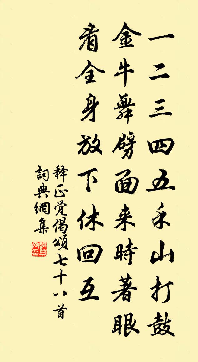 詩詞名句歷史字典書法欣賞書法字典國語詞典說文解字康熙字典古漢語字典標 題 作 者 詩 句 偈頌七十八首作者:釋正覺 朝代:宋代偈頌七十八首原文一二三四五,禾山打鼓金牛舞。劈面來時著眼看,全身放下休回互。詩詞問答問:偈頌七十八首的作者是誰?答:釋正覺問:偈頌七十八首寫於哪個朝代?答:宋代釋正覺偈頌七十八首書法欣賞偈頌七十八首書法作品詩詞推薦上後樂劉先生左史十首用襄陽詩兩句行藏堅晚程公許〔宋代〕楚都初拜公,里門跪承誨。一言忽喚醒,頓首汗浹背。志遠苦力短,寸進而盡退。大書揭齋顏,朝夕警不逮。龍丁謂〔宋代〕不操千金寶,思觀九色虯。負圖鐘上聖,銜燭照窮幽。但仰飛天大,寧聞戰野憂。沃焦須霈澤,莫道我無求。門柳釋斯植〔宋代〕看盡門前柳,愁多白髮新。灞橋風雨夜,離別是何人。句潘大臨〔宋代〕八字山頭雁,武昌江上魚。慶元二年恭上太皇太后皇太后太上皇帝太上皇佚名〔宋代〕上帝有赫,百靈效祥。儲祉垂恩,錫年降康。皇持睟溫,帝躬肅莊。三宮齊民,地久天長。感皇恩(閏上元)阮閱〔宋代〕芝檢下中天,春寒猶淺。餘閏銀蟾許重看。滿城燈火,又遍高樓深院。寶鞍催繡轂,香風軟。憔悴慢翁,蕭條古縣早過漆林渡寄萬巨李白〔唐代〕西經大藍山,南來漆林渡。水色倒空青,林煙橫積素。漏流昔吞翕,沓浪競奔注。潭落天上星,龍開水中霧。嶢岩忽蒙秀實內黃賢尉寄書期許稠至有經世之語輒晁說之〔宋代〕歲宴慕群侶,魚鳥各知息。故人音書來,憐我此時憶。忠言開靡靡,豈但問寢食。我有山耕願,久矣君已得。中道水調歌頭倪偁〔宋代〕風卷暮雲盡,鏡淨一天秋。試把鵝黃新酒,細酌散閒愁。西望群山千疊,眇眇飛鴻沒處,爽氣與俱浮。且盡尊中綠新市雜詠十首華岳〔宋代〕花箋得得寄瀛洲,約我今宵特地留。好笑花頭迷去路,綠楊無處認青樓。句方恬〔宋代〕長驅筆陣渾無礙,掃盡春蠶食葉聲。微波盪晴墩,倒影動懸壁。醉落魄張元乾〔宋代〕雲鴻影落。風吹小艇欹沙泊。津亭古木濃陰合。一枕灘聲,客睡何曾著。天涯萬里情懷惡。年華垂暮猶離索。佳人見張運使郎中周麟之〔宋代〕風度顒顒白首郎,清朝趨奏久含香。東南德望龍津闊,甲乙科名雁鄧長。使節不辭驪駕遠,卿家重見戰門光。原他病中即事三首王炎〔宋代〕附火膚革燥,遠火寒慘慘。坐臥置湯婆,稍覺兩足暖。抓搔不停手,苛癢殊未減。飲食固多忌,所幸能強飯。客至夏日言懷齊己〔唐代〕苦被流年迫,衰羸老病情。得歸青嶂死,便共白雲生。樹枿燒爐響,崖棱躡屐聲。此心人信否,魂夢自分明。秋懷閻寬〔唐代〕下帷長日盡,虛館早涼生。芳草猶未薦,如何蜻蛚鳴。秋風已振衣,客去何時歸。為問當途者,寧知心有違。桃源憶故人馬子嚴〔宋代〕幾年閒作園林主。未向梅花著語。雪後又開半樹。風遞幽香去。斷魂不為花間女。枝上青禽□訴。我是西湖處士。除夕方岳〔宋代〕梅花繞屋柳遮門,不是閭閶不是村。歸寄柴桑人自老,就荒松菊徑猶存。事關時命才何與,技止文章道未尊。燈火三次韻詠雪項安世〔宋代〕初驚簌簌響蟲書,稍覺霏霏入草廬。直是謝娘工說似,未騰歐叟不言知。相投最惜衣裾片,戀別尤憐瓦縫餘。誰見止齋曲廊初成陳傅良〔宋代〕但酒勝如水,但花勝如草。小廊曲通幽,竹椽亦良好。止齋十數間,足以便衰老。檐低遠風露,地窄易汛掃。淺溪名句推薦兒不嫌母醜,狗不嫌家貧。佚名《增廣賢文·下集》 習俗移志,安久移質。荀子《荀子·儒效》 秋已盡,日猶長,仲宣懷遠更淒涼。李清照《鷓鴣天·寒日蕭蕭上瑣窗》 北風其喈,雨雪霏霏,惠而好我,攜手同。劉向《列女傳·辯通傳·楚處莊侄》 長安一片月,萬戶搗衣聲。李白《子夜吳歌·秋歌》 樓角初銷一縷霞,淡黃楊柳暗棲鴉賀鑄《減字浣溪沙·樓角初銷一縷霞》 可憐赤壁爭雄渡,唯有蓑翁坐釣魚。杜牧《齊安郡晚秋》 窮年憂黎元,嘆息腸內熱。杜甫《自京赴奉先縣詠懷五百字 / 自京赴奉先詠懷五百字》 何人解賞西湖好,佳景無時。歐陽修《採桑子·何人解賞西湖好》 飾美於外者,必其中無所有。王永彬《圍爐夜話·第一八八則》