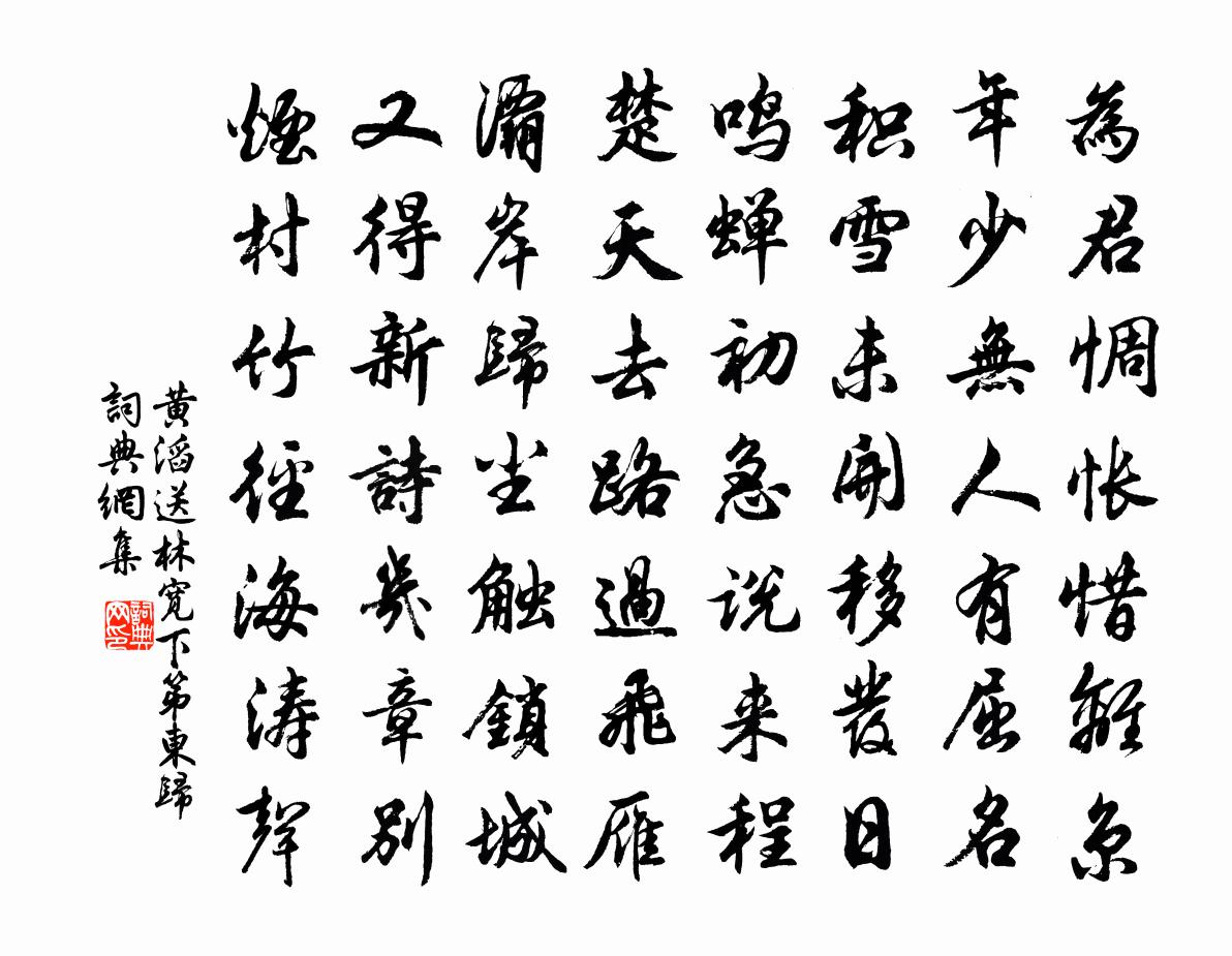詩詞名句歷史字典書法欣賞書法字典國語詞典說文解字康熙字典古漢語字典標 題 作 者 詩 句 送林寬下第東歸作者:黃滔 朝代:唐代送林寬下第東歸原文為君惆悵惜離京,年少無人有屈名。積雪未開移發日,鳴蟬初急說來程。楚天去路過飛雁,灞岸歸塵觸鎖城。又得新詩幾章別,煙村竹徑海濤聲。詩詞問答問:送林寬下第東歸的作者是誰?答:黃滔問:送林寬下第東歸寫於哪個朝代?答:唐代問:送林寬下第東歸是什麼體裁?答:七律黃滔送林寬下第東歸書法欣賞送林寬下第東歸書法作品注釋全唐詩:卷705-1詩詞推薦水調歌頭佚名〔宋代〕簫鼓闐街巷,錦繡裹山川。夜來南極,閃閃光射泰階躔。陡覺佳祥翕集,聽得閭閻笑道,蓬島降真仙。香滿琴堂里偈頌三十首釋印肅〔宋代〕臘月三十夜,髑髏自相罵。閻老索飯錢,汝等怕不怕。龜毛敲兔角,五彩虛空畫。正當恁麽時,摩尼誰著價。大年武夷有感十一首白玉蟾〔宋代〕碧雲紅樹晚相間,落日亂鴉天欲昏。人去採芝不知返,草廬空自掩柴門。朝下過盧郎中敘舊遊李白〔唐代〕君登金華省,我入銀台門。幸遇聖明主,俱承雲雨恩。復此休浣時,閒為疇昔言。卻話山海事,宛然林壑存。明湖蒲萄架楊萬里〔宋代〕才喜盤藤卷葉生,又驚壓架腤陰成。夏褰涼潤青油幕,秋摘甘寒黑水精。近竹猶爭一尺許,拋須先罷兩三莖。今年減字木蘭花(厲萬頃生日,時久旱得雨)姚述堯〔宋代〕飛龍利見。前夜君王方錫宴。時天申聖節宴後二日。今日相逢。卻向南陽起臥龍。果為霖雨。洗盡蒼生炎夏苦。喜春晚戲題姜特立〔宋代〕歲月飛騰不可回,紅顏去盡老相催。自憐皺面無光彩,賴得春負為熨開。八月七日始見白髭一莖梅堯臣〔宋代〕昔見白髭驚,今見白髭喜。人將拔去之,我獨不然耳。拔之既更生,留之何所恥。白日儻日拔,日拔詎能已。黑壯謝徐隱君屢見惠趙友直〔宋代〕慷慨論交日,情深即故知。金蘭敦古道,松柏挺奇姿。屢辱分嘉惠,何繇致我私。臨風無限思,搔首一嗟咨。水仙子·懷古張可久〔元代〕秋風遠塞皂雕旗,明月高台金鳳懷。紅妝肯為蒼生計,女妖嬈能有幾?兩蛾眉千古光輝:漢和番昭君去,越吞吳西南湖春泛有客自北至說友人岑元…敘相思之志以寄焉皎然〔唐代〕故人隔楚水,日夕望芳洲。春草思眇眇,征雲暮悠悠。心期無形影,跡曠成阻修。有客江上至,知君佐雄州。鏗鏘金鳳花董嗣杲〔宋代〕花仙五色自迎逢,翅翼翔霞濕翠籠。嬌萃九苞攢露萼,秀離丹穴舞秋風。埋叢還繞蕭台勝,絢彩應懷舜殿空。曾見客題青龍寺門佚名〔唐代〕龕龍去東海,時日隱西斜。敬文今不在,碎石入流沙。漫興 十四王冕〔元代〕深秋天氣好,且喜病魔消。對客論三史,令人愧六朝。山河空板蕩,民物競蕭條。白首思無策,甘心學野樵。滿庭芳戴復古〔宋代〕赤壁磯頭,臨皋亭下,扁舟兩度經過。江山如畫,風月奈愁何。三國英雄安在,而今但、一目煙波。風流處,竹樓謝贇闍梨見訪陳師道〔宋代〕好在談經老上人,衝風踏雪到江濱。百篇出篋自新得,一鉢隨身依舊貧。終歲杜門逃俗士,為師設榻對修筠。 * 寄季申陳與義〔宋代〕雨歇城南泥未乾,遙知獨立整衣冠。舊時鄴下劉公幹,今日遼東管幼安。綠陰展盡身猶遠,黃鳥飛來節已闌。安得阮郎歸·紹興乙卯大雪行鄱陽道中向子諲〔宋代〕江南江北雪漫漫,遙知易水寒。同雲深處望三關,斷腸山又山。天可老,海能翻,消除此恨難。頻聞遣使問平安,和顏長官百詠空門朱繼芳〔宋代〕人居天地一樊籠,持掌山家四壁空。不道今年空得盡,且無譽鼠到山中。寄匡山大願和尚貫休〔唐代〕一聽玄音下竹亭,卻思窗雪與囊螢。只將清淨酬恩德,敢信文章有性靈。夢歷山床聞鶴語,吟思海月上沙汀。不堪名句推薦善化不足,惡化有餘。佚名《增廣賢文·上集》 力田已告成,計日宜收藏。黃燮清《秋日田家雜詠》 君子泰而不驕,小人驕而不泰。孔子弟子《論語·子路篇》 蕪然蕙草暮,颯爾涼風吹。李白《秋思》 奈何今之人,雙目送飛鴻。李白《鞠歌行》 惟上惟己,去表求實,奸者自見矣。來俊臣《羅織經·察奸卷第八》 精誠所加,金石為開。范曄《後漢書·列傳·光武十王列傳》 心既托聲於言,言亦寄形於字劉勰《文心雕龍·練字》 雲收雨過波添,樓高水冷瓜甜,綠樹陰垂畫檐。白樸《天淨沙·夏》 雨後寒輕,風前香軟,春在梨花。仲殊《柳梢青·吳中》