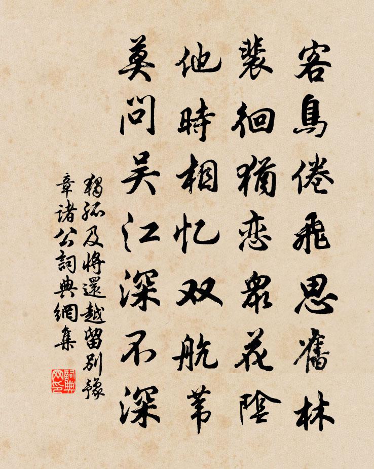 詩詞名句歷史字典書法欣賞書法字典國語詞典說文解字康熙字典古漢語字典標 題 作 者 詩 句 將還越留別豫章諸公作者:獨孤及 朝代:唐代將還越留別豫章諸公原文客鳥倦飛思舊林,裴徊猶戀眾花陰。他時相憶雙航葦,莫問吳江深不深。詩詞問答問:將還越留別豫章諸公的作者是誰?答:獨孤及問:將還越留別豫章諸公寫於哪個朝代?答:唐代問:將還越留別豫章諸公是什麼體裁?答:七絕獨孤及將還越留別豫章諸公書法欣賞將還越留別豫章諸公書法作品注釋全唐詩:卷247_50詩詞推薦六州佚名〔宋代〕承皇統,天地洽清寧。熙帝載,建民極,百度推明。崇讓肄、博考儒經。游豫騰謠誦,星蹕天行。留紺宇、順拜金臨安北山大佛頭頌甄龍友〔宋代〕色如黃金,面如滿月。盡大地人,只見一橛。涪州汪元量〔宋代〕曉立驗檣烏,時聞鳥獸呼。斯須風力健,遮莫水程迂。赤岩石稠疊,白鹽山獨孤。眼前猶有險,不盡更危途。登大明寺塔宋庠〔宋代〕故歲搖落時,憑高望揚越。流光不我與,復此值凋節。孤塔踞層岡,仙盤湧漻泬。病足攀危梯,寸晷或三歇。浩蕩句張良臣〔宋代〕客向愁中都老盡,只留平楚伴銷凝。貽蜀五首病馬詩寄上李尚書元稹〔唐代〕萬里長鳴望蜀門,病身猶帶舊瘡痕。遙看雲路心空在,久服鹽車力漸煩。尚有高懸雙鏡眼,何由並駕兩朱轓。唯應句任逢〔宋代〕縱無渭水周家望,合有嚴陵漢室光。夏夜懷趙靈秀徐璣〔宋代〕古郡草為城,懷賢隔此扃。水風涼遠樹,河影動疏星。江國晴獨潤,煙林暮轉青。荷鋤曾有約,獨喜帶騷經。校官廳新栽岩桂喻良能〔宋代〕不將官舍等逆旅,故把霜根栽繞牆。他日花開映秋色,何人手摺惹天香。丁寧護取森森碧,想像勻排粟粟黃。顧我越山釋智愚〔宋代〕翠螺簇簇繞湖濱,寒影清磨古鑒塵。休問岡頭望夫石,人間恐有斷腸人。漳南十詠南溪蔡襄〔宋代〕近郭溪光綠好裁,雨晴波底敞樓台。蔭堤佳樹千圍合,掠水輕一舟一箭開。驚釣寒魚拖糝去,忘機閒鳥信潮回。官英宗皇帝輓詞五首王珪〔唐代〕一夜催仙杖,悲聲到九宸。玉階猶報曉,金殿不知春。碧海無來使,青宮有舊臣。華封曾未幸,應誤祝堯人。見馬奉先寧祖詩於伯言處題其後趙蕃〔宋代〕聞說湘中馬奉先,數詩初喜見流傳。何處家州勿多薄,金華曾識老詩仙。臨濟大師贊釋如珙〔宋代〕得馬祖百丈黃檗之旨,發自己胸中本有底光明。見僧入門便喝,謂之臨濟一宗。三世諸佛構不著,狸奴白牯鬼不著天聲館張鎡〔宋代〕鸞鶴紛來下,天風駕月明。語言難道斷,不墮世間聲。題圓通院趙蕃〔宋代〕吾家舊築爐峰宅,豈不懷歸困轉蓬。奔走微官遍林谷,卻尋清磬到圓通。又中秋分韻得處字高斯得〔宋代〕西風滌殘{俟左換火},秋水靜如濾。客心悲未央,感茲年芳去。聊攜池上酌,相與豁煩慮。我餚楚以陳,曾未舉郊廟歌辭。武后享清廟樂章十首。第四迎神佚名〔唐代〕敬奠蘋藻,式罄虔襟。潔誠斯展,佇降靈歆。蠹魚蒲壽宬〔宋代〕種芸豈辟蠹,無水乃有魚。平生破萬卷,胸次藏石渠。何如葉上蟲,篆出先秦書。和答北山劉克莊〔宋代〕北山當代文章祖,孔思周情幸未泯。弟子力疲心尚在,先生齒宿意逾新。今無斬鼻成風手,古有埋腰立雪人。不向名句推薦論山水,則循聲而得貌;言節侯,則披文而見時。劉勰《文心雕龍·辨騷》 千古興亡多少事?悠悠。辛棄疾《南鄉子·登京口北固亭有懷》 好去不須頻下淚,老僧相伴有煙霞。金地藏《送童子下山》 柴門聞犬吠,風雪夜歸人。劉長卿《逢雪宿芙蓉山主人》 山光悅鳥性,潭影空人心。常建《題破山寺後禪院》 秋空明月懸,光彩露沾濕。孟浩然《秋宵月下有懷》 河水縈帶,群山糾紛。李華《弔古戰場文》 秋聲萬戶竹,寒色五陵松。李頎《望秦川》 潦倒不通世務,愚頑怕讀文章。曹雪芹《紅樓夢·第三回》 臨難不顧生,身死魂飛揚阮籍《詠懷其五十三》