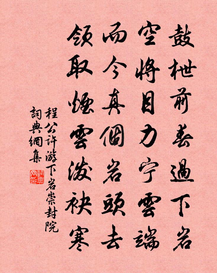 詩詞名句歷史字典書法欣賞書法字典國語詞典說文解字康熙字典古漢語字典標 題 作 者 詩 句 游下岩崇封院作者:程公許 朝代:宋代游下岩崇封院原文鼓枻前春過下岩,空將目力寧雲端。而今真箇岩頭去,領取煙雲潑袂寒。詩詞問答問:游下岩崇封院的作者是誰?答:程公許問:游下岩崇封院寫於哪個朝代?答:宋代程公許游下岩崇封院書法欣賞游下岩崇封院書法作品詩詞推薦紹興十年發皇太后冊寶八首佚名〔宋代〕景祚有開,符三婚昊。誕毓聖神,是崇位號。星拱天隋,祗嚴冊寶。還御慈寧,增光舜道。次韻答幽蘭蘇轍〔宋代〕幽花耿耿意羞春,紉佩何人香滿身。一寸芳心須自保,長松百尺有為薪。春日即事姚勉〔宋代〕梁燕無聲半掩關,晝長人靜覺春閒。閒中卻有農歌起,聲在晴煙綠處山。挽晁恭道侍郎二首曾幾〔宋代〕家令西京傑,文元聖世賢。大參名更重,學士集爭傳。此道長回首,惟公早比肩。嗚呼百年半,齎志遂沈泉。寄石湫童知縣釋正覺〔宋代〕溪頭茅屋遠追陶,斗米而今懶折腰。漢水丈人甘抱瓮,箕山居士厭鳴瓢。心秋霽月夜相照,鬢雪溫風吹不消。身世爇心香 繼重陽韻 重陽分梨十化集卷上馬鈺〔元代〕仙侶王風。來化扶風。啟虔誠、特顯家風。出這主夢,跨鶴乘風。要馬風風,風取信,便隨風。見景投風。藉甚儒鵲橋仙 喜雨劉因〔元代〕紇乾生處。幾時飛去。欲去被天留住。野人得飽更無求,看滿意、一犁春雨。田家作苦。濁醪釀黍。準備歲時歌舞贛守張子智舍人寄詩送酒,和韻謝之楊萬里〔宋代〕誰言天上張公子,飛下崆峒看曉晴。為愛東坡題八境,卻同嚴助厭承明。詩來風雨荒涼後,語帶江山紫翠橫。更遣與倪老伯輝九曲池有懷元龍參寥秦觀〔宋代〕雲月娟娟淮海秋,隋家池上共浮游。可憐一段風流事,特欠支郎與子猷。自詠梅堯臣〔宋代〕閉戶無還往,端居廢禮容。花為貧富焰,燕是舊過從。持屐對人蠟,綻衣看婦縫。非同叔夜傲,切莫怪疏慵。岳祠高明〔元代〕莫向中原嘆黍離,英雄生死系安危。內庭忽下班師詔,絕漠全收大將旗。父子一門甘仗節,山河千里竟分支。孤臣憩連嶺店楊萬里〔宋代〕此館初明眼,前山正接眉。熱嫌連日甚,涼惜兩朝遲。雨竹何其重,風鷗不自持。庭闈猶百里,早已豁愁思。散關宋祁〔宋代〕磴道何盤盤,百步人一憩。弭節高山顛,關存不置吏。昔緣暴客須,今為有道廢。詠史下諸葛孔明八首陳普〔宋代〕面黑頭黃味似飴,孔明伐賊妾蠶機。生前桑拓八百樹,死後甘棠四十圍。閩人謠佚名〔唐代〕風吹楊菜鼓山下,不得錢郎戈不罷。禪人寫真求贊釋正覺〔宋代〕閒兮無寄,用也不痕。月雖能現影,雲自不生根。活卓卓諸塵莫混,明歷歷曠劫長存。相隨鬧市堆中去,普光三昧爇心香 贈華亭張大悟馬鈺〔元代〕大悟之人,能放心閒。棄利名、愛海恩山。食無求飽,居不求安。更不狂思,不下忽,不高攀。協氣橫橫,苦霞珊清平樂(檢校山園書所見)辛棄疾〔宋代〕斷崖修竹。竹里藏冰玉。路繞清溪三百曲。香滿黃昏雪屋。行人系馬疏籬。折殘猶有高枝。留得東風數點,只緣嬌減字木蘭花佚名〔宋代〕庭梅初綻。風遞幽香清更遠。別有孤根。不待陽和一點恩。雪中風韻。皓質冰姿真瑩靜。月下精神。來到窗前疑是喜劉伯宣尚書至五首方回〔宋代〕聞說尚書至,歡聲沸道傍。饑民應復飽,暑氣頓成涼。此老今能幾,吾徒尚有望。略容對談麈,小緩理歸航。名句推薦綠葉漸成陰,下有遊人歸路。王安石《傷春怨·雨打江南樹》 今又重陽,戰地黃花分外香。 * 《採桑子·重陽》 古台搖落後,秋日望鄉心。劉長卿《秋日登吳公台上寺遠眺》 北極懷明主,南溟作逐臣。宋之問《途中寒食題黃梅臨江驛寄崔融》 不知則問,不能則學,雖能必讓,然後為德。荀子《荀子·非十二子》 鐵馬紅旗寒日暮,使君猶寄邊城。周紫芝《臨江仙·送光州曾使君》 我自中宵成轉側,忍聽湘弦重理。納蘭性德《金縷曲·亡婦忌日有感》 花開不並百花叢,獨立疏籬趣未窮。鄭思肖《畫菊》 迴廊遠砌生秋草,夢魂千里青門道。馮延巳《菩薩蠻·迴廊遠砌生秋草》 漠漠輕寒上小樓,曉陰無賴似窮秋。淡煙流水畫屏幽秦觀《浣溪沙·漠漠輕寒上小樓》