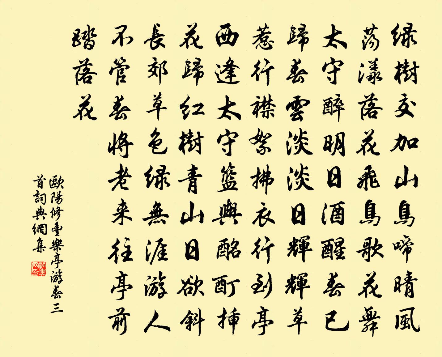 綜觀三詩,都是前兩句寫景,後兩句抒情。寫景,鮮艷斑斕,多姿多彩;抒情,明朗活潑而又含意深厚。三詩的結句都是情致 * ,餘音裊裊。歐陽修深於情,他的古文也是以陰柔勝,具一唱三嘆之致。如果結合他的散文名作《醉翁亭記》和《豐樂亭記》來欣賞這組詩,更能相映成趣。