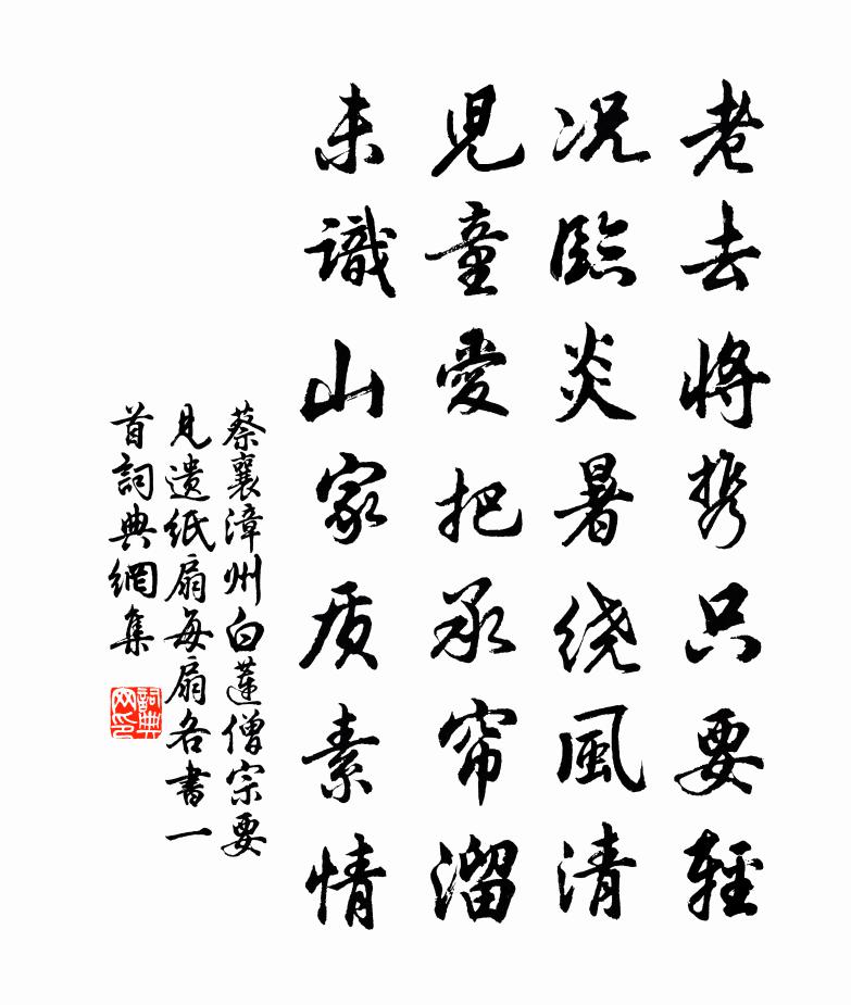 詩詞名句歷史字典書法欣賞書法字典國語詞典說文解字康熙字典古漢語字典標 題 作 者 詩 句 漳州白蓮僧宗要見遺紙扇每扇各書一首作者:蔡襄 朝代:宋代原文老去將攜只要輕,況臨炎暑繞風清。兒童愛把承簾溜,未識山家質素情。詩詞問答問:《漳州白蓮僧宗要見遺紙扇每扇各書一首》的作者是誰?答:蔡襄問:該詩寫於哪個朝代?答:宋代書法欣賞漳州白蓮僧宗要見遺紙扇每扇各書一首書法作品詩詞推薦鳳李商隱〔唐代〕萬里峰巒歸路迷,未判容彩借山雞。新春定有將雛樂,阿閣華池兩處棲。題石魚蹇材望〔宋代〕何代潛鱗翠琰鐫,雙雙依藻更依蓮。夢符端報屢豐兆,物盛宜歌大有年。玉燭調和從可卜,金刀題詠又開先。渾如六言陸游〔宋代〕香菸觸簾不散,燈焰無風自搖。獨倚 * 寂寂,忽聞山雨蕭蕭。一井金佚名〔宋代〕綠陰清書。兩茸茸、梅子黃時候。華堂金獸。香潤爐煙透。舞茵回輕袖。歌鳳翻新奏。院靜人稀,永日遲遲花漏。寄題沙溪寶錫院歐陽修〔宋代〕為愛江西物物佳,作詩嘗向北人夸。青林霜日換楓葉,白水秋風吹稻花。釀酒烹雞留醉客,鳴機織薴遍山家。野僧美人圖唐寅〔明代〕舞罷霓裳日色低,滿身春倦眼迷離。錦絲步帳繁花里,閒弄珊瑚血色枝。岩桂華岳〔宋代〕西風吹老碧蓮房,萬壑風流拆麝囊。謾與籬花爭曉色,肯都盆蕙壓秋芳。月中有女曾分種,世上無花敢斗香。要識黃魯直先王賜帖贊岳珂〔宋代〕賜帖不知其幾,而今猶其一。四印之錯出,百年之湮鬱,神呵鬼護,見此遺物。嗚呼,經固先德之所寓,而匪止於秦州雜詩二十首·其九杜甫〔唐代〕今日明人眼,臨池好驛亭。叢篁低地碧,高柳半天青。稠疊多幽事,喧呼閱使星。老夫如有此,不異在郊坰。溪行即事靈一〔唐代〕近夜山更碧,入林溪轉清。不知伏牛事,潭洞何從橫。野岸煙初合,平湖月未生。孤舟屢失道,但聽秋泉聲。踏莎行張燾〔宋代〕陽復寒根,氣回枯桿。前村昨夜梅初綻。誰言造化沒偏頗,半開何獨南枝暖。素艷幽輕,清香遠散。雪中豈恨和羹江南五首劉克莊〔宋代〕宣勸猶疑鴆,龍顏笑引觴。絡鞍奉明主,執梃長降王。卜運算元石孝友〔宋代〕折得月中枝,坐惜青春老。及至歸來能幾時,又踏關山道。滿眼秋光好。相見應須早。若趁重陽不到家,只怕黃花古梅行王柏〔宋代〕蒼龍蟄大澤,浩莫知歲華。不肯作霖雨,偃蹇眠煙霞。玉皇欲強起,六丁下谽谺。紫蛇掣金電,霹靂轉香車。振鬣送馮貫道赴行在二首馮時行〔宋代〕路入丹霄起柂初,峽山晴色曙煙疏。海深南斗臨天闊,江合西川直帝居。禁漏深寒參佩玉,御爐香暖散衣裾。遙知登立魚峰覃慶元〔宋代〕載酒聽鶯語,春風到處吹,魚峰如有約,蠟屐正相宜。鷓鴣天劉仲尹〔元代〕滿樹西風鎖建章。官黃未里貢前霜。誰能載酒陪花使,終日尋香過苑牆。修月客,弄雲娘。三吳清興入淋浪。草堂壽趙泉使楊簡〔宋代〕來迎父老喜相扶,才大能令惠愛孚。十道山川新約束,三樓風月舊規模。岩岩氣貌逾嵩華,坦坦胸襟有典謨。仰止又和春遊韓維〔宋代〕青春之來漫無蹤,但見佳氣流融融,天地百物和風中。輕雷殷出草根綠,丹霞散作枝上紅。鳴蜂喧空蝶撲地,似與梅花十絕追和張文潛韻王之道〔宋代〕竹外山前見嫩黃,水沉清漬雪肌香。應嫌桃李風姿俗,故作尋常淡淡妝。名句推薦仁者如射,射者正己而後發。發而不中,不怨勝己者,反求諸己而已矣。孟子《孟子·公孫丑章句上·第七節》 流星透疏木,走月逆行雲。賈島《宿山寺》 蟬鳴空桑林,八月蕭關道。王昌齡《塞下曲四首》 滄海月明珠有淚,藍田日暖玉生煙。李商隱《錦瑟》 積雪覆平皋,飢鷹捉寒兔。孟浩然《南歸阻雪》 高岸為谷,深谷為陵。佚名《十月之交》 二月黃鶯飛上林,春城紫禁曉陰陰。錢起《贈闕下裴舍人》 淑氣催黃鳥,晴光轉綠蘋。杜審言《和晉陵陸丞早春遊望》 明主之道,必明於公私之分韓非及後人《韓非子·飾邪》 柳下桃蹊,亂分春色到人家。秦觀《望海潮·洛陽懷古》