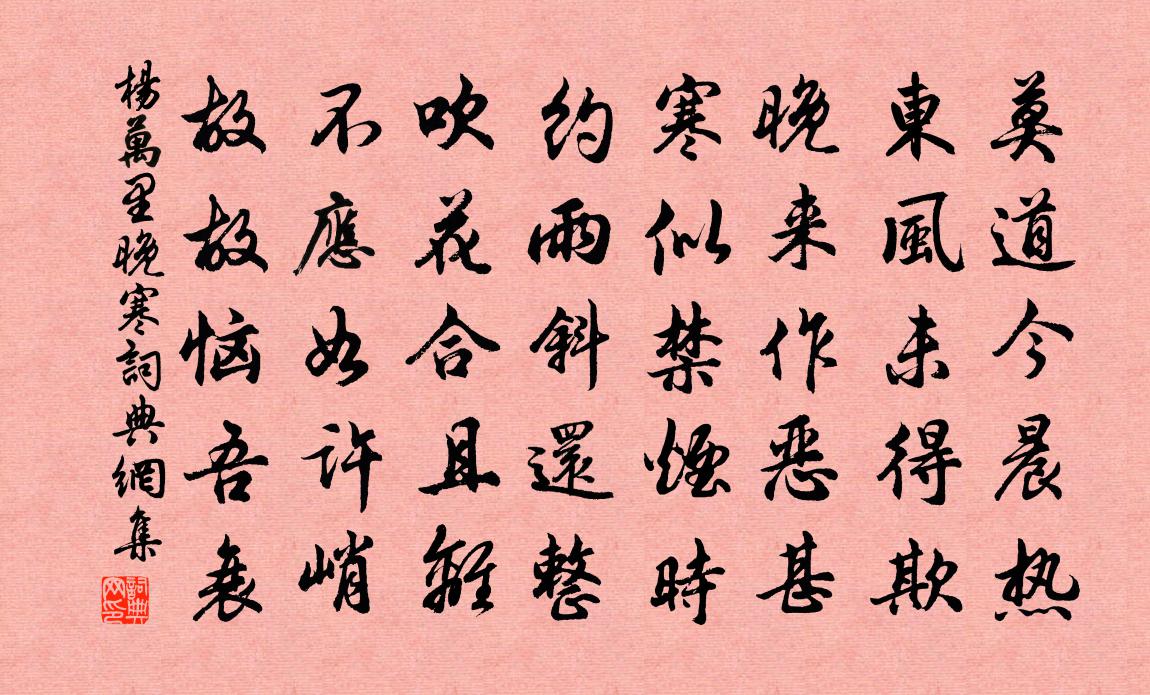 詩詞名句歷史字典書法欣賞書法字典國語詞典說文解字康熙字典古漢語字典標 題 作 者 詩 句 晚寒作者:楊萬里 朝代:宋代晚寒原文莫道今晨熱,東風未得欺。晚來作惡甚,寒似禁菸時。約雨斜還整,吹花合且離。不應如許峭,故故惱吾衰。詩詞問答問:晚寒的作者是誰?答:楊萬里問:晚寒寫於哪個朝代?答:宋代問:楊萬里的名句有哪些?答:楊萬里名句大全楊萬里晚寒書法欣賞晚寒書法作品詩詞推薦尋石瓮寺上方賈島〔唐代〕野寺入時春雪後,崎嶇得到此房前。老僧不出迎朝客,已住上方三十年。吳仲權相別詩云欲少留桃川山中昨日同在伯懷趙蕃〔宋代〕詩卷方欣見管斑,酒杯已復動離顏。余當火傘朱冠際,君政清虛爽氣間。逸興飄飄難並駕,好風發發待吹還。如舟夜宴左氏莊杜甫〔唐代〕林風纖月落,衣露淨琴張。暗水流花徑,春星帶草堂。檢書燒燭短,看劍引杯長。詩罷聞吳詠,扁舟意不忘。越州趙公救災記曾鞏〔宋代〕熙寧八年夏,吳越大旱。九月,資政殿大學士知越州趙公,前民之未飢,為書問屬縣災所被者幾鄉,民能自食者有春晚風雨中作陸游〔宋代〕箕踞藜床岸幅巾,何妨病酒住湖濱。駕風浪作連三日,掃地花空又一春。樂事清宵當秉燭,畏途平地有摧輪。頹然偈頌一百零一首釋慧性〔宋代〕久雨不晴,才明又雨。陰陽交泰,萬物得所。明明百草頭,能為萬象主。覿面相呈,切忌莽鹵。草陳景沂〔宋代〕未破滁陽亭屢易,亭亡今又幾經年。峰迴路轉勢不改,木秀陰繁直到巔。流下山泉音若咽,燒余寺刻塊如拳。柴王太白興禪師贊釋智遇〔宋代〕泯跡深藏一塢雲,仙官何事苦相親。修行不是無靈驗,懶作關門閒戶人。次韻沈若院見贈項安世〔宋代〕三載鳴弦宓不齊,姓名飛動玉宸知。從來蘭省絲綸署,夢入梔林草木詩。我亦放言聊爾耳,君真施手事於斯。為寮微招(梅)佚名〔宋代〕翠壺浸雪明遙夜,初疑玉虬飛動。莫弄紫簫吹,墜寒瓊驚夢。把紅爐對擁。怕清魄、不禁霜重。愛護殷勤,待長留菩薩蠻(次杜叔高韻)黃機〔宋代〕惜山不厭山行遠。山中禽鳥頻驚見。小雨似憐春。霏霏容易晴。青裙田舍婦。饁餉前村去。溪水想平腰。喚船依斷朱買臣徐鈞〔宋代〕長歌負擔久棲棲,一旦高車守會稽。衣錦還鄉成底事,只將富遺耀前妻。趙開府儀國公輓詞戴栩〔宋代〕西湖曾伴玉堂仙,我亦陪登李郭船。便有薦書如舊識,剩懷此意忽重泉。西風引旐笳吹咽,東國疏封寶冊鮮。如此山居歸來恰一年有感吳芾〔宋代〕去歲茲辰始息肩,俄然日月已周天。經營小隱雖雲畢,栽種清陰苦未圓。湖畔百年多古木,山前一望足平川。從嗟浣溪沙姚述堯〔宋代〕乳酒初頒菊正黃。去年高宴近清光。朝回猶帶御爐香。暫向花封陪客醉,已聞芝檢促歸裝。昌黎寧許到潮陽。長相思韓疁〔宋代〕夜蕭蕭。夢蕭蕭。又趁楊花到謝橋。鳳沈明月簫。來迢迢。枉把吟箋寄寂寥。飛鴻不受招。洪士龍以洪舜俞考功所作竹洲精舍記見問魏了翁〔宋代〕考功記竹洲,所業在淇奧。謂學與自修,此何取於竹。士龍來諗余,試請言其目。天地之大端,松篁受命獨。陰陽賢者之孝二百四十首二王林同〔宋代〕要以孝行取,寧將學業論。錫無慚玉友,銓可謂金昆。頌古三十九首釋道樞〔宋代〕新年佛法答雲無,會得依前在半途。誰把扁舟清夜笛,月明吹過洞庭湖。興化縣劉克莊〔宋代〕繞縣百千峰,初疑路不通。居民猶太古,令尹似春風。箏遠呼難至,杯寒吸易空。卻從歸路望,飛榭半天中。名句推薦背燈和月就花陰,已是十年蹤跡十年心。納蘭性德《虞美人·銀床淅瀝青梧老》 若有知音見采,不辭遍唱陽春。晏殊《山亭柳·贈歌者》 笑指吾廬何處是?一池荷葉小橋橫。陳繼儒《浣溪沙·初夏夜飲歸》 凡人之患,蔽於一曲,而闇於大理。荀子《荀子·解蔽》 以不忍人之心,行不忍人之政,治天下可運之掌上。孟子《孟子·公孫丑章句上·第六節》 永夜角聲悲自語,客心愁破正思家。汪元量《望江南·幽州九日》 清娥畫扇中,春樹鬱金紅。溫庭筠《清明日》 君子動而世為天下道,行而世為天下法,言而世為天下則。子思《中庸·第二十九章》 盡無言、閒品秦箏,淚滿參差雁呂渭老《薄倖·青樓春晚》 那裡有鬧紅塵香車寶馬?祗不過送黃昏古木寒鴉。王磐《古蟾宮·元宵》