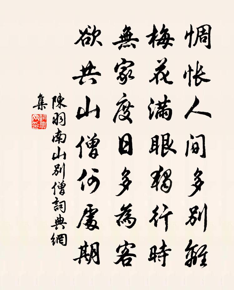 詩詞名句歷史字典書法欣賞書法字典國語詞典說文解字康熙字典古漢語字典標 題 作 者 詩 句 南山別僧作者:陳羽 朝代:唐代南山別僧原文惆悵人間多別離,梅花滿眼獨行時。無家度日多為客,欲共山僧何處期。詩詞問答問:南山別僧的作者是誰?答:陳羽問:南山別僧寫於哪個朝代?答:唐代問:南山別僧是什麼體裁?答:七絕陳羽南山別僧書法欣賞南山別僧書法作品注釋全唐詩:卷348-33詩詞推薦招同官游東園王安石〔宋代〕青青石上櫱,霜至亦已凋。冉冉水中蒲,爾生信無聊。感此歲雲晚,欲歡念誰邀。嘉我二三子,為回東城鑣。幽菊宮詞楊皇后〔宋代〕擊鞠由來豈作嬉,不忘鞍馬是神機。牽韁絕尾施新巧,背打星毬一點飛。層樓晚眺薩都剌〔元代〕廣寒世界夜迢迢,醉拍闌乾酒易消。河漢入樓天不夜,江風吹月海初潮。光搖翠幕金蓮炬,夢斷涼雲碧玉簫。休唱金陵雜興二百首蘇泂〔宋代〕江鷗野鴨自保社,黑黑白白斗分明。東邊唼唼西邊舞,安得吾身似汝輕。謝書李商隱〔唐代〕微意何曾有一毫,空攜筆硯奉龍韜。自蒙半夜傳衣後,不羨王祥得佩刀。和俞仲素太博游茅山二首馬上初望茅峰蘇頌〔宋代〕三士隱淪地,上林句曲前。朅來思訪道,屬望賦遊仙。松引飛輪路,雲收積玉巔。華陽不知遠,趣駕似行天。豐歲陸游〔宋代〕豊歲驩聲動四鄰,深秋景氣粲如春。羊腔酒擔爭迎婦,鼉鼓龍船共賽神。處處喜晴過甲子,家家築屋趁庚申。老翁興龍節侍宴前一日微雪與子由同訪王定國小飲蘇軾〔宋代〕醒各賦一篇明日朝中以示定國也天風淅淅飛玉沙,詔恩歸沐休早衙。遙知清虛堂里雪,正似薝蔔林中花。出門自笑鵲橋仙姬翼〔元代〕瓊分石碎。珠離蚌壞。文豹豐狐自害。眾中誰肯密藏身,但鼓髻、爭頭要賣。誇功即退。成名即敗。鏡里朱顏不再黃西有以清江李侯書來袁見招不果就既去西有趙文〔宋代〕地僻谷自淳,此世有羲軒。行攜二三子,讀書秋樹根。不擬山水窟,忽枉君侯轓。攜持貴人意,仆口不憚煩。居然暇日邀王天任諸公游南坡天任有詩因次韻虞儔〔宋代〕我詩苦艱澁,蹇步太行巔。筆乾硯欲裂,何地覓湧泉。巧匠愧傍觀,袖手不能前。敝帚徒自珍,捧心豈成妍。辟舍定風波(再和前韻藥名)辛棄疾〔宋代〕仄月高寒水石鄉。倚空青碧對禪床。白髮自憐心似鐵。風月。使君子細與平章。已判生涯筇竹杖。來往。卻慚沙鳥次韻秉國種菊於石〔宋代〕淵明令彭澤,自謂歸來好。外物一無累,剛被菊花惱。東籬興悠然,一醉舒懷抱。陶沒已千載,愛菊人何少。誰能和買盆池蓮趙希逢〔宋代〕終日歡陪解語蓮,浮花欲比價相千。不須更買盆池景,寂寞無言涴眼前。思歸二首戴復古〔宋代〕老矣歸歟東海村,長裾不復上王門。肉糜豈勝魚羹飯,紈袴何如犢鼻褌。是處江山如送客,故園桐竹已生孫。分無六月禱衍山劍鐔得雨陳宓〔宋代〕自昔山川致雲雨,我今壇築為焚香。三回應禱皆如響,始驗吾儒道術長。別離情所鍾十二章章四句送定叟弟之官嚴陵張栻〔宋代〕自昔謹交際,人情易因循。敬始以念終,君子貴守身。李九言寺丞知懷安軍金堂縣宋祁〔宋代〕雲棧馬蕭蕭,銅章庇邑遙。晨暉碧雞路,春色錦官橋。美政方宣布,斯人舊富饒。早須飛兩舄,歸趁漢家朝。山居七詠丹桂軒方岳〔宋代〕何年進入玉華宮,香到君王紫禁楓。月府歸來衫袖冷,蟾蜍滴露洗秋紅。句陳舜俞〔宋代〕澗含蒼壁隱青蘿。名句推薦思其艱以圖其易佚名《尚書·周書·君牙》 到家應是,童稚牽衣,笑我華顛。吳激《訴衷情·夜寒茅店不成眠》 人有逆天之時,天無絕人之路。馮夢龍《醒世恆言·卷三十二》 行賢而去自賢之心,焉往而不美。韓非及後人《韓非子·說林上》 不效艾符趨習俗,但祈蒲酒話昇平。殷堯藩《端午日》 人攀明月不可得,月行卻與人相隨。李白《把酒問月·故人賈淳令予問之》 樂遊原上清秋節,鹹陽古道音塵絕。李白《憶秦娥·簫聲咽》 渡頭餘落日,墟里上孤煙。王維《輞川閒居贈裴秀才迪》 一曲危弦斷客腸。津橋捩柂轉牙檣。嚴仁《鷓鴣天·惜別》 欲窮千里目,更上一層樓。王之渙《登鸛雀樓》