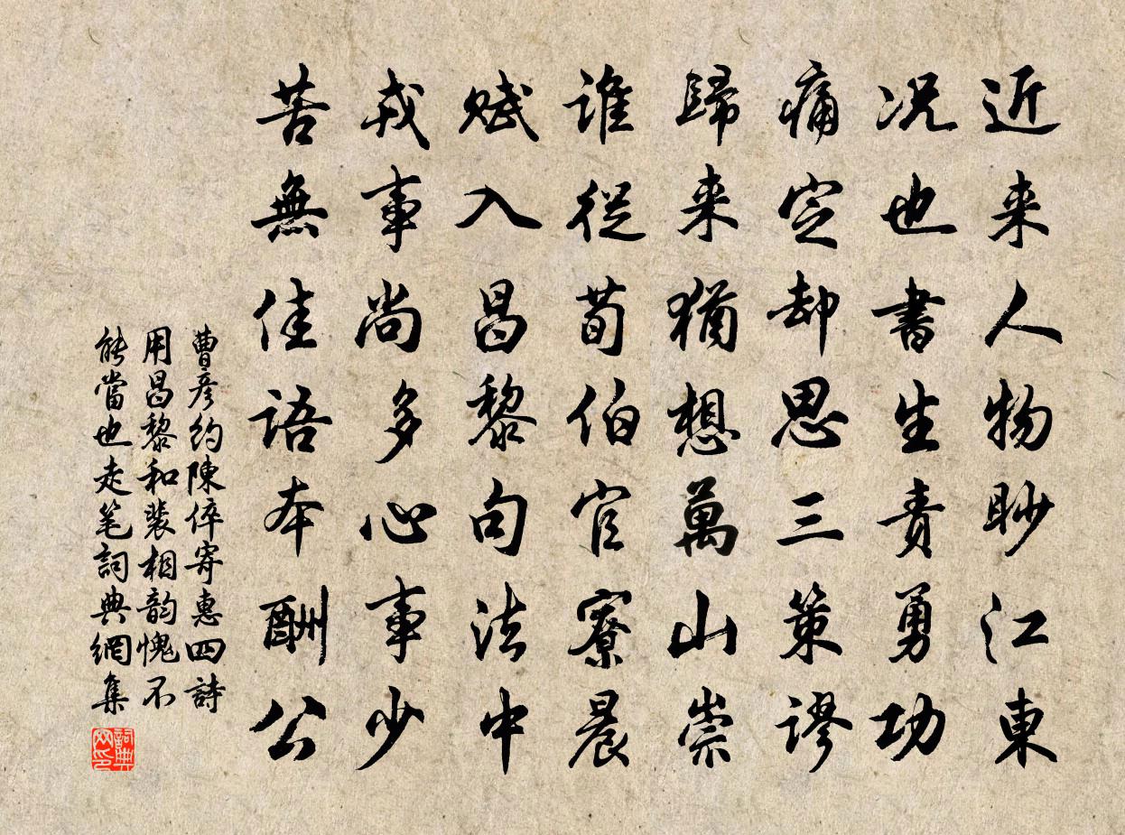 詩詞名句歷史字典書法欣賞書法字典國語詞典說文解字康熙字典古漢語字典標 題 作 者 詩 句 陳倅寄惠四詩用昌黎和裴相韻愧不能當也走筆作者:曹彥約 朝代:宋代原文近來人物眇江東,況也書生責勇功。痛定卻思三策謬,歸來猶想萬山崇。誰從荀伯官寮晨,賦入昌黎句法中。戎事尚多心事少,苦無佳語本酬公。詩詞問答問:《陳倅寄惠四詩用昌黎和裴相韻愧不能當也走筆》的作者是誰?答:曹彥約問:該詩寫於哪個朝代?答:宋代書法欣賞陳倅寄惠四詩用昌黎和裴相韻愧不能當也走筆書法作品詩文賞析【原題】:陳倅寄惠四詩用昌黎和裴相韻愧不能當也走筆賦二章以謝詩詞推薦初到忠州登東樓,寄萬州楊八使君白居易〔唐代〕山束邑居窄,峽牽氣候偏。林巒少平地,霧雨多陰天。隱隱煮鹽火,漠漠燒畬煙。賴此東樓夕,風月時翛然。憑軒次韻蔣德要三徑樓鑰〔宋代〕居山或稱囚,得閒乃賦謫。我方樂靜退,來作三徑客。西山致朝爽,膏肓在泉石。況當秋空淨,萬里看一碧。和鄰僧韻陳德翔〔宋代〕七八年來住水心,鼓鄰蕭寺共僧吟。古池暗有泉相接,春地從教筍自侵。興到濃時因坐久,交於淡處見情真。極憐春日隱居官舍感懷李洞〔唐代〕風吹燒燼雜汀沙,還似青溪舊寄家。入戶竹生床下葉,隔窗蓮謝鏡中花。苔房毳客論三學,雪嶺巢禽看兩衙。銷得洞仙歌葛郯〔宋代〕櫓聲伊軋,影轉雲間樹。試問扁舟在何許。正溪堂波動,沙渚苹輕,漁翁醉,隔岸蓑衣對舞。歸來無一事,尊酒相梅子張舜民〔宋代〕月破冥冥雨,枝搖閃閃黃。口中先水出,衣上帶花香。肺疾須拚醉,牙疏不耐嘗。調羹無復用,山谷日傾筐。題竹石牧牛黃庭堅〔宋代〕子瞻畫叢竹怪石,伯時增前坡牧兒騎牛,甚有意態,戲詠。野次小崢嶸,幽篁相倚綠。阿童三尺箠,御此老觳觫。觀音大士贊釋慧遠〔宋代〕大哉觀世音,功德不思議。來說是非人,是非人便是。句陳熊〔宋代〕水落舟橫露淺沙,粉垣松桂古禪家。方諸曲二首曹勛〔宋代〕迢迢方諸宮,玉闕排霄起。扶桑高扶疎,森聳數千里。碧椹雜青蔥,蟠桃映瑤水。離離間朱實,鳳鳥護丹蕊。靈風偈頌一百二十三首釋祖欽〔宋代〕我此潑天門戶,大地一綱俱收。若是祥麟瑞鳳,從教戴角擎頭。【雙調】折桂令_上已游嘉禾喬吉〔元代〕上已游嘉禾南湖歌者為豪奪扣舷自歌鄰舟皆笑三月三天霽吹晴,見麟鳳滄州,鴛鷺沙汀。華鼓清簫,紅雲蘭棹,青羅提舉見和再用韻四首陳造〔宋代〕又作凝香齋宿,未容燥吻得濡。頗怪太湖龍伯,貝宮臥戲明珠。春夢王鎡〔宋代〕東風敲碎玉闌乾,蝴蝶紛飛夢欲殘。翠被壓床銀燭暗,夜深誰問海棠寒。青玉案向滈〔宋代〕多情賦得相思分。便攬斷、愁和悶。萬種千般說不盡。吃他圈櫃,被他拖逗,便佛也、須教恨。傳消寄息無憑信。荒徑釋文珦〔宋代〕荒逕入林微,蓬廬客到稀。苔痕侵藥裹,山色冷吟衣。蚯蚓耕泥起,蜻蜒點水飛。坐來忘萬事,靜看宿雲歸。失意書懷呈知己馬戴〔唐代〕直道何由啟聖君,非才誰敢議論文。心存黃籙與丹訣,家憶青山與白雲。麋鹿幽棲閒可近,鴛鸞高舉勢宜分。微生行香子 勸修煉三首王處一〔元代〕識三田,通八脈。九轉光明,一點無塵隔。放蕩真慈通杳默。靈芽搬載青黃白。透昆宮,仙桂宅。迸出神珠,空外送紹興葉帥改當塗徐元傑〔宋代〕人言禹會即當塗,上曰蕪湖抵鑑湖。姑少副公求去爾,匪伊有詔盍歸乎。知心霜月渾無滓,回首春風定與俱。慙愧用夾穀子括吳山晚眺韻十首方回〔宋代〕三吳百越楚天寬,不厭登臨不厭觀。畫舫紅橋隨處有,丹樓碧宇倚空寒。梅邊吟思春光早,雁外歸心夕照殘。燈火名句推薦行舟逗遠樹,度鳥息危檣。陰鏗《渡青草湖》 斜倚畫闌嬌不語,暗移梅影過紅橋,裙帶北風飄。納蘭性德《望江南·詠弦月》 當年得意如芳草。日日春風好。辛棄疾《虞美人·賦虞美人草》 細看不是雪無香,天風吹得香零落。王旭《踏莎行·雪中看梅花》 遙想公瑾當年,小喬初嫁了,雄姿英發。蘇軾《念奴嬌·赤壁懷古》 自知者不怨人,知命者不怨天。荀子《荀子·榮辱》 食必常飽,然後求美;衣必常暖,然後求麗;居必常安,然後求樂劉向《說苑·反質》 車轔轔,馬蕭蕭,行人弓箭各在腰。杜甫《兵車行》 滾滾長江東逝水,浪花淘盡英雄。楊慎《臨江仙·滾滾長江東逝水》 今朝此為別,何處還相遇。韋應物《初發揚子寄元大校書》
