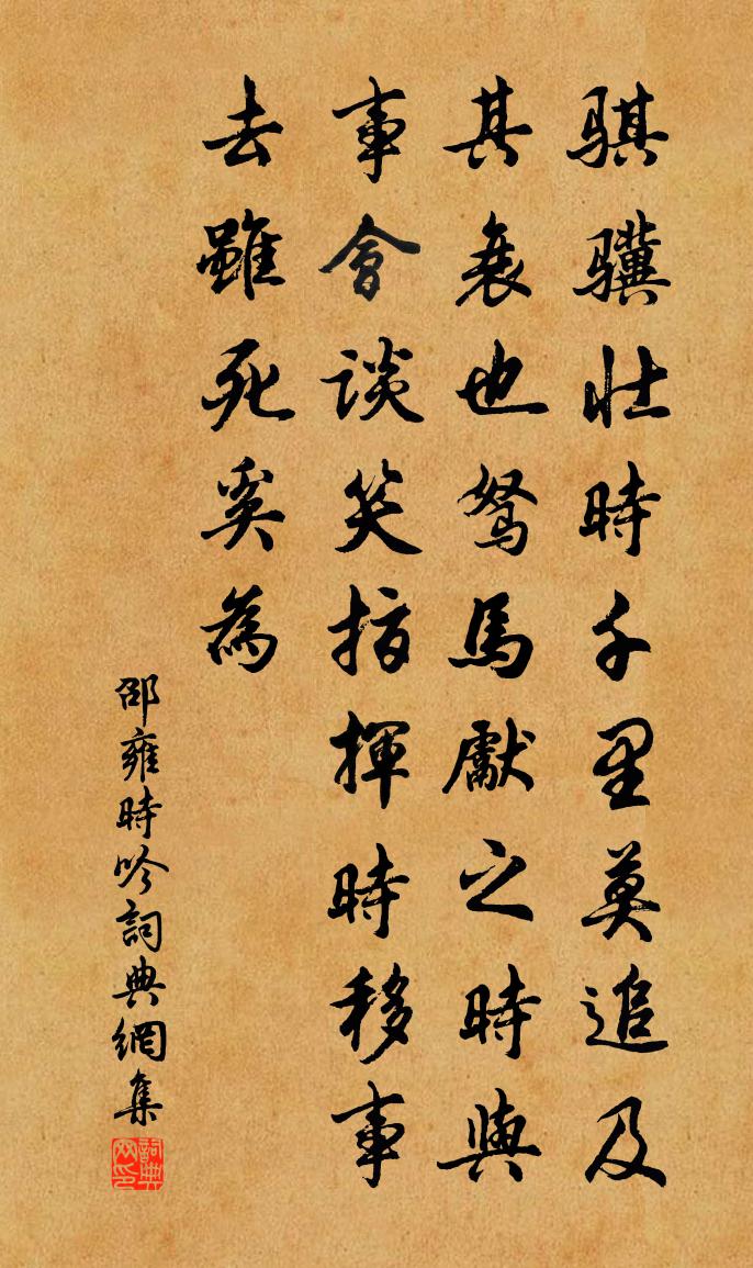 詩詞名句歷史字典書法欣賞書法字典國語詞典說文解字康熙字典古漢語字典標 題 作 者 詩 句 時吟作者:邵雍 朝代:宋代時吟原文騏驥壯時,千里莫追。及其衰也,駑馬先之。時與事會,談笑指揮。時移事去,雖死奚為。詩詞問答問:時吟的作者是誰?答:邵雍問:時吟寫於哪個朝代?答:宋代邵雍時吟書法欣賞時吟書法作品詩詞推薦執劍呂洞賓贊釋慧開〔宋代〕露刃單提,行殺活令。斬食嗔痴,群魔乞命。夫是之謂,純陽真人。激濁揚清,摧邪顯正。哭胡處士曹松〔唐代〕故人江閣在,重到事悠悠。無爾向潭上,為吾傾瓮頭。空餘赤楓葉,墮落釣魚舟。疑是沖虛去,不為天地囚。鄰圃求桂花並收墜英陳深〔宋代〕萬里西風桂樹秋,蟾宮雲箔夜香浮。何當淨洗紅塵夢,乞取一枝遮醉眸。毀馮雲山書館中偶像洪秀全〔清代〕神天之外更無神,何故愚頑假作真!只為本心渾天卻,焉能超出在凡塵。代北風涼行鮑照〔南北朝〕北風涼。雨雪雱。京洛女兒多嚴妝。遙艷帷中自悲傷。沉吟不語若有忘。問君何行何當歸。苦使妾坐自傷悲。盧年依韻和尚書再贈牡丹花徐夤〔唐代〕爛銀基地薄紅妝,羞殺千花百卉芳。紫陌昔曾游寺看,朱門今在繞欄望。龍分夜雨資嬌態,天與春風發好香。多著承宮樵薪苦學佚名〔先秦〕承宮,琅邪姑幕人。少孤,年八歲,為人牧豬。鄉里徐子盛明《春秋》經,授諸生數百人。宮過其廬下,見諸生講和袁州張守鹿鳴宴韻彭龜年〔宋代〕太守興賢極選掄,奏書飛上帝王閽。幾年霧隱南山豹,今日風摶北海鯤。得士不孤天子詔,贈行仍有古人言。向來挽潘德夫左司孫應時〔宋代〕湖海歸來近,山林興故長。勇辭黃閣掾,卻上白雲鄉。縹緲書樓壯,淒涼筆冢荒。家聲傳二妙,公死未應亡。開壕行劉克莊〔宋代〕前人築城官已高,後人下車來開壕,畫圖先至中書省,諸公聚看稱賢勞。壕深數丈周十里,役兵大半化為鬼;傳聞和鮑判院見寄二首曹勛〔宋代〕當年壯志作三軍,扳馬曾同幕下賓。欲試韜鈐毘廟算,便期鷹隼出風塵。暮年歲月嗟殘景,一水波濤有故人。端謂奉和襲美吳中言懷寄南海二同年陸龜蒙〔唐代〕曾見凌風上赤霄,盡將華藻赴嘉招。城連虎踞山圖麗,路入龍編海舶遙。江客漁歌沖白荇,野禽人語映紅蕉。庭中春日雜言十一首趙蕃〔宋代〕晚欣斜日照茅檐,意謂新晴已可占。雨腳曉收雲更合,陽烏將出尚窺覘。所寓開利寺小池有四色蓮花青黃白紅紅者千葉張舜民〔宋代〕深山草木自幽奇,四色荷花世所稀。孤獨園中瞻佛眼,凝祥池上捧天衣。白公沒後禪林在,王儉歸來幕府非。水冷贈隱士連文鳳〔宋代〕不隱山林隱市廛,半生活計此書田。可鄰世上無揚子,誰識雄心在太玄。天禧寺阿育王塔馬之純〔宋代〕兩山回處是為乾,有塔亭亭高似山。不但裝嚴增梵剎,可能形勝助城關。燈明星斗掛林木,鈴動天風吹佩環。陌上胡士彥輓詞二首陳師道〔宋代〕此地來何晚,經年見未頻。薦賢仍賭命,有道可辭貧。徒弟三千子,聲名四十春。襄陽耆舊內,無複姓龐人。游江南水陸院韓偓〔唐代〕早於喧雜是深讎,猶恐行藏墜俗流。高寺懶為攜酒去,名山長恨送人游。關河見月空垂淚,風雨看花欲白頭。除卻陪晦翁登妙高峰一首王阮〔宋代〕千崖盤屈曲,一塔矗空濛。它處只山好,此中兼水洪。縱觀疑犯斗,飛上覺凌風。常恨天難近,今朝路已通。喜張十八博士除水部員外郎白居易〔唐代〕老何歿後吟聲絕,雖有郎官不愛詩。無復篇章傳道路,空留風月在曹司。長嗟博士官猶屈,亦恐騷人道漸衰。今日名句推薦一身虜雲外,萬里胡天西。岑參《早發焉耆懷終南別業》 斷崖蒼蘚對立久,凍雨為洗前朝悲。黃庭堅《書摩崖碑後》 寶馬雕車香滿路。辛棄疾《青玉案·元夕》 脅肩諂笑,病於夏畦。孟子《孟子·滕文公章句下·第七節》 淇則有岸,隰則有泮。佚名《氓》 四月十七,正是去年今日,別君時。韋莊《女冠子·四月十七》 眼見的吹翻了這家,吹傷了那家,只吹的水盡鵝飛罷!王磐《朝天子·詠喇叭》 會天大雨,道不通,度已失期司馬遷《陳涉世家》 惆悵東欄一株雪,人生看得幾清明。蘇軾《東欄梨花》 一年最好,偏是重陽。吳文英《惜黃花慢·菊》