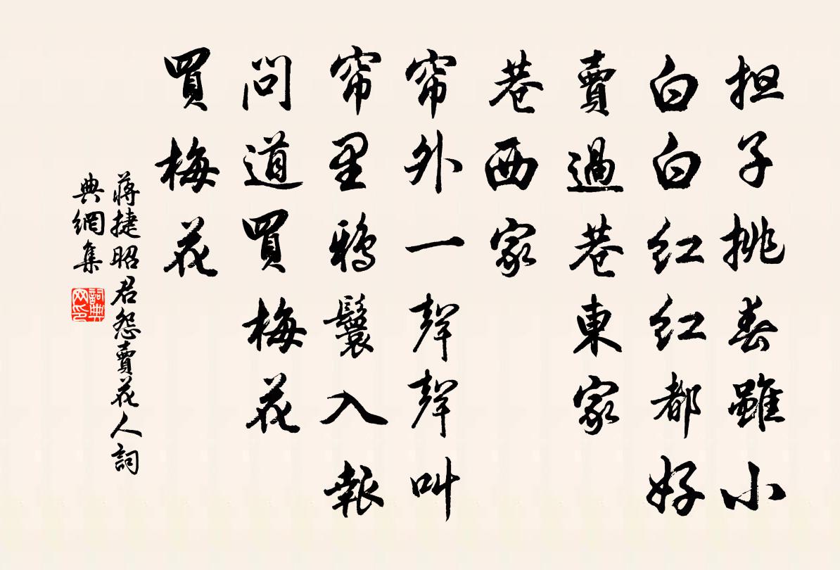 擔子雖小卻挑著無限風光,白白紅紅的花朵,每樣花都很好。賣花人每日穿街過巷,巷東家、巷西家四處吆喝。簾外一聲聲高叫,簾內丫鬟進去稟報。詢問著女主人:買梅花還是買桃花好?