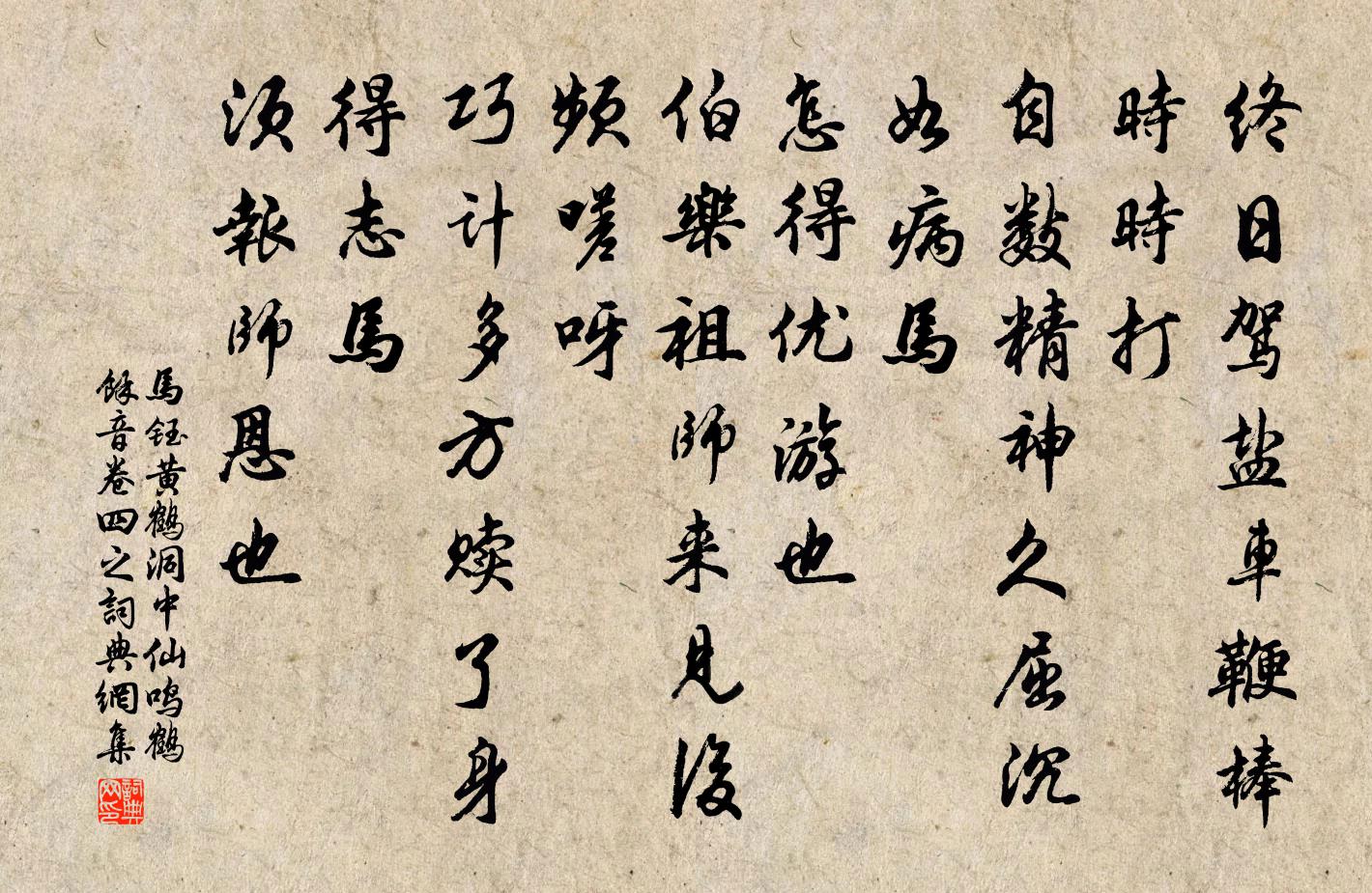 詩詞名句歷史字典書法欣賞書法字典國語詞典說文解字康熙字典古漢語字典標 題 作 者 詩 句 黃鶴洞中仙 鳴鶴餘音卷四之作者:馬鈺 朝代:元代原文終日駕鹽車,鞭棒時時打。自數精神久屈沉,如病馬。怎得優遊也。伯樂祖師來,見後頻嗟呀。巧計多方贖了身,得志馬。須報師恩也。詩詞問答問:《黃鶴洞中仙 鳴鶴餘音卷四之》的作者是誰?答:馬鈺問:該詩寫於哪個朝代?答:元代問:該詩是什麼體裁?答:詞書法欣賞黃鶴洞中仙 鳴鶴餘音卷四之書法作品詩詞推薦春晚與諸同捨出城迎座主侍郎(一作鄭顥詩)李郢〔唐代〕三十驊騮一哄塵,來時不鎖杏園春。東風柳絮輕如雪,應有偷游曲水人。和曇穎師四明十題宴坐岩梅堯臣〔宋代〕心危身亦危,衽席尚顛墜。如何岩石上,來坐自安意。能諭死生間,無論寤與寐。偈頌七十六首釋師觀〔宋代〕今朝四月一,結夏又在即。若是到家人,日日是好日。雜曲歌辭。行路難崔顥〔唐代〕君不見建章宮中金明枝,萬萬長條拂地垂。二月三月花如霰,九重幽深君不見。艷彩朝含四寶宮,香風旦入朝雲殿鳳凰台黃度〔宋代〕江淮表里拱神州,底事干戈不肯休。試上鳳凰台上望,定山盡處是瓜洲。和朱運筦郊行劉黻〔宋代〕扁舟隨處泊,山影動清波。柳惜春風老,花嗔宿雨多。野棋驚鶴夢,僧磬答漁歌。靈運經行地,今年幾度過。湖中送敬十使君適廣陵杜甫〔唐代〕相見各頭白,其如離別何。幾年一會面,今日復悲歌。少壯樂難得,歲寒心匪他。氣纏霜匣滿,冰置玉壺多。遭亂趨府馬上悠然思陳無己三兄成詩寄之晁說之〔宋代〕瓦釜毀未棄,黃鍾幸且存。於焉正律呂,誰為到崑崙。相思出苦淚,東漢太丘孫。聞之在徐州,無衣出柴門。亦賦聞叔易隱居被詔晁說之〔宋代〕東海一生垂釣客,石渠萬卷校書郎。丈人風味今如此,鶴到揚州興更長。蝶戀花 暮春別李公擇蘇軾〔宋代〕簌簌無風花自嚲。寂寞園林,柳老櫻桃過。落日多情還照坐。山青一點橫雲破。路盡河回千轉柁。系纜漁村,月暗送張無夢歸天台山錢惟演〔宋代〕金庭霞標雲半中,岩扉澗戶凌太空。飄飄靈氣際浮景,蟬蛻萬物乘高風。吾君當天坐環極,物色異人方側席。豈因端午日用韻虞儔〔宋代〕今朝端午懶吟詩,此意兒曹莫遣知。萱草著花空有恨,菖蒲稱壽永無時。遠途日暮休回首,近事風傳只皺眉。角黍水龍吟(次韻黃蘧軒虛谷詠鳳花)陳著〔宋代〕杜鵑啼正忙時,半風半雨春慳霽。酴醿未過,櫻甜初熟,梅酸微試。一種紅芳,九苞真色,舞窗翻砌。自仙樊去後丁丑同蔣力父東歸至城詩以別之王邁〔宋代〕發軔神皋愁熱甚,解驂鄉井得涼多,半生相托左右手,一日同收甲乙科。老我已鋤年少習,期君共守歲寒柯。榮華驀山溪(上元詞)毛滂〔宋代〕嬋娟不老,依舊東風面。華燭下珠軿,盛寒里、春光一片。不教暮景,也似每常來,水精宮,銀 * ,今夜分明見題汪聖鍚墳庵真如軒在玉山常山之間楊萬里〔宋代〕東吳南垂楚北際,中央不合大如礪。百灘千嶂自一川,清空不是人間世。玉山先生攜老禪,把茅結庵開小軒。身前鷓鴣天郭應祥〔宋代〕眼前好景真無盡,身外浮名盡可輕。窮勝賞,續歡盟。直饒風雨也須晴。滿頭插菊掀髯笑,笑道齊山浪得名。挽徐吏部熊夢渭〔宋代〕南浦簪纓盛,西山衣缽傅。純忱儀後進,達德邁前賢。靜默賞聞道,安怡偶似禪。嗟哉游汗漫,不使侍甘泉。賀吳興郡王生日四絕王炎〔宋代〕德聲不減漢東平,玉鑒冰壺表里清。休問南山山色翠,淡然無欲自長生。劉氏女自誓為尼憐其操者幸助成之葉適〔宋代〕漢上洪波不可親,夔州華發自嫌貧。世間浮想如枯蠟,還向虛空嫁此身。名句推薦但存夫子三分禮,不犯蕭何六尺條。馮夢龍《醒世恆言·卷十三》 善惡到頭終有報,只盼來早與來遲。佚名《增廣賢文·上集》 隔岸荒雲遠斷,繞磯小樹微明。歸莊《錦堂春·半壁橫江矗起》 下謀上以術,術有窮者以力。來俊臣《羅織經·謀劃卷第九》 內外相應也,言行相稱韓非及後人《韓非子·解老》 魄依鉤樣小,扇逐漢機團。薛濤《月》 東城漸覺風光好。宋祁《玉樓春·春景》 林壑斂暝色,雲霞收夕霏。謝靈運《石壁精舍還湖中作》 雪虐風饕愈凜然,花中氣節最高堅。陸游《落梅》 青箬笠,綠蓑衣,斜風細雨不須歸。張志和《漁歌子·西塞山前白鷺飛》