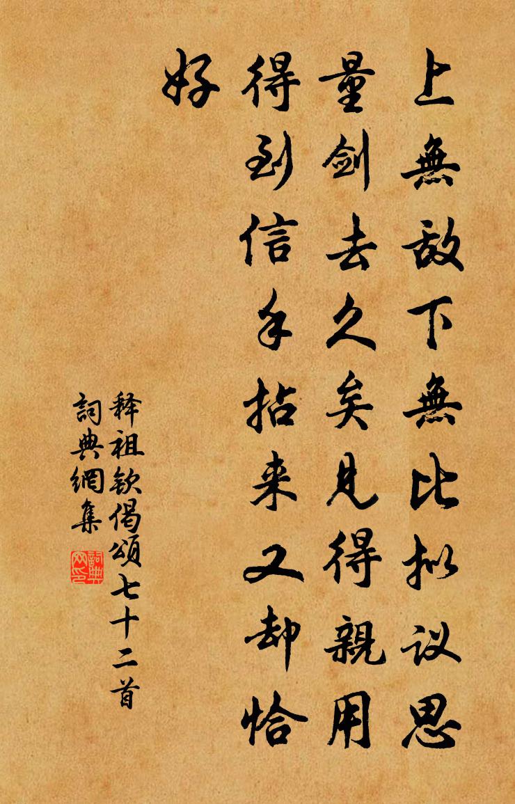 詩詞名句歷史字典書法欣賞書法字典國語詞典說文解字康熙字典古漢語字典標 題 作 者 詩 句 偈頌七十二首作者:釋祖欽 朝代:宋代偈頌七十二首原文上無敵,下無比。擬議思量,劍去久矣。見得親,用得到。信手拈來,又卻恰好。詩詞問答問:偈頌七十二首的作者是誰?答:釋祖欽問:偈頌七十二首寫於哪個朝代?答:宋代釋祖欽偈頌七十二首書法欣賞偈頌七十二首書法作品詩詞推薦寄蜀二首劉子翬〔宋代〕有客傳歸信,愁懷得暫寬。兒童占鵲喜,鄰里借書看。離蜀秋方半,浮湘歲欲闌。柴門頻灑掃,夢想見征鞍。辛亥季冬雪中作劉應時〔宋代〕凍雲橫山風卷沙,槎牙古木鳴寒鴉。長空黯淡常如晚,煙景淒為亦自佳。開窗未及一食頃,剪水俄傾六出花。須臾李徽猷病後許賞蓮而未酬小詩發一笑陳元晉〔宋代〕僧夏分來一榻涼,愛蓮更壇水雲鄉。露融初日敷朝采,雨卷涼飈送晚香。天女群參青葉髻,水仙爭護紫荷囊。一絲句張鎰〔宋代〕山中宰相晉遺民,下視雄特何仆臣。和天慶觀瑞香花李覯〔宋代〕聞說仙花玉染紅,別留春色在壺中。瑤台若見飛瓊面,不與人間夢寐同。詠鷹(越歸南唐初投鄂帥張宣,久不見知,以鷹詩誚之)佚名〔唐代〕雪爪星眸世所稀,摩天專待振毛衣。虞人莫謾張羅網,未肯平原淺草飛。頌古三十八首釋從瑾〔宋代〕當陽打動番南鼓,萬象森羅立地聞。不是大家齊則劇,難消白日到黃昏。湯泉周沔〔宋代〕雁門泉水熱於湯,清淨源從古道場。應笑驪山山下水,至今猶帶粉脂香。菩薩蠻(可人梅軸)趙師俠〔宋代〕瓊英為惜輕飛去。可人妙筆移縑素。瀟灑向南枝。永無開謝時。閨房難並秀。自是春風手。何必問逃禪。人間水墨馬上見賣芍藥戲贈張厚之二絕蘇轍〔宋代〕春風欲盡無尋處,盡向南園芍藥中。過盡此花真盡也,此生應與此花同。春來便有南園約,過盡春風約尚賒。綠葉休日晚步二絕句楊萬里〔宋代〕未須急訪社中狂,且到西園探海棠。今歲行春雖較晚,也勝雨里度春光。剔銀燈杜安世〔宋代〕好事爭如不遇。可惜許、多情相誤。月下風前,偷期竊會,共把衷腸分付。尤雲殢雨。正繾綣、朝朝暮暮。無奈別挽葛簽判二首劉宰〔宋代〕少長相望五十年,君須未白工華顛。擬求勾漏還丹術,忍賦山陽懷舊篇。擁爐不出輒終日自嘲陸游〔宋代〕柴門木落葉成堆,十日元無一再開。書坐藏多為飽祟,詩緣吟苦作窮媒。兒言山圃當收栗,僧約溪橋共探梅。堪笑晚春青門林亭燕集耿湋〔唐代〕都門連騎出,東野柳如絲。秦苑看山處,王孫逐草時。歡游難再得,衰老是前期。林靜鶯啼遠,春深日過遲。落花聖號雅二篇趙湘〔唐代〕皇宅斯道,汗汗浩浩。賢俊茀茀,鐘鼓考考。爰煦爾赤,爰妥其老。樂只萬國,寧德攸寶。江南四遷國之亡天也歌以紀之唐涇〔宋代〕吳峰一發暮雲孤,愁向湘纍訊故都。風去只餘韻樂在,雁來還有帛書無。杏壇有客陳孤注,平隴何人復五銖。歌徹清平樂趙長卿〔宋代〕紫簫聲斷。窗底春愁亂。試著春衫羞自看。窄似年時一半。一春長病厭厭。新來愁病重添。香冷倦熏金鴨,日高不再次韻十首陳造〔宋代〕城西山水窟,早晚命籃輿。勝絕僧能有,拘攣我不如。山雲側步踴,雪壁細行書。它日嘗般礴,蕭然樂有餘。句唐介〔宋代〕越林多蔽天,黃柑親丹橘。名句推薦奇外無奇更出奇,一波才動萬波隨。元好問《論詩三十首·二十二》 小扇引微涼,悠悠夏日長。顧太清《菩薩蠻·端午日詠盆中菊》 習俗移志,安久移質。荀子《荀子·儒效》 鳥銜野田草,誤入枯桑里。李白《樹中草》 秋夜訪秋士,先聞水上音。袁枚《夜過借園見主人坐月下吹笛》 傷心秦漢經行處,宮闕萬間都做了土。張養浩《山坡羊·潼關懷古》 柘彈何人發,黃鸝隔故宮。溫庭筠《清明日》 夏起大土功,命曰絕理。犯禁絕理,天誅必至。佚名《黃帝四經·經法·亡論》 玉人初上木蘭時。懶妝斜立澹春姿。吳文英《浣溪沙·題李中齋舟中梅屏》 抽刀斷水水更流,舉杯銷愁愁更愁。李白《宣州謝朓樓餞別校書叔雲 / 陪侍御叔華登樓歌》