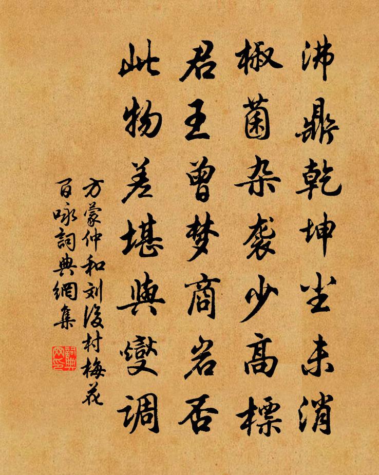 詩詞名句歷史字典書法欣賞書法字典國語詞典說文解字康熙字典古漢語字典標 題 作 者 詩 句 和劉後村梅花百詠作者:方蒙仲 朝代:宋代和劉後村梅花百詠原文沸鼎乾坤塵未消,椒菌雜襲少高標。君王曾夢商岩否,此物差堪與燮調。詩詞問答問:和劉後村梅花百詠的作者是誰?答:方蒙仲問:和劉後村梅花百詠寫於哪個朝代?答:宋代方蒙仲和劉後村梅花百詠書法欣賞和劉後村梅花百詠書法作品詩詞推薦題浯溪二首蔣孝忠〔宋代〕我宋中原二百州,版圖漸入掌中收。只今更辦河清頌,勒向燕然最上頭。和石昌言學士官舍十題水紅梅堯臣〔宋代〕江天淡淡江水平,江岸有花紅作穗。今日特向都城開,晝時只合銜魚翠。禪房十事香印釋紹曇〔宋代〕要識分明古篆,一槌打得完全。燒炷旃檀牛糞,衲僧鼻孔楔穿。病中絕句陸游〔宋代〕少時談舌挾風雷,病後逢人口嬾開。安得東皋隱君子,相看無語只銜杯。和人禁中作宋祁〔宋代〕鈞曲來深殿,宮花出御溝。雲天正如畫,壁月在西樓。晝權德輿〔唐代〕孤舟漾曖景,獨鶴下秋空。安流日正晝,淨綠天無風。劉盆子徐鈞〔宋代〕操符未識君為貴,解璽方知盜可羞。絳服大冠真主出,不先肉袒更何求。句張湜〔宋代〕吳山空對越山明。念奴嬌 石頭城鄭燮〔清代〕懸岩千尺,借歐刀吳斧,削成城郭。千里金城回不盡,萬里洪濤噴薄。王浚樓船,旌麾直指,風利何曾泊。船頭列再賦陳與義〔宋代〕堂堂李杜壇,誰敢躡其址。先生坐壇上,持鉞令餘子。由來文字伯,不但表奏偉。高懷淡無嗜,寓興或留此。平生句許庚〔宋代〕頓超捷進脫,故習肩前修。三十日乃耘老弟生朝余護客舟行高郵道中不勝虞儔〔宋代〕愛日初看一線遲,門弧喜氣又相隨。遙知綺席團欒處,正是蓬窗寂寞時。節愛堂中先遣信,富陽驛里舊吟詩。生涯邊將唐求〔唐代〕三千護塞兒,獨自滯邊陲。老向二毛見,秋從一葉知。地寒鄉思苦,天暮角聲悲。卻被交親笑,封侯未有期。法剛化士乾蔣山藏經乞語章甫〔宋代〕鐘山夜半發奇怪,火光熾然脫三昧,法筵龍象不須驚,寶公留得眉毛在。食輪才 * 隨,樓台金碧還相輝。大千送人出使吳芾〔宋代〕驛騎駸駸犯露霜,定知遐俗喜生光。千官弩矢迎郊外,百姓壺漿夾道旁。要使遠謀安井邑,盡令諸將守封疆。更將別馮使君貫休〔唐代〕瓦礫文章豈有媒,兩三年只在金台。本師頭白須歸去,太守門清願再來。皓皓玉霜孤雁遠,蕭蕭松島片帆開。從茲睢陽五老圖司馬光〔宋代〕圖謀已就樂時間,曉向田園喜脫冠。心志不灰猶有策,星長還在尚無桓。朝陽鳴鳳身輕暖,赴壑剛蛇齒健寒。俯表滿庭芳趙長卿〔宋代〕晚色沈沈,雨聲寂莫,夜寒初凍雲頭。曉來階砌,一捻冷光浮。目斷江天靄靄,低迷映、綠竹修修。多才客,高吟魯連台屈大均〔清代〕一笑無秦帝,飄然向海東。誰能排大難?不屑計奇功。古戍三秋雁,高台萬木風。從來天下士,只在布衣中。挽李泰發參政三首曾幾〔宋代〕道義曾無間,因依遂有連。旋聞新雨露,亟返舊林泉。父老門庭下,兒孫几杖前。不令成比段,泣涕問蒼天。名句推薦家必自毀,而後人毀之。孟子《孟子·離婁章句上·第八節》 美色不同面,皆佳於目;悲音不共聲,皆快於耳王充《論衡·卷三十·自紀篇》 日暮秋煙起,蕭蕭楓樹林。戴叔倫《過三閭廟》 命隨年欲盡,身與世俱忘;文天祥《除夜》 天時、地利、人和,三者不得,雖勝有殃。孫臏《孫臏兵法·月戰》 綠楊煙外曉寒輕,紅杏枝頭春意鬧。宋祁《玉樓春·春景》 殘螢棲玉露,早雁拂金河。許渾《早秋三首·其一》 語之所貴者意也,意有所隨。意之所隨者,不可言傳也。莊子《莊子·外篇·天道》 危樓高百尺,手可摘星辰。李白《夜宿山寺》 今日雲景好,水綠秋山明。李白《九日》
