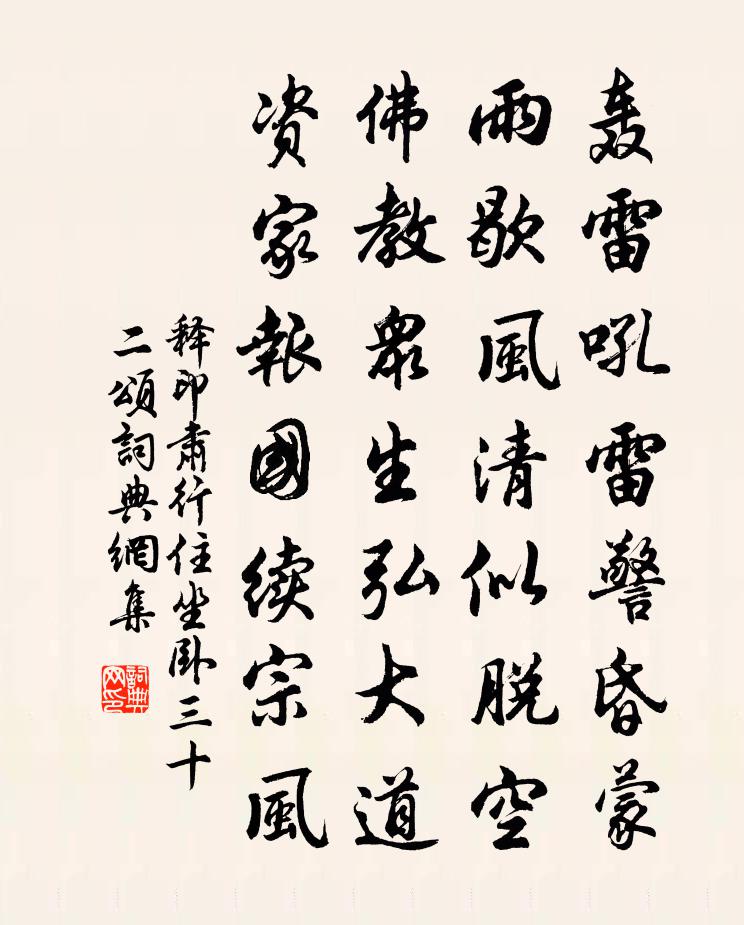 詩詞名句歷史字典書法欣賞書法字典國語詞典說文解字康熙字典古漢語字典標 題 作 者 詩 句 行住坐臥三十二頌作者:釋印肅 朝代:宋代行住坐臥三十二頌原文轟雷吼雷警昏蒙,雨歇風清似脫空。佛教眾生弘大道,資家報國續宗風。詩詞問答問:行住坐臥三十二頌的作者是誰?答:釋印肅問:行住坐臥三十二頌寫於哪個朝代?答:宋代釋印肅行住坐臥三十二頌書法欣賞行住坐臥三十二頌書法作品詩詞推薦比因和首座詩有故欲撩公懶是真之句名其室日趙蕃〔宋代〕少日經禪暇,猶余文字嬉。老來無復事,日用亦奚為。衲被忘宵度,團蒲失晝移。謂公真是懶,如我不其痴。題草蟲扇二首陳造〔宋代〕捩首一振怒臂,鼓翅雙搖利鋒。底用交綏解鬧,政應沐我仁風。田家·田家無所求劉基〔明代〕田家無所求,所求在衣食;丈夫事耕稼,婦女攻紡績,侵晨荷鋤出,暮夜不遑息。飽暖匪天降,賴爾筋與力。租稅書何貢士居晁說之〔宋代〕吟興隨花發,高簾對雨疏。人家南郭外,雲出北窗虛。筍蕨何時歇,詩書幾世居。我來懷舊隱,便擬返柴車。夜讀唐諸人詩多賦烽火者因記在山南時登城觀陸游〔宋代〕我昔游梁州,軍中方罷戰。登城看烽火,川迥風裂面。青熒並駱谷,隱翳連鄠縣。月黑望愈明,雨急滅復見。初疑小孤山董嗣杲〔宋代〕小孤隸舒州,誰將峭崖削。一尖漾浩渺,藤蘿綴瓔珞。綠篠裹山脅,白浪沸山腳。向背千萬態,渾不假鐫鑿。危亭菩薩蠻·回文蘇軾〔宋代〕嶠南江淺紅梅小,小梅紅淺江南嶠。窺我向疏籬,籬疏向我窺。老人行即到,到即行人老。離別惜殘枝,枝殘惜別鄰園花成欲具旬會病未果二首王洋〔宋代〕年從脹脈冷侵甩,強欲尋春怯自疑。衰病固知無可奈,不須妨我看花時。頌古三十一首釋玿〔宋代〕曹山不如,花根本艷。不如曹山,虎體元班。江南地暖,塞北春寒。一把柳絲收不得,和煙搭在玉闌乾。題秦隱君麗句亭戴叔倫〔唐代〕北人歸欲盡,猶自住蕭山。閉戶不曾出,詩名滿世間。織機白玉蟾〔宋代〕天地山河作織機,百花如錦柳如絲。虛空白處做一疋,日月雙梭天外飛。讀吟嘯集彭秋宇〔宋代〕興廢明知數有天,臣心感激義當然。孔明尚欲西都蜀,王蠋寧甘北面燕。鳳鶴不靈淒落日,蛟龍已逝冷長川。丈夫觀兩漢吟邵雍〔宋代〕秦破河山舊戰場,豈期民復見耕桑。九千來里開封域,四百餘年號帝王。剝喪既而遭莽卓,經營殊不念高光。當時次蘭皋自詠楊公遠〔宋代〕生來無分對書燈,卻喜逢人便眼青。枵腹謾臨求米帖,學耕頻勘相牛經。堎贈骨相身長健,磊磈襟懷鬢未星。密掩春晚圃田道中三首晃沖之〔宋代〕君王重老降褒書,特賜宣陽宅一區。聞說會稽人不識,鑑湖還肯借臣無。霍仁仲指教帖贊岳珂〔宋代〕金斗之魁祥,爛兮流光。玉墀之西廂,頎兮荷囊。寶墨之淋浪,蔚兮遺芳。百年之巾緗,宜兮毖藏。北池小會曾鞏〔宋代〕笑語從容酒慢巡,笙歌隨賞北池春。波間鏤檻花迷眼,沙際朱橋柳拂人。金縷暗移泉溜急,銀簧相合鳥聲新。幸時寄婺州歐卿德孺朱翌〔宋代〕醉翁遺蹟遍江湖,何事東遊不到吳。遂使山川有遺恨,卻看孫子步清塗。沈郎帶減傳千古,婺女星高近六符。簪筆垂拱殿賜對蒙恩入省李復〔宋代〕黼座親瞻咫尺威,恭承天語慰衰遲。錦書殿陛初傳賜,白髮郎潛且漫為。九日重分番直夜,六參便赴早期時。自知答權乾用命字韻見惠章甫〔宋代〕峩峩儒衣冠,昕貴知義命。大道若坦途,狂夫蹈邪徑。惟君異流俗,學古師往聖。窮居飲一瓢,輕視車千乘。粹然名句推薦還背垂虹秋去,四橋煙雨,一宵歌酒。吳文英《瑞龍吟·送梅津》 滄海月明珠有淚,藍田日暖玉生煙。李商隱《錦瑟》 美女渭橋東,春還事蠶作。李白《陌上桑》 饒人不是痴漢,痴漢不會饒人。佚名《增廣賢文·上集》 誰道投鞭飛渡,憶昔鳴髇血污,風雨佛狸愁辛棄疾《水調歌頭·舟次揚州和人韻》 當路誰相假,知音世所稀孟浩然《留別王侍御維/留別王維》 誰憐散髻吹笙,天涯芳草關情。納蘭性德《清平樂·孤花片葉》 柳葉雙眉久不描,殘妝和淚污紅綃。江采萍《謝賜珍珠》 丈夫志,當景盛,恥疏閒。蘇舜欽《水調歌頭·滄浪亭》 朝見馬嶺黃沙合,夕望龍城陣雲起。盧思道《從軍行》