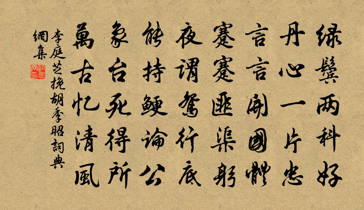 詩詞名句歷史字典書法欣賞書法字典國語詞典說文解字康熙字典古漢語字典標 題 作 者 詩 句 挽胡季昭作者:李庭芝 朝代:宋代挽胡季昭原文綠鬢兩科好,丹心一片忠。言言開國體,蹇蹇匪渠躬。夜謂鴛行底,能持鯁論1/1公。象台死得所,萬古憶清風。詩詞問答問:挽胡季昭的作者是誰?答:李庭芝問:挽胡季昭寫於哪個朝代?答:宋代李庭芝挽胡季昭書法欣賞挽胡季昭書法作品詩詞推薦青紫峰亭錢益〔宋代〕壯歲事遠遊,衰齡守鄉井。閒看舊遊地,偶陟黃旗嶺。因登青紫峰,雙目肆遐騁。孤亭倚山巔,當午風日冷。憑欄東平夫人挽章秦觀〔宋代〕相閥風流監,王家地勢雄。室中蘭作佩,庭下玉成叢。啼鳥悲春檻,荒原入夜宮。遺芳得鴻筆,論次詔無窮。感春三首張耒〔宋代〕我昨西來到昌谷,主人致酒留我宿。坐中少年美如玉,高歌清歡春夜促。還家病酒對殘春,東風落花吹滿屋。出無初夏雜詠陸游〔宋代〕昔日江湖上,飄然無定居。頻傾京口酒,亦食武昌魚。北首心空壯,東歸憤不攄。豈知牙齒落,送老一茆廬。感皇恩(駕霄亭觀月)張鎡〔宋代〕詩眼看青天,幾多虛曠。雨過涼生氣蕭爽。白雲無定,吹散作、鱗鱗瓊浪。尚餘星數點,浮空上。明月飛來,寒光蝶戀花 昔鹿庵 軒,樂育淇上,一時秀造,王惲〔元代〕賓王校本改)中元已來,例宦遊四方。仆二十年間,三至鄉里,慨然有離索之嘆。今歲投紱自濟南來歸,而諸公頗論語弟子入則孝章陳普〔宋代〕孝弟謹信泛愛眾,親仁猶未是全功。聖賢成法事物理,都在詩書六藝中。沁園春佚名〔宋代〕凝眸。悔上層樓。便惹起新愁與舊愁。寄田舍人王禹偁〔宋代〕山處升沉不足悲,羨君操履是男兒。左遷郡印辭綸閣,直諫書囊在殿帷。未有僉諧徵賈誼,可無章疏雪微之。朝行吳李堅甫中舍文同〔宋代〕往年曾憶過長安,短紙書名詣門下。君時延我坐終日,灑掃東軒留看畫。橫圖巨軸不知數,但見匣中時一把。甲猶題泰州司理廨舍小亭趙蕃〔宋代〕鑿去為亭因得池,面池老柳蔽仍虧。客來不用勤修供,乞與繩床令賦詩。新歲七十以人生七十古來稀為韻寄錢大參七首曹勛〔宋代〕一二三四五六七,行年臨之如電疾。只將香火對清閒,古井無波應委悉。題陸羽祠堂兼寄李援援有詩殊佳二首張耒〔宋代〕陸子不可招,寥寥風月魂。空堂掩遺像,幸此配老禪。舉世人澆薄,雲誰知子賢。竟陵樵牧地,陳跡豈復存。我欲歲暮言懷呈諸友王令〔宋代〕萬事無成只一吁,窮年況復嘆窮途。功名未立頭先白,貧病相仍氣尚粗。富貴早知皆有命,窮通料是不由吾。會須秋日登岳陽樓晴望張碧〔唐代〕三秋倚練飛金盞,洞庭波定平如剗。天高雲卷綠羅低,一點君山礙人眼。漫漫萬頃鋪琉璃,煙波闊遠無鳥飛。西南初見淮山梅堯臣〔宋代〕遊宦久去國,扁舟今始還。朝來汴口望,喜見淮上山。斷嶺碧峰出,平沙白鳥閒。南歸不厭遠,況在水雲間。鎖宿余半月得讀書喜而有賦程公許〔宋代〕馬瘏仆亦倦,得休苦無多。剝啄復剝啄,奈此分陰何。湖上王同祖〔宋代〕偶出城來日未西,百花叢底草萋萋。遊人過盡歸來晚,行過蘇公十里堤。送雪峰化主釋道生〔宋代〕三毬輥動錯流傳,大用何曾得現前。千五百僧無頓放,累人走得腳皮穿。偈頌一百零二首釋紹曇〔宋代〕小小青山,叢叢翠竹。野景無多,怡然縱目。明覺老人,向獨脫無依處。閒坐解疏慵,為靜勝所縛。拄杖子,一夏名句推薦百年成之不足,一旦壞之有餘。佚名《增廣賢文·上集》 中歲頗好道,晚家南山陲王維《終南別業》 雪消門外千山綠,花發江邊二月晴。歐陽修《春日西湖寄謝法曹歌》 水軟櫓聲柔,草綠芳洲,碧桃幾樹隱紅樓。左輔《浪淘沙·曹溪驛折桃花一枝數日零落裹花片投之涪江歌此送之》 車遙遙兮馬洋洋,追思君兮不可忘。傅玄《車遙遙篇》 梅花雪,梨花月,總相思。張惠言《相見歡·年年負卻花期》 秋氣堪悲未必然,輕寒正是可人天。楊萬里《秋涼晚步》 清水出芙蓉,天然去雕飾。李白《經亂離後天恩流夜郎憶舊遊書懷贈江夏韋太守良宰》 枝枝相糾結,葉葉競飄揚。李白《古意》 時靸雙鴛響,廊葉秋聲。吳文英《八聲甘州·靈岩陪庾幕諸公游》