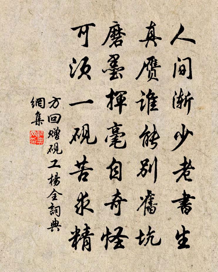 詩詞名句歷史字典書法欣賞書法字典國語詞典說文解字康熙字典古漢語字典標 題 作 者 詩 句 贈硯工楊全作者:方回 朝代:宋代贈硯工楊全原文人間漸少老書生,真贗誰能別舊坑。磨墨揮毫自奇怪,可須一硯苦求精。詩詞問答問:贈硯工楊全的作者是誰?答:方回問:贈硯工楊全寫於哪個朝代?答:宋代方回贈硯工楊全書法欣賞贈硯工楊全書法作品詩詞推薦予寓邑中與諸子講學巨山姪孫轉示初冬書事因范成大〔宋代〕霜風幾夕報初寒,蟋蟀歸來已四遷。舊物有氈眠軟暖,講堂逢鱓饋新鮮。功名久已遺清老,征戍何由及晚年。暴客讀康節詩盧梅坡〔宋代〕先生樂處少人知,最是生平不皺眉。身世帝王全盛日,風光伊洛太平時。畫前勘破先天易,醉後吟成擊壤詩。高臥明德皇太后輓歌詞五首楊億〔宋代〕太姒徽音盛,長秋命數崇。黃圖分丙殿,玄象應軒宮。紀注無窮美,聲詩內助功。雲陽復土後,陵柏自悲風。天闕山絕句徐鉉〔唐代〕散誕愛山客,淒涼懷古心。寒風天闕晚,盡日倚軒吟。再如蒲圻二首王炎〔宋代〕雲暝雨將雪,天低風正寒。簡書端可畏,行李不遑安。要路飛騰好,窮途進取難。折腰徒自苦,吾亦悔儒冠。詩一首魏野〔宋代〕城裡爭看城外花,獨來城裡訪僧家。辛勤旋覓新鑽火,為我親烹嶽麓茶。南徐春日懷古楊乘〔唐代〕六代驕奢地,三春物象繁。靈湖通漲海,天塹隔中原。曉渡高帆駛,陰風巨艦翻。旌旗西日落,戈甲夏雲屯。豹變次許表兄韻馬廷鸞〔宋代〕物換星移一慨然,天荒地老斷鰲前。豈無志士王官谷,亦有飛仙太華巔。我若加三逢本命,君今過一漸稀年。兩人蘭二首唐彥謙〔唐代〕清風搖翠環,涼露滴蒼玉。美人胡不紉,幽香藹空谷。謝庭漫芳草,楚畹多綠莎。於焉忽相見,歲晏將如何?求自試竇常〔唐代〕仙禁祥雲合,高梧彩鳳游。沈冥求自試,通鑑果蒙收。文墨悲無位,詩書誤白頭。陳王抗表日,毛遂請行秋。雙劍惠政橋孫應鳳〔宋代〕百仞崖邊有此橋,地平路穩玉聰驕。惠而知政今如此,拈起橋名問國僑。李斯井賈島〔唐代〕井存上蔡南門外,置此井時來相秦。斷綆數尋垂古甃,取將寒水是何人。天香嶺陳岩〔宋代〕日邊有詔起徵君,遙望長安隔萬雲。一炷清香天在上,徵君只欲斷知聞。有感羅公升〔宋代〕車騎將軍結束新,長安那記昔年身。南來儘是乾名者,無復平陽下淚人。龍首黃扉老大臣,婆娑聽履上星辰。西風句劉洞〔唐代〕千里長江皆渡馬,十年養士得何人。翻憶潘郎章奏內,愔愔日暮好沾巾。百骸同草木,萬象入心靈。冬暮客中王鎡〔宋代〕典盡寒衣未得歸,客囊惟有帶來詩。夜深月照回家夢,怕殺梅花笛又吹。雨蘇軾〔宋代〕風師挾帝令,號呼肆徂征。雲師畏推逐,蓄意不敢爭。雨師曠厥官,所苟朝夕生。帝眷一夕回,旱識旦暮行。翻然了淨歸天竺寺宋祁〔宋代〕曉原霜重俊鷹肥,一席歸風路不迷。林下會徒從霧合,海邊停梵見潮低。霜籃烹茗尋前圃,雨屐粘苔認故蹊。知有過廣愛寺,見三學演師,觀楊惠之塑寶山、朱蘇軾〔宋代〕朱瑤唐晚輩,得法尚雄深。滿寺空遺蹟,何人識苦心。長廊欹雨腳,破壁撼鍾音。成壞無窮事,他年復吊今。丁酉除夕陸游〔宋代〕浮生過五十,光景如飛鴻;寒暑俛仰間,四序忽已終。殊方感漂泊,晚境嗟龍鍾。桃符輿爆竹,嬾復隨兒童。不寐名句推薦願妾身為紅菡萏。年年生在秋江上。歐陽修《漁家傲·近日門前溪水漲》 去年今日此門中,人面桃花相映紅。崔護《題都城南莊》 晚日金陵岸草平,落霞明,水無情歐陽炯《江城子·晚日金陵岸草平》 海畔尖山似劍鋩,秋來處處割愁腸。柳宗元《與浩初上人同看山寄京華親故》 昨夢西湖,老扁舟身世。吳文英《拜星月慢·林鐘羽姜石帚以盆蓮數十置中庭宴客其中》 好一似食盡鳥投林,落了片白茫茫大地真乾淨。曹雪芹《紅樓夢·第五回》 寒日蕭蕭上瑣窗,梧桐應恨夜來霜。李清照《鷓鴣天·寒日蕭蕭上瑣窗》 梅以曲為美,直則無姿;龔自珍《病梅館記》 去年離別雁初歸,今夜裁縫螢已飛。張紘《閨怨 / 怨詩》 仰天大笑出門去,我輩豈是蓬蒿人。李白《南陵別兒童入京》