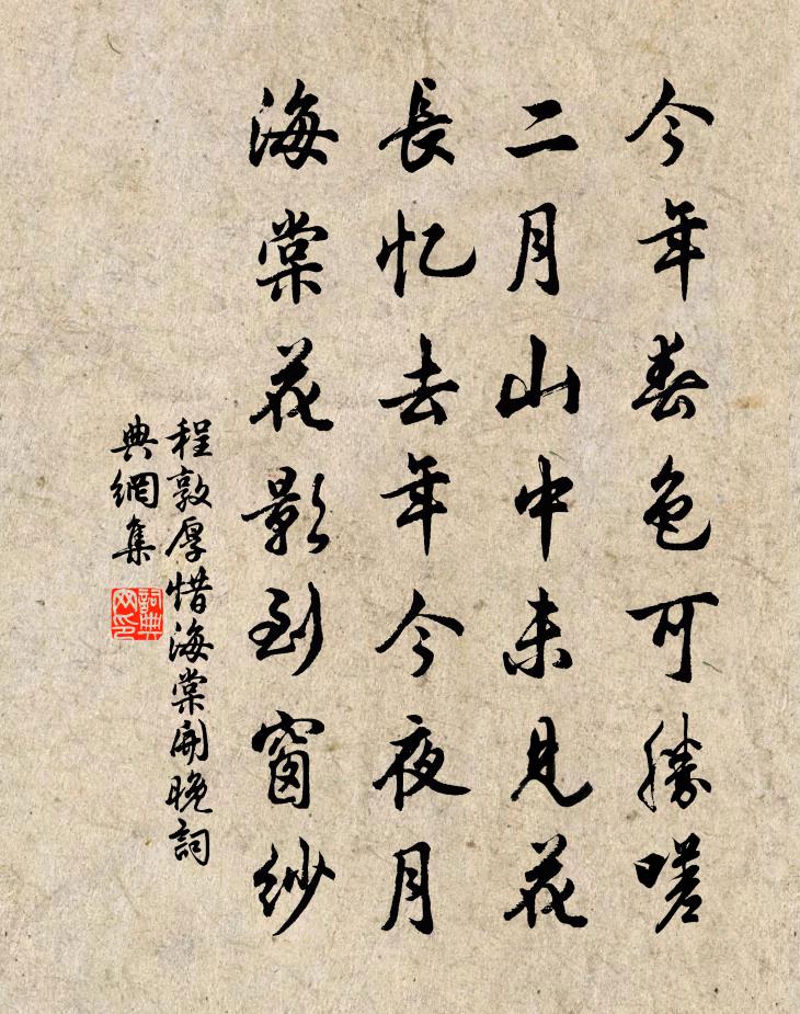 詩詞名句歷史字典書法欣賞書法字典國語詞典說文解字康熙字典古漢語字典標 題 作 者 詩 句 惜海棠開晚作者:程敦厚 朝代:宋代惜海棠開晚原文今年春色可勝嗟,二月山中未見花。長憶去年今夜月,海棠花影到窗紗。詩詞問答問:惜海棠開晚的作者是誰?答:程敦厚問:惜海棠開晚寫於哪個朝代?答:宋代程敦厚惜海棠開晚書法欣賞惜海棠開晚書法作品詩詞推薦女冠子(大石調)柳永〔宋代〕斷雲殘雨。灑微涼、生軒戶。動清籟、蕭蕭庭樹。銀河濃淡,華星明滅,輕雲時度。莎階寂靜無睹。幽蛩切切秋吟浣溪沙朱敦儒〔宋代〕碧玉欄乾白玉人。倚花吹葉忍黃昏。蕭郎一去又經春。眉澹翠峰愁易聚,臉殘紅雨淚難勻。纖腰減半綠羅裙。蠟梅十五絕和陳天予韻唐仲友〔宋代〕袂剪黃羅亦可人,君詩剩覓小園春。最憐丈室銅瓶里,獨對維摩似病身。和楊高品馬廄猢猻梅堯臣〔宋代〕嘗聞養騏驥,辟惡系獼猴。供春新教藝,將軍舊病偷。聊看緣柱杪,尚想傍崖頭。更祝南州使,如拳試為求。送梁府教赴括蒼任趙恬齋〔宋代〕聞得官期三月初,此行最喜奉潘輿。杏花風暖好覓句,槐影日長宜讀書。垂世文章星有斗,隨緣富貴水成渠。少須題秋浦亭陳舜俞〔宋代〕牢落真秋浦,江山滯客舟。身同雁南去,心似水東流。鷗鳥荒煙里,漁人古渡頭。只因山色好,來上九華樓。句呂蒙正〔宋代〕挑盡寒燈夢不成。送劉德修殿院直閣將漕潼川二首楊萬里〔宋代〕烏府何緣著佞臣,紫皇親擢得斯人。金冊半粒回元氣,玉宇祟朝作好春。不惜孤身輕一葉,坐令九鼎重千鈞。萬生和陽秀才惠詩七絕杜范〔宋代〕事已垂成慮正長,民風安得反醇龐。交征上下方旁午,何以為謀淑此邦。燈夕當三日而罷今至四月五日國人尚紛然出遊毛滂〔宋代〕廉織飛雨為誰休,爛漫懸燈總未收。自是一年無嘆息,不妨五夕得嬉遊。後車鶯燕春聲軟,前騎熊羆夜氣遒。兩行采芹亭方蒙仲〔宋代〕短帽輕衫亦復家,前村後陌柳初花。不須多學舞雩興,隨分春光管領些。寄劉彥炳魯交〔宋代〕征旆遙分苑路西,馬蹄春去戈陽溪。相思欲和鳥啼曲,一拂瑤弦意總迷。客路和胡元魯出入韻釋斯植〔宋代〕十載天涯客,浮雲不定身。煙波春雨渡,燈火夜漁村。世事空為累,人心未覺仁。何時留片石,歸老石松根。頌古九十八首釋印肅〔宋代〕令導禪和翠微峰,鐵壁銅牆路不同。遙指雙林是歸處,至今猶尚鬼侗通。送徐州簽判李廷評梅堯臣〔宋代〕曩者初見君,同來許昌幕。今雖俱服除,獨得王粲樂。山東寇盜息,沛上風物博。主人況豪英,樽俎不落莫。行行賢八詠謝安圍碁姚勉〔宋代〕安石廊廟姿,豈不嫻將略。氐奴驚偉人,良已先得著。憩妙因寺華岳〔宋代〕蕭寺寒山外,崎嶇一徑幽。斷雲迎客入,曲水護堤流。木石四時古,軒窗五月秋。午煩聊小憩,拂石為支頭。上同州使君伯王昌齡〔唐代〕大賢本孤立,有時起絲綸。伯父自天稟,元功載生人。紹興以後蜡祭四十二首佚名〔宋代〕禮備樂成,澹然將歸。其留消搖,象興已轉。偃蹇俗驤,羽毛紛委。忽乘杳冥,遺此福祉。客中懷西湖二首董嗣杲〔宋代〕一日無詩氣還濁,百年有限身更孱。西湖多少好風月,何時買屋安蕭閒。名句推薦閒鷺棲常早,秋花落更遲。錢起《谷口書齋寄楊補闕》 且欲近尋彭澤宰,陶然共醉菊花杯。崔曙《九日登望仙台呈劉明府容》 流水孤村,荒城古道。陳霆《踏莎行·晚景》 紫泉宮殿鎖煙霞,欲取蕪城作帝家。李商隱《隋宮》 粉墮百花洲,香殘燕子樓。曹雪芹《唐多令·柳絮》 合軍聚眾, 務在激氣孫臏《孫臏兵法·延氣》 君子修道立德,不謂窮困而改節佚名《孔子家語·在厄》 今夜不知何處宿,平沙萬里絕人煙。岑參《磧中作》 君子懷德,小人懷土;君子懷刑,小人懷惠。孔子弟子《論語·里仁篇》 新帖繡羅襦,雙雙金鷓鴣。溫庭筠《菩薩蠻·小山重疊金明滅》