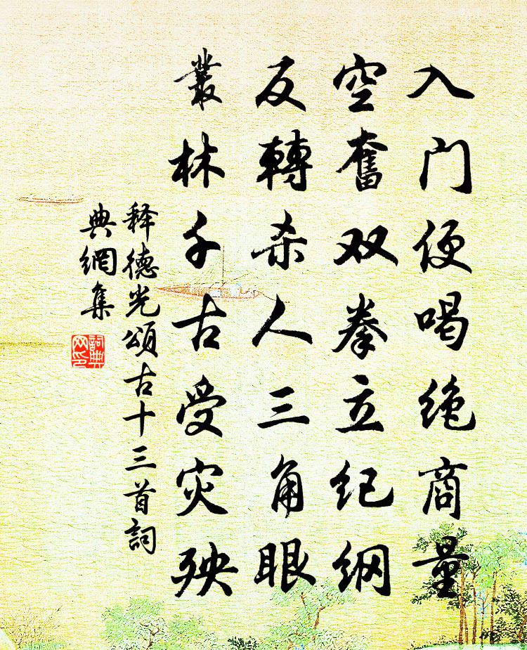 詩詞名句歷史字典書法欣賞書法字典國語詞典說文解字康熙字典古漢語字典標 題 作 者 詩 句 頌古十三首作者:釋德光 朝代:宋代頌古十三首原文入門便喝絕商量,空奮雙拳立紀綱。反轉殺1/1人三角眼,叢林千古受災殃。詩詞問答問:頌古十三首的作者是誰?答:釋德光問:頌古十三首寫於哪個朝代?答:宋代釋德光頌古十三首書法欣賞頌古十三首書法作品詩詞推薦寄懷二十首趙蕃〔宋代〕秋風常恐到無期,一雨便興搖落悲。痴病相攻今轉甚,囊空何以致高醫。句元絳〔宋代〕何人更得通天帶,謀合君心只晉公。小重山·花院深疑無路通賀鑄〔宋代〕花院深疑無路通。碧紗窗影下,玉芙蓉。當時偏恨五更鐘。分攜處,斜月小簾櫳。楚夢冷沈蹤。一雙金縷枕,半床題坡公贈鄭介夫詩三首劉克莊〔宋代〕下吏語尤硬,投荒身轉輕。不然玉局老,肯喚作先生。劉蛻唐大中時人文冢在兜率寺予嘗讀孫樵自序李流謙〔宋代〕詔書嘗下大中朝,不聞稱蛻但稱樵。犧樽棄溝俱害性,此理要以達觀超。封文為冢嬉笑怒,恚不人知妨鬼妒。高岸偈頌七十二首釋祖欽〔宋代〕無影枝頭一點春,笑他無地可藏。黃金自有黃金價,何秘和沙賣與人。寄李闔舍連文鳳〔宋代〕楚樹吳雲隔風塵,相思兩地各傷神。悠悠歲月多華發,歷歷江山少故人。苔屋不來今日雨,草地長夢舊家春。便鴻賦新繁周表權如詔亭陳昂〔明代〕封典寵岩穴,褒言華日星。其誰盡如詔,何暇更名亭。公昔善教子,家傳惟治經。當年雲榜揭,今日璽書形。籍已哭張十八校書(數日前辱書,未及還答,俄承凶訃)權德輿〔唐代〕芸閣為郎一命初,桐州寄傲十年餘。魂隨逝水歸何處,名在新詩眾不如。蹉跎江浦生華髮,牢落寒原會素車。更憶贈趙當可王灼〔宋代〕晚交得王孫,每見心輒醉。平生虎豹韜,近者詩酒累。流光迫壯懷,撫事我亦欷。不如從君飲,此外談無味。偈頌一百零二首釋慧遠〔宋代〕天書下十詔,雲恩飛九重。萬邦歸正化,千載一遭逢。朝中措洪咨夔〔宋代〕滂葩七十二灘春。鍾瑞石麒麟。流水行雲才思,光風霽月精神。金蕉進酒,斑衣起舞,喜氣津津。群玉峰頭環佩,夏日山中趙汝鐩〔宋代〕瀑近書皆潤,林深簟更涼。山中無一事,夏日覺尤長。木蘭花賀鑄〔宋代〕羅襟粉汗和香浥。纖指留痕紅一捻。離亭再卜合歡期,尋見石榴雙翠葉。危樓欲上危腸怯。縱得鸞膠難寸接。西風偈六十九首釋道寧〔宋代〕晷運推移,日南長至。分明一道恩光,照徹十方三世。全彰諸祖玄關,漏泄衲僧巴鼻。靈雲剛道無疑,彌勒徒夸授三天竺還五首方回〔宋代〕松枝垂地蔭松身,恨不移家此卜鄰。石上一根長數丈,似吾細看更無人。朝中措(四用韻)吳潛〔宋代〕夜來夢繞宛溪乾。啼鴂夢中酸。過了他鄉寒食,白鷗劃地盟寒。雲溪雨壑,月颱風榭,借與人看。得似野僧無系,夏日雜題陸游〔宋代〕身閒欲出無如嬾,酒薄雖傾不敵愁。殘暑從今無一月,剩儲詩思待新秋。絕句三首劉克莊〔宋代〕定本蘭亭傳贗久,黨公姜字發蒙初。兒童若問何人寫,向道樗翁八十餘。與張十八同效阮步兵一日復一夕韓愈〔唐代〕一日復一日,一朝復一朝。只見有不如,不見有所超。食作前日味,事作前日調。不知久不死,憫憫尚誰要。富貴名句推薦雨余溪水掠堤平,閒看村童謝晚晴。陸游《觀村童戲溪上》 其人雖已沒,千載有餘情。陶淵明《詠荊軻》 一年春又盡,倚杖對斜暉。左緯《春晚》 凡出言,信為先。詐與妄,奚可焉?李毓秀《弟子規·信》 又是過重陽,台榭登臨處,茱萸香墜。李煜《謝新恩·冉冉秋光留不住》 終日望君君不至,舉頭聞鵲喜。馮延巳《謁金門·風乍起》 酒酣應對燕山雪,正冰河月凍,曉隴雲飛。周密《高陽台·送陳君衡被召》 料峭春風吹酒醒,微冷,山頭斜照卻相迎。蘇軾《定風波·三月七日》 疏籬下、試覓重陽,醉擘青露菊。吳文英《一寸金·秋感》 贈遠虛盈手,傷離適斷腸。李商隱《十一月中旬至扶風界見梅花》
