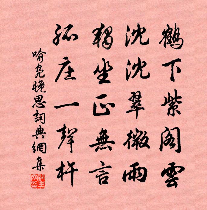 詩詞名句歷史字典書法欣賞書法字典國語詞典說文解字康熙字典古漢語字典標 題 作 者 詩 句 晚思作者:喻鳧 朝代:唐代晚思原文鶴下紫閣雲,沈沈翠微雨。獨坐正無言,孤莊一聲杵。詩詞問答問:晚思的作者是誰?答:喻鳧問:晚思寫於哪個朝代?答:唐代問:晚思是什麼體裁?答:五絕喻鳧晚思書法欣賞晚思書法作品注釋全唐詩:卷543-56詩詞推薦雜詠一百首善財劉克莊〔宋代〕放勛訪吾叔,魯叟問弘聃。所以此童子,諸方亦遍參。章和二年中李賀〔唐代〕雲蕭索,田風拂拂,麥芒如彗黍如粟。關中父老百領襦,關東吏人乏詬租。健犢春耕土膏黑,菖蒲叢叢沿水脈。殷題苕溪漁隱圖胡仔〔宋代〕溪邊短短長長柳,波上來來去去船。鷗鳥近人渾不畏,一雙飛下鏡中天。秋宿長安韋主簿廳李洞〔唐代〕水木清涼夜直廳,愁人樓上唱寒更。坐勞同步簾前月,鼠動床頭印鎖聲。奉酬禮部閣老轉韻離合見贈(時為秘書監)張薦〔唐代〕移居既同里,多幸陪君子。弘雅重當朝,弓旌早見招。植根瓊林圃,直夜金閨步。勸深子玉銘,力競相如賦。間闊隱靜山二首韓元吉〔宋代〕海上蟠桃手自栽,紅塵一墮隔蓬萊。風帆弱水無由到,乞我當年渡海杯。高陽台 題張德機荊南精舍圖謝應芳〔元代〕陽羨溪山,輞川煙雨,隱然畫裡觀詩。芳草王孫,別來幾度春歸。最憐屋壁藏蝌蚪,化劫灰、飛入昆池。好階墀。五字疊韻詩蕭衍〔南北朝〕後牖有榴柳。梁王長康強。偏眠船舷邊。載匕每礙埭。六斛熟鹿肉。嗼蘇姑枯盧。自遣四首張耒〔宋代〕是非得失一區區,蚊蚋啾啾共一壺。不學退之求羽翼,惟憑一夢到華胥。磨鐵羅漢贊釋了惠〔宋代〕磨礲分寸工夫,建立針鋒世界。尚欠些子合尖,且待石頭爛壞。水調歌頭·落日古城角辛棄疾〔宋代〕落日古城角,把酒勸君留。長安路遠,何事風雪敝貂裘。散盡黃金身世,不管秦樓人怨,歸計狎沙鷗。明夜扁舟去九月十日即事李白〔唐代〕昨日登高罷,今朝更舉觴。菊花何太苦,遭此兩重陽。塞翁吟趙文〔宋代〕坐對梅花笑,還記初度年時。名利事,總成非。漫老矣何為。吳山夜月閩山霧,回首鬢影如絲。懶更問,鬥牛箕。醉落魄張元乾〔宋代〕改XD5E溪蹤跡。此生已是天涯隔。投老誰知,還作三吳客。故人怪我疏髯黑。醉來猶似丁年日。光陰未肯成虛再和林寶文三絕王炎〔宋代〕要知好雨自何來,和氣連雲撥不開。廊廟為霖須妙手,即看力斡大鈞回。送胡提乾陳宓〔宋代〕奇琛環贐滿桐城,中有清冰一段明。靜室只知心可養,當官底患志難行。三年兩度承嘉話,百里無因訴別情。預想春閨羅鄴〔唐代〕愁坐蘭閨日過遲,捲簾巢燕羨雙飛。管弦樓上春應在,楊柳橋邊人未歸。玉笛豈能留舞態,金河猶自浣戎衣。梨花【雙調】水仙子張養浩〔元代〕六十相近老形骸,安樂窩中且避乖。高竿上伎倆休爭賽,早回頭家去來。對華山翠壁丹崖,將小闊闊書房蓋。綠巍貴州虞部使君訪及道舊竊有感惻因成小詩王安石〔宋代〕韶山秀拔江清寫,氣象還能出搢紳。當我垂髫初識字,看君揮翰獨驚人。郵簽忽報旌麾入,齋合遙瞻組綬新。握手游秀府擇勝園周端臣〔宋代〕擇勝前朝錫雅名,不多花木四時榮。樓當列岫仍臨水,地此諸園最傍城。池暖錦鱗冬亦泳,洞寒丹鶴曉先鳴。宗王名句推薦萬里雲間戍,立馬劍門關。崔與之《水調歌頭·題劍閣》 解釋春風無限恨,沉香亭北倚闌乾。李白《清平調·其三》 天寒水鳥自相依,十百為群戲落暉。秦觀《還自廣陵》 悵望倚危欄,紅日無言西下。張昪《離亭燕·一帶江山如畫》 我醉欲眠卿且去,明朝有意抱琴來。李白《山中與幽人對酌》 歲暮鋤犁傍空室,呼兒登山收橡實。張籍《野老歌 / 山農詞》 遙憶獨眠人,早寒驚夢頻。顧貞觀《菩薩蠻·山城夜半催金柝》 一時寵利有盡,千秋青史難欺。張廷玉《明史·列傳·卷一百三十三》 何須急管吹雲暝,高寒灩灩開金餅。高觀國《菩薩蠻·何須急管吹雲暝》 念去去,千里煙波,暮靄沉沉楚天闊。柳永《雨霖鈴·寒蟬淒切》