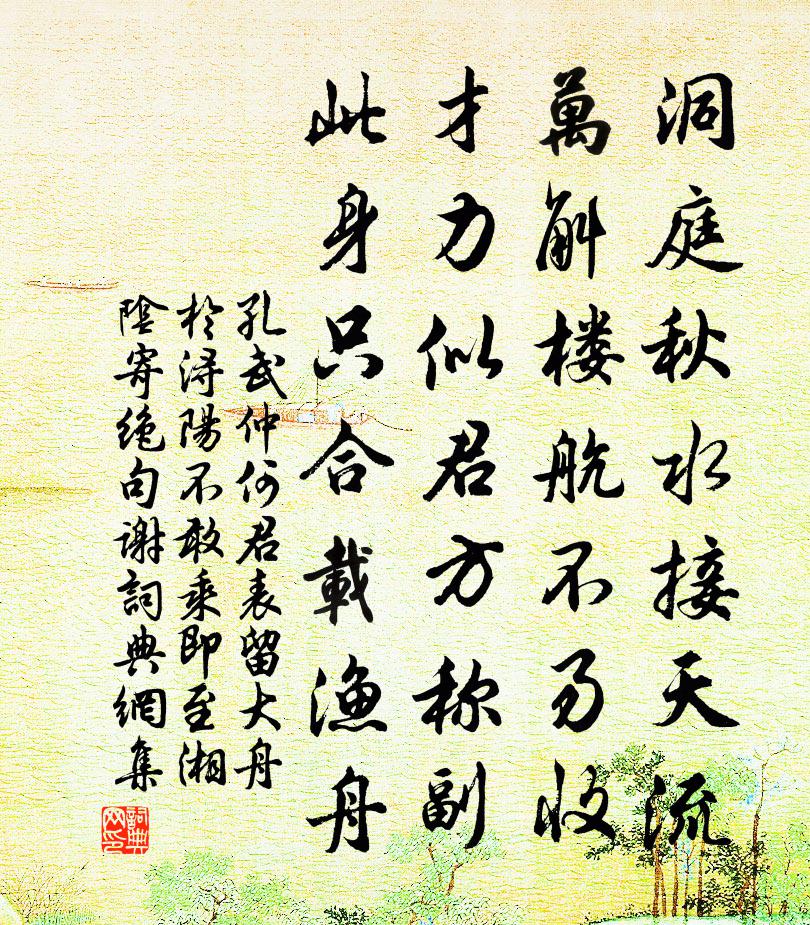詩詞名句歷史字典書法欣賞書法字典國語詞典說文解字康熙字典古漢語字典標 題 作 者 詩 句 何君表留大舟於潯陽不敢乘即至湘陰寄絕句謝作者:孔武仲 朝代:宋代原文洞庭秋水接天流,萬斛樓航不易收。才力似君方稱副,此身只合載漁舟。詩詞問答問:《何君表留大舟於潯陽不敢乘即至湘陰寄絕句謝》的作者是誰?答:孔武仲問:該詩寫於哪個朝代?答:宋代書法欣賞何君表留大舟於潯陽不敢乘即至湘陰寄絕句謝書法作品詩文賞析【原題】:何君表留大舟於潯陽不敢乘即至湘陰寄絕句謝之詩詞推薦官定後戲贈(時免河西尉,為右衛率府兵曹)杜甫〔唐代〕不作河西尉,淒涼為折腰。老夫怕趨走,率府且逍遙。耽酒須微祿,狂歌托聖朝。故山歸興盡,回首向風飆。南京種山藥法蔡挺〔宋代〕潤還御水冰霜結,蔭近堯雲雨露骨偏。自裹自題還自愧,揠苗應笑宋人然。花心動史達祖〔宋代〕風約簾波,錦機寒、難遮海棠煙雨。夜酒未蘇,春枕猶敧,曾是誤成歌舞。半褰薇帳雲頭散,奈愁味、不隨香去。法性寺方信孺〔宋代〕金碧參差兜率天,曾煎訶子試新泉。荒園廢宅無人問,門外桃花卻是禪。橫吹曲江總〔隋代〕簫聲鳳台曲。洞吹龍鍾管。鏜{釒答}漁陽摻。怨抑胡笳斷。同王公佩和老杜韻馮時行〔宋代〕敝屋甫環堵,此君憂面牆。當窗蔽寒綠,入坐薦清涼。客詠閟餘響,佛薰留散香。老成看氣骨,霜雪表靈長。暗香吳潛〔宋代〕曉霜一色。正恁時隴上,征人橫笛。驛史不來,借問孤芳為誰折。休說和羹未晚,都付與、逋仙吟筆。算只是,野玉樓春秦觀〔宋代〕參差簾影晨光動。露桃雨柳矜新寵。閒愁多仗酒驅除,春思不禁花從臾。倚樓聽徹單于弄。卻憶舊歡空有夢。當時送鎮江張禹功獻邊事未報過建康謀辟曾豐〔宋代〕邊上事千種,袖中書一編。曳裾逢白眼,驤首隔青天。又輟安劉手,而撐訪戴船。嚴公猶欠士,應辟老詩仙。花山魏公園李公異〔宋代〕當年花草徑,滿目舊林亭。無復東山妓,空門苔蘚青。同儕堅挽同游用韻為謝然終不能從也汪炎昶〔宋代〕道人結廬青山巔,如望蓬萊無渡船。石棧天梯俗千仞,流水桃花知幾年。癖佛詩持退之論,入社豈廢淵明賢。亦聞偈頌二百零五首釋正覺〔宋代〕三界無法,何處求心。風生虎嘯,霧起龍吟。泥中有刺,綿里有針。華鳥隔牆相喚甚,十分春事到家林。不墮前後送李君錫學士使契丹弔慰梅堯臣〔宋代〕昨日匈奴來告哀,殿門不識桃花開。今聞君去作吊使,正值雁嗥從北回。風卷黃雲無遠近,山留白雪猶枯荄。歸看許郢州故宅林景熙〔宋代〕讀君丁卯集,想此建橋時。荒草一區宅,清風七字詩。吳雲含靜熊,郢樹寄余悲。落日空懷古,長歌知不知。眼兒媚 醴泉和高齊,遇陽帝故宮。耶律鑄〔元代〕隔江誰唱後庭花。煙淡月籠沙。水雲凝恨,錦帆何事,也到天涯。寄聲衰柳將菸草,且莫怨年華。東君也是,世間隱將峽口占二絕陳文蔚〔宋代〕小似武夷深更幽,地肋九曲一溪流。誅茆結屋雖成左,贏得青山自在游。賀俞婺州除左史林宗放〔宋代〕報政天邊美譽新,十行細札下嚴宸。逢人政爾詢司馬,縱俗何由借寇恂。制勝萬全端有道,折衝一點是精神。向來應提刑以十五日和韻見示再次韻魏了翁〔宋代〕大圓垂象藍群黎,猶送昨宵畏滿詩。要看天行嫌位亢,若言人事惡功虧。升於正處元為利,坎到盈中乃識時。疑我過武夷韓元吉〔宋代〕不到仙山二十年,道人雙鬢亦皤然。卻看翠嶺千尋石,又汎清溪九曲船。目極已高聊自喜,身輕欲上可無緣。只應館中書懷陸游〔宋代〕流落逢明主,恩光集晚途。題名驚手戰,拜閣藉人扶。枉辱三華組,終歸一腐儒。庫書時取讀,猶足補東隅。名句推薦深知身在情長在,悵望江頭江水聲。李商隱《暮秋獨游曲江》 壽酒還嘗藥,晨餐不薦魚。錢起《送外甥懷素上人歸鄉侍奉》 好面譽人者,亦好背而毀之。莊子《莊子·雜篇·盜跖》 昨夜風兼雨,簾幃颯颯秋聲。李煜《烏夜啼·昨夜風兼雨》 生當復來歸,死當長相思。蘇武《留別妻》 菀菀黃柳絲,濛濛雜花垂。常建《春詞二首》 年年躍馬長安市。客舍似家家似寄。劉克莊《玉樓春·戲林推》 上有青冥之長天,下有淥水之波瀾李白《長相思·其一》 舍心腹而順手足羅貫中《三國演義·第二十三回》 潭州官舍暮樓空,今古無端入望中。李商隱《潭州》