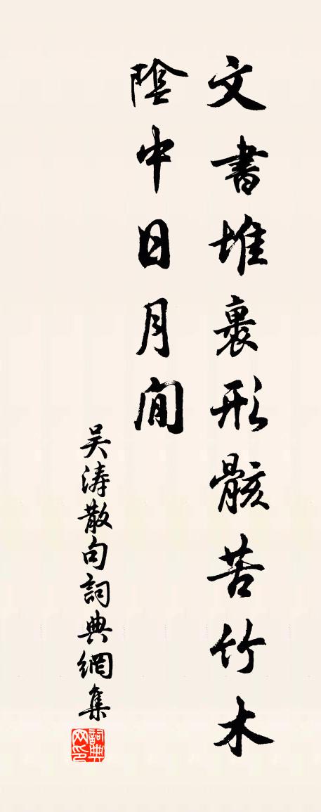 詩詞名句歷史字典書法欣賞書法字典國語詞典說文解字康熙字典古漢語字典標 題 作 者 詩 句 句作者:吳濤 朝代:宋代句原文文書堆裹形骸苦,竹木陰中日月閒。詩詞問答問:句的作者是誰?答:吳濤問:句寫於哪個朝代?答:宋代問:句是什麼體裁?答:句吳濤句書法欣賞句書法作品詩詞推薦立夏薛澄〔宋代〕漸覺風光燠,徐看樹色稠。蠶新教織綺,貂敝豈辭裘。酷有煙波好,將圖荷芰游。田間讀書處,新筍萬竿抽。塔子菊史鑄〔宋代〕金彩煌煌般若花,高蟠層級巧堪夸。更添佛頂周遭種,成此良緣勝聚沙。沖谷過予晏齋趙蕃〔宋代〕夢裡春歸去,榴花晚欲然。窗晴書味熟,竹密鳥聲圓。多病妨搜句,逢人懶問禪。澹然無可語,危坐了爐煙。林元美司戶耕樂亭陳俊卿〔宋代〕天地秘絕景,雅屬幽人居。卜築俯清流,曠然心目舒。豈惟水澄碧,山色佳有餘。涼風左右來,竹柏相扶疏。亭中述懷有作陳造〔宋代〕青奴白牯共幽情,鷺雙鷗雙自舊盟。家視子平如已死,世嗤張翰不求名。馬牛見命從浮俗,螟蠃觀傍得此生。千載貽長松寺慈禪師李流謙〔宋代〕一年山色好相看,欲去仍來倍黯然。大士初無留客意,幽人更結住山緣。梨花村落清明後,梅子園林五月前。我已霜徐夤〔唐代〕應節誰窮造化端,菊黃豺祭問應難。紅窗透出鴛衾冷,白草飛時雁塞寒。露結芝蘭瓊屑厚,日乾葵藿粉痕殘。世間出塞王安石〔宋代〕涿州沙上飲盤桓,看舞春風小契丹。塞雨巧催燕淚落,蒙蒙吹濕漢衣冠。句石東震〔宋代〕門前碧蘸一溪斜,仿佛逃秦處士家。再題州宅張伯玉〔宋代〕昔覽微之州宅篇,待將屏障寫山川。更看白傅明月句,欲上高樓跨紫煙。盤紆星斗旁六郡,零落風騷三百年。喬木灩澦堆蘇轍〔宋代〕江中石屏灩澦堆,鱉靈夏禹不能摧。深根百丈無敢近,落日紛紛鳧雁來。何人磊落不畏死,為我赤腳登崔嵬。上有餈韻楊公濟奉議梅花十首蘇軾〔宋代〕綠髮尋春湖畔回,萬松嶺上一枝開。而今縱老霜根在,得見劉郎又獨來。春暮詠懷寄集賢韋起居袞鄭谷〔唐代〕寂寂風簾信自垂,楊花筍籜正離披。長安一夜殘春雨,右省三年老拾遺。坐看群賢爭得路,退量孤分且吟詩。五湖以六經左氏傳莊子遺伯中第有詩來謝次韻樓鑰〔宋代〕手披欲究百家編,奴婢年來識鄭玄。顧我幸多千卷富,念君未有一經全。詩書心醉不容醒,父子筆耕期有年。此但水龍吟(慶齊年諸丈)危稹〔宋代〕洛陽九老圖中,當時司馬年猶小。爭如今夕,舉杯相勸,十人齊壽。已幸同庚,何分雌甲,本無多少。但有頭可白開福寺趙汝譡〔宋代〕蕭辰款招提,近郭野趣深。廣池映茂樹,秋水涵夕陰。及茲塵事暇,誰與同幽襟。竹密隱江艇,荷衰淨雲岑。暑宮寫懷二首周文璞〔宋代〕往時陸荊門,自是天下雄。徒隸解散盡,何處尋樊翁。遂令一世士,默默逃虛空。至今大堤上,葉葉皆春風。眼兒媚(綠箋)薛夢桂〔宋代〕碧筒新展綠蕉芽。黃露灑榴花。蘸煙染就,和雲捲起,秋水人家。只因一朵芙蓉月,生怕黛簾遮。燕銜不去,雁飛書懹陸游〔宋代〕愁向東華蹋軟紅,暫歸舊隱樂無窮。石池洗藥涓涓水,漁艇投竿嫋嫋風。盡日醉醒菱唱里,鄰家來往竹陰中。何須安大使生日魏了翁〔宋代〕往年天壓西南垂,妖氛內訌胡塵飛。梟狐陸梁士扼腕,蜀山慘澹無光輝。公以空弮嬰乳虎,漠漠黃雲暗平楚。直將名句推薦江湖多風波,舟楫恐失墜。杜甫《夢李白二首·其二》 君使臣以禮,臣事君以忠。孔子弟子《論語·八佾篇》 玉碗冰寒滴露華,粉融香雪透輕紗。晏殊《浣溪沙·玉碗冰寒滴露華》 前經洛陽陌,宛洛故人稀。王維《送魏郡李太守赴任》 看破的,遁入空門;痴迷的,枉送了性命。曹雪芹《紅樓夢·第五回》 君言不得意,歸臥南山陲。王維《送別》 北極懷明主,南溟作逐臣。宋之問《途中寒食題黃梅臨江驛寄崔融》 君子敬其在己者,而不慕其在天者,是以日進也。荀子《荀子·天論》 繡嶺宮前鶴髮翁,猶唱開元太平曲李洞《繡嶺宮詞》 李白能詩復能酒,我今百杯復千首。唐寅《把酒對月歌》