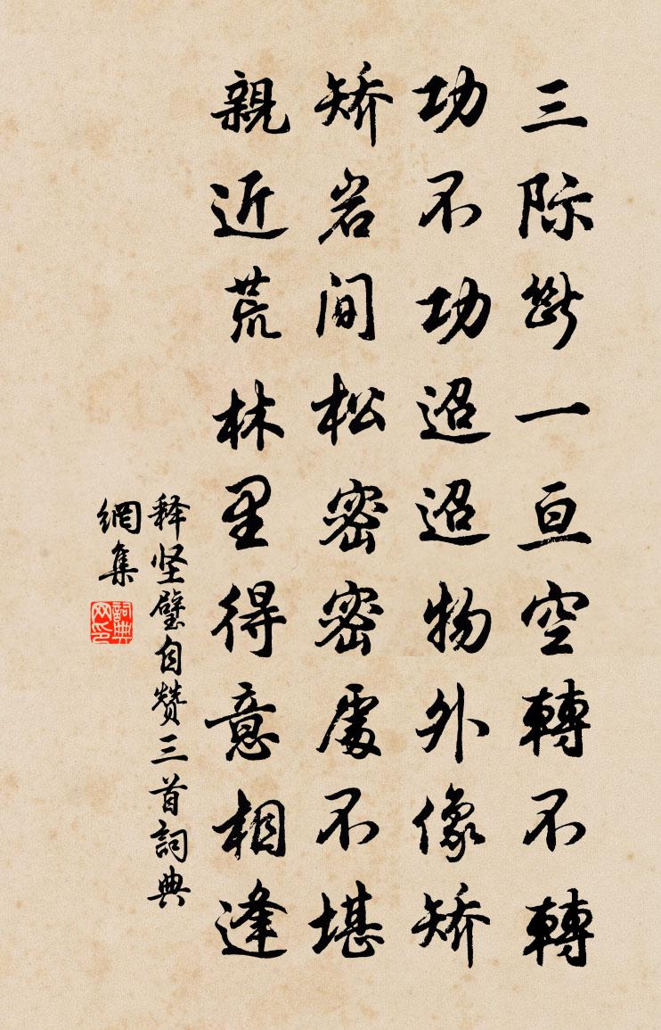 詩詞名句歷史字典書法欣賞書法字典國語詞典說文解字康熙字典古漢語字典標 題 作 者 詩 句 自贊三首作者:釋堅璧 朝代:宋代自贊三首原文三際斷,一亘空。轉不轉,功不功。迢迢物外像,矯矯岩間松。密密處不堪親近,荒林里得意相逢。詩詞問答問:自贊三首的作者是誰?答:釋堅璧問:自贊三首寫於哪個朝代?答:宋代釋堅璧自贊三首書法欣賞自贊三首書法作品詩詞推薦九鎖山十詠翠蛟亭鄧牧〔宋代〕寒{石問}豈成蛟,流泉亦非翠。色緣映帶得,意出飛舞外。雖無風霆化,自與江海會。泛舟潏水君俞用韓泛南溪韻作詩三首遂和李復〔宋代〕出城泛南溪,朝暮可往返。東西韋杜間,尺五天不遠。舟轉皇陂曲,岸帶青龍坂。夷猶一篙足,不待雙絙挽。回臨阮郎歸王哲〔元代〕驀然撞著阮郎公。無何兩目紅。盈盈翳膜礙非通。如何見寶瞳。真妙藥,便修崇。良醫顯行功。金篦一刮真緣空。次潁叟弟送行韻蘇泂〔宋代〕相傳衣缽已分明,早覺詩含鮑謝情。心腹於人惟有弟,襟懷無我獨非兄。偶隨江路帆孤往,便憶梅窗酒對傾。歲晚挽廬陵葛孝子母夫人曾豐〔宋代〕笄珥初歸室,繅紉共起家。清風依玉樹,和氣茁蘭芽。送子歸黃壤,收名入白華。大書彤史上,誰謂過於夸。三橋旅邸遇雪方回〔宋代〕醞雲蒸霧暖如烘,一夜南風變北風。不似尋常響窗紙,漸驚分寸壓船蓬。粉妝已斗佳人白,酒面還輸老子紅。記取懷舊劉克莊〔宋代〕蚤從南浦晚南塘,二老聯翩返帝旁。天上廢雲誰屬和,斗間紫氣久無光。已埋玉樹難扶起,所寶銀鉤永襲藏。老去狀江南仲冬呂渭〔唐代〕江南仲冬天,紫蔗節如鞭。海將鹽作雪,出用火耕田。滿江紅佚名〔宋代〕斗帳高眠,寒窗靜、瀟瀟雨意。南樓近、更移三鼓,漏傳一水。點點不離楊柳外,聲聲只在芭蕉里。也不管、滴破大能仁寺劉學箕〔宋代〕規模應甲剎,殿閣擁金仙。歲歉炊煙絕,城低野色連。客僧皆散去,主者獨安眠。成毀難逃數,山門八百年。顧野王讀書堆錢良臣〔宋代〕伊昔邊烽備不虞,太平移作梵王居。而今江表全無事,借我三椽更讀書。寄題俞伯南所居野處陳文蔚〔宋代〕岩築無外求,莘耕有餘樂。既為堯舜民,自抱羲農朴。總言三首賈似道〔宋代〕其中奧妙細談推,依此之中必作魁。三分之中曉得一,常常得勝帶花回。次李司直韻二首裘萬頃〔宋代〕清虛絕跡竟何為,自笑平生頗好之。正路儻非君得似,冥行未免用多歧。如夢令譚處端〔元代〕日用靈光內鎖。保護真心不破。金玉得凝澄,生死無由近我。功果。功果。歸去獨攜雲朵。九月十八日至山園是日頗有春意陸游〔宋代〕烏藤真好友,伴我出荊扉。落葉紛如積,鳴禽暖不歸。露濃松鬣長,土潤術苗肥。未盡幽尋興,還家趁夕暉。辛卯元日三首方回〔宋代〕回首同庚五歲孫,老夫老矣尚何言。一生酒債兼詩債,數畝花園半菜園。雨濘謂難來賀客,馬嘶誰忽顧閒月。倏無鷓鴣鄧剡〔宋代〕行不得也哥哥。瘦妻弱子羸牸馱,天長地闊多網羅。南音漸少北音多,肉飛不起可奈何。行不得也哥哥。挽閣門唐中齋何夢桂〔宋代〕英州別駕老昭陵,尚有錢塘八代孫。三略兵書生未識,百篇詩史死猶存。羊公峴首行人淚,白傳龍門過客樽。盂飯次韻俞子文感事朱長文〔唐代〕我曾折桂向蟾宮,君有文華似彩虹。連蹇未酬平日願,笑歌猶得故鄉同。不才甘作耕岩叟,有志宜為結駟翁。窮達名句推薦楚天千里清秋,水隨天去秋無際。辛棄疾《水龍吟·登建康賞心亭》 假金方用真金鍍,若是真金不鍍金。李紳《答章孝標》 善為吏者樹德,不善為吏者樹怨。韓非及後人《韓非子·外儲說左下》 風蕭蕭兮易水寒,壯士一去兮不復還。佚名《荊軻歌 / 渡易水歌》 古木陰中系短篷,杖藜扶我過橋東。志南《絕句》 久在樊籠里,復得返自然。陶淵明《歸園田居·其一》 人生到處知何似,應似飛鴻踏雪泥。蘇軾《和子由澠池懷舊》 空山不見人,但聞人語響。王維《鹿柴》 俄而未霰零,密雪下。謝惠連《雪賦》 鄉書不可寄,秋雁又南回。韋莊《章台夜思》