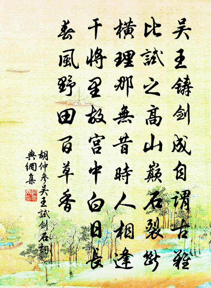 詩詞名句歷史字典書法欣賞書法字典國語詞典說文解字康熙字典古漢語字典標 題 作 者 詩 句 吳王試劍石作者:胡仲參 朝代:宋代吳王試劍石原文吳王鑄劍成,自謂古難比。試之高山巔,石裂斷橫理。那無昔時人,相逢干將里。故宮中白日長,春風野田百草香。詩詞問答問:吳王試劍石的作者是誰?答:胡仲參問:吳王試劍石寫於哪個朝代?答:宋代胡仲參吳王試劍石書法欣賞吳王試劍石書法作品詩詞推薦依韻和吳七丈詠雪二首強至〔宋代〕江邊玉樹渾無地,世上銀河自有橋。宿凍即交山口路,冷波應減海門潮。當年右席辭空在,今日扁舟興轉遙。寬褐入貴池逢張秀夫董嗣杲〔宋代〕風姿欣邂逅,彼此略寒暄。為客那知老,相看不忍言。湖魚朝上市,驛鼠夜穿垣。共爾添貧病,攢眉說故園。禪人並化主寫真求贊釋正覺〔宋代〕傳之失真,體之而神。明白智圓而有照,清虛理極而無身。心萌法法,影落塵塵,一段精光華上春。金盞子趙以夫〔宋代〕得水能仙,似漢皋遺佩,碧波寒月。藍玉暖生煙,稱縞袂黃冠,素姿芳潔。亭亭獨立風前,照冰壺澄徹。當時事,謝僧寄拄杖謝邈〔唐代〕峭壁猿啼采處深,一枝奇異出孤岑。感師千里寄來意,發我片雲歸去心。窗外冷敲檐凍折,溪邊閒點戲魚沈。他年夏夜月下獨酌二首楊萬里〔宋代〕誰道今年熱,今宵分外清。竹風秋九夏,溪月書三更。此景天慳與,無人酒自傾。明朝火織上,別作一經營。偈頌六十八首釋法薰〔宋代〕百尺竿頭行闊步,紫羅帳裹撒真珠。山僧贏得呵呵笑,未審諸人會無人。奉和御製龍圖等閣觀三聖御書詩司馬光〔宋代〕積厚丕丕業,重光鬱郁文。寶書長列宿,玉字切浮雲。散帙鳴鑾駐,充庭雜佩分。願移天縱藝,似續聖功勤。昝元帥相拉浣花溪泛舟汪元量〔宋代〕行都元帥千蹄馬,腰佩角弓箭盈把。浣花溪頭具小舟,擊鼓 * 行酒斝。舞腰嬝娜錦纏頭,風吹金縷隨東流。公孫瑞鷓鴣佚名〔宋代〕臨鸞常恁整妝梅。枝枝仙艷月中開。可殺天心、故與多端麗,那更羅衣峭窄裁。幾回瞻覷魂消黯,芙蕖勻透雙腮。題景祥院翁承贊〔唐代〕一溪拖碧繞崔嵬,瓶缽偏宜向此隈。農罷樹陰黃犢臥,齋時山下白衣來。松多往日門人種,路是前朝釋子開。三卷金蓮出玉花 夏旱丘處機〔元代〕時當正熱。正值天高時雨闕。萬里晴暉。雲欲生來風旋吹。如爐天地。盡日炎炎熔暑氣。物困人疲。憶得前春嫌雨送藍峰赴南泉教王希旦〔宋代〕君去清源第一州,鱠魚沽酒有人留。泉山紫帽登臨處,還有高人寄我不。瀑布六首孔武仲〔宋代〕接石為槽繞畫檐,清風爽氣坐來添。恰從天外為飛瀑,又向人間作水簾。栩菴力高士與同散步二首白玉蟾〔宋代〕功名不直一杯水,富貴於我如浮雲。詩句清妍仍淨遠,遊絲飛絮聽繽紛。游徐城河忽見清淮,因寄趙八李嘉祐〔唐代〕自緣遲暮憶滄洲,翻愛南河濁水流。初過重陽惜殘菊,行看舊浦識群鷗。朝霞映日同歸處,暝柳搖風欲別秋。長恨題蜀江觀姚勉〔宋代〕光武中興三十年,愈民痼疾發靈泉。吾泉何止如光武,瑞井宜通瑞錦邊。和叔夏水仙時見於宣卿坐上叔夏折一枝以歸八胡寅〔宋代〕為花求偶豈全無,格與山礬姊弟如。我已冥心薌澤觀,何須江水對軒渠。浣溪沙 丁酉早春試筆,東錢南金邵亨貞〔元代〕亂後無詩做好春。春光卻又惱詩人。溪頭舉目暗傷神。楊柳官橋人跡絕,杏花歌館燒痕新。相期何處避兵塵。荷花王安石〔宋代〕亭亭風露擁川坻,天放嬌嬈豈自知。一舸超然他日事,故應將爾當西施。名句推薦一寸相思一寸灰。蘇軾《南鄉子·集句》 素衣莫起風塵嘆,猶及清明可到家。陸游《臨安春雨初霽》 枉己者,未有能直人者也。孟子《孟子·滕文公章句下·第一節》 芄蘭之葉,童子佩韘。佚名《芄蘭》 巧偽不如拙誠顏之推《顏氏家訓·名實篇》 李白如今已仙去,月在青天幾圓缺?唐寅《把酒對月歌》 莫唱當年長恨歌,人間亦自有銀河。袁枚《馬嵬》 雲中誰寄錦書來,雁字回時,月滿西樓。李清照《一剪梅·紅藕香殘玉簟秋》 夫嚴家無悍虜,而慈母有敗子。韓非及後人《韓非子·顯學》 人有短,切莫揭。人有私,切莫說。李毓秀《弟子規·泛愛眾》