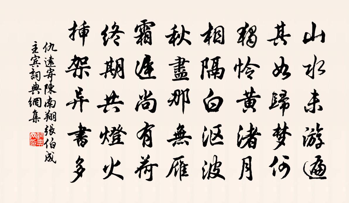 詩詞名句歷史字典書法欣賞書法字典國語詞典說文解字康熙字典古漢語字典標 題 作 者 詩 句 寄陳南翔張伯成主賓作者:仇遠 朝代:宋代寄陳南翔張伯成主賓原文山水未游遍,其如歸夢何。獨憐黃渚月,相隔白漚波。秋盡那無雁,霜遲尚有荷。終期共燈火,插架異書多。詩詞問答問:寄陳南翔張伯成主賓的作者是誰?答:仇遠問:寄陳南翔張伯成主賓寫於哪個朝代?答:宋代仇遠寄陳南翔張伯成主賓書法欣賞寄陳南翔張伯成主賓書法作品詩詞推薦妙山孫元濟建閣江瀕以館往來士大夫余取韓文曾豐〔宋代〕真空元在我胸中,自外觀之枉費功。熟視主人參透處,也無實相也無空。黃匏城陳岩〔宋代〕草色濃於野燒煙,春風吹面午陰天。長江搖盪遊人眼,興在悠悠一雁邊。松下縱筆陸游〔宋代〕自掃松陰寄醉眠,龍吟虎嘯滿霜天。卻思初到人間世,似是唐堯丙子年。頌古一百首釋智愚〔宋代〕曾落石霜機外笏,又扶粗行到唐天。只將四海垂綸手,蝦蟹魚龍一串穿。九日寄行簡白居易〔唐代〕摘得菊花攜得酒,繞村騎馬思悠悠。下邽田地平如掌,何處登高望梓州?何家港舍舟步至新河口崔敦禮〔宋代〕夾岸蘆蒿障日微,拍堤波浪濺人衣。隔江喚得漁船守,貫柳雙鱸自買歸。山寺禪者李復〔宋代〕敗屋數間叢萬笴,虎豹到庭門下鏁。自種石田一飯足,與語略能言璨可。天昏霏霏小雪墮,拾薪吹爐勸親火。葉藏晚步湖橋蘇泂〔宋代〕吳儂生長鏡湖邊,湖晚登橋意欲仙。初見蒼山下紅日,忽看白月上青煙。收藏畫本歸吟筆,應答漁歌送客船。回首次吳伯華韻樓鑰〔宋代〕一身遇坎復乘流,景物當前亦自由。草淺人行因作徑,水來沙聚看成洲。喔詩肯為鉤棘句,適意即是逍遙遊。爛醉蝶戀花(道中有簪二色菊花)趙師俠〔宋代〕百疊霜羅香蕊細。裊裊垂鈴,綴簇黃金碎。獨占九秋風露里。芳心不與群英比。采采東籬今古意。秀色堪餐,更惹南山之田贈王介甫王令〔宋代〕南山之田兮,誰為而蕪。南山之人兮,誰教墮且。來者何為,而往者誰趾。草漫靡兮,不種何自。始吾往兮無耜,湘中口占四首劉克莊〔宋代〕江邊金碧謾層層,戶口稀疏塔廟增。楚俗不知黃面老,家家香火事湘僧。宮詞張公庠〔宋代〕御苑名花約萬栽,芳心俱願日華來。春風已暖梅先綻,長恨江南冒雪開。次韻鄭季遠國錄賢良題余廬山詩記喻良能〔宋代〕青鞋憶昔到廬山,回首清游夢寐間。忽見廣文奇絕句,十年風雨喚仍還。次抱拙妝薄命鄭清之〔宋代〕落花流水何紛紛,三分春色二分塵。黃鸝繞樹戀不得,蝶蜂浪作花都巡。昨日繁華今寂寞,飄零多屬風雨晨。金谷贈李支使方乾〔唐代〕藥成平地是寥天,三十人中最少年。白雪振聲來輦下,青雲開路到床前。公卿位近應翹足,荀宋才微可拍肩。一等馮縣丞輓歌詞陸游〔宋代〕尊公同故里,季父接周行。晚喜烏衣巷,重逢玉樹郎。名流多賞識,榮路正騰驤。愁絕河樑上,風煙暮莽蒼!朝陽亭文同〔宋代〕峨峨乎守居,已與前峰對。朝陽乃危榭,更在守居外。煙雲一川滿,林麓三山會。近檻有胡床,無忘傲公退。宿保全寺方鳳〔宋代〕捫蘿山逕迥,流水石橋分。一雨過秋寺,千峰生暮雲。望窮迷野色,沙遠見鷗群。煙藹蒼茫外,寥寥清磬聞。會兵劉子翬〔宋代〕羽檄西來趣會兵,秋風胡虜更縱橫。烽火石嶺塞垣迥,馬渡分河波浪生。使者漫傳蘇武節,君王頻幸亞夫營。百年名句推薦不效艾符趨習俗,但祈蒲酒話昇平。殷堯藩《端午日》 粽包分兩髻,艾束著危冠。陸游《乙卯重五詩》 御羅屏底翻歌扇,憶西湖、臨水開窗。吳文英《風入松·桂》 樓殿無人春畫長。燕子歸來依舊忙。謝克家《憶君王·依依宮柳拂宮牆》 百囀千聲隨意移,山花紅紫樹高低。歐陽修《畫眉鳥》 送子軍中飲,家書醉里題。岑參《磧西頭送李判官入京》 人間有味是清歡。蘇軾《浣溪沙·細雨斜風作曉寒》 玄都觀里桃千樹,花落水空流。元好問《人月圓·玄都觀里桃千樹》 玉梅消瘦,恨東皇命薄。汪元量《傳言玉女·錢塘元夕》 霧柳暗時雲度月,露荷翻處水流螢。張元乾《浣溪沙·山繞平湖波撼城》