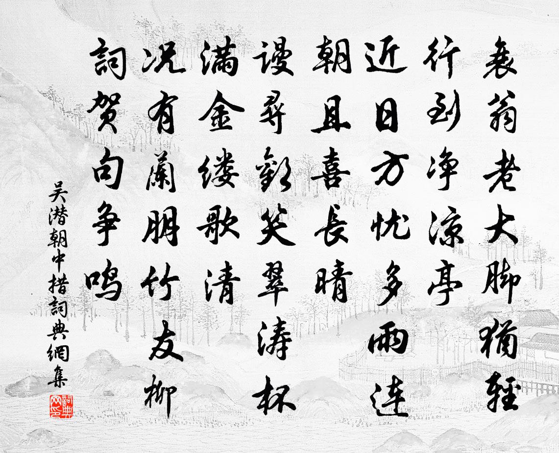 詩詞名句歷史字典書法欣賞書法字典國語詞典說文解字康熙字典古漢語字典標 題 作 者 詩 句 朝中措作者:吳潛 朝代:宋代朝中措原文衰翁老大腳猶輕。行到淨涼亭。近日方憂多雨,連朝且喜長晴。謾尋歡笑,翠濤杯滿,金縷歌清。況有蘭朋竹友,柳詞賀句爭鳴。詩詞問答問:朝中措的作者是誰?答:吳潛問:朝中措寫於哪個朝代?答:宋代問:朝中措是什麼體裁?答:詞問:吳潛的名句有哪些?答:吳潛名句大全吳潛朝中措書法欣賞朝中措書法作品詩詞推薦與釋惠江互謔程紫霄〔唐代〕 僧錄琵琶腿, 次韻歐陽全真送行趙蕃〔宋代〕幾欲歸休反服初,契論今昔更憐渠。非關造物相料理,自是吾儕計闊疏。似我端宜吏刀筆,如君久合召嚴徐。胡然送虞仲房赴潼川漕樓鑰〔宋代〕我來丹丘乘貳車,送客往往萬里余。盛山使君別寖久,漢中郡丞新寄書。公指四明喜鄰境,典午何知成畫餅。揚旌送元錫、楊凌韋應物〔唐代〕荒林翳山郭,積水成秋晦。端居意自違,況別親與愛。歡筵慊未足,離燈悄已對。還當掩郡閣,佇君方此會。哀故文節公宋祁〔宋代〕早傳黃石系,未伴赤松游。暴疹驚床蟻,深恩賜養牛。谿璜俄碎玉,川檝遂藏舟。蕭相今無嗣,夫人紹酇侯。又送湯國正五十六字杜范〔宋代〕一尊濁酒送君行,慘澹江雲似我情。已是園林堆落葉,更添風雨掃殘英。直存吾道曾何病,公在人心為不平。我久採蓮曲李白〔唐代〕若耶溪傍採蓮女,笑隔荷花共人語。日照新妝水底明,風飄香袂空中舉。岸上誰家遊冶郎,三三五五映垂楊。紫騮冬日郡齋書事張先〔宋代〕鈴索聲閒按牒稀,怯寒肌骨望春暉。凝雲垂地雪欲下,高樹無風葉自飛。水落淺沙魚隊聚,草枯幽隴鹿群歸。安人我愛秋香唐寅〔明代〕我畫藍江水悠悠,愛晚亭上楓葉愁。秋月溶溶照佛寺,香菸裊裊繞經樓。次韻賓暘齋中獨坐五首方回〔宋代〕詩來似訴屈原醒,阿堵於公頗不庭。白水真人從斷絕,丹元童子尚神靈。秋眠簟未捐桃竹,晚食齏應韭萍。肯美張孟子生憂患死安樂陳普〔宋代〕路同平夷多折軸,或因危阻遂安全。吉凶豈必皆由命,畏玩之中各有天。山居朱慶餘〔唐代〕歸來青壁下,又見滿籬霜。轉覺琴齋靜,閒從菊地荒。山泉共鹿飲,林果讓僧嘗。時復收新藥,隨雲過石樑。縣齋十詠思齊樓寧參〔宋代〕高閈營層構,翬飛勢自伸。已聞能賦客,空憶帶星人。彫檻憑秋迥,朱扉敞漢新。龜趺清刻在,誰共繼芳塵。次韻王適春雪二首蘇轍〔宋代〕江南春候寒猶劇,細雨風吹作雪花。中夜窗扉初晃漾,平明草木半低斜。潤催江柳排金線,光雜山茶點絳葩。老病途中旅思二首鮑溶〔唐代〕喔喔雞鳴曉,蕭蕭馬辭櫪。草草名利區,居人少於客。生期三萬日,童耄半虛擲。修短命半中,憂歡復相敵。朝提貞元杉錢聞詩〔宋代〕鶴去悽然一古杉,傲霜凌雪幾年間。若非一種靈根異,安得青青不改顏。和楊拱辰見惠馮時行〔宋代〕所操或異趣,並席寧相親。臭味儻不殊,千里情猶伸。古今邪正間,何啻萬微塵。平生閱世眼,服膺無幾人。濟濟句游九言〔宋代〕春風未肯催桃李,留得疏籬淺淡香。晚客狎至應接不一或有疑者作此詩示謝敞教授李復〔宋代〕岸幘扶藜杖,移床傍晚林。形骸猶是累,語默更何心。望外浮雲薄,涼生古汲深。自憐多懶僻,塵色悶孤琴。詩一首陳昉〔宋代〕二十年余作吏人,後園花木也成林。儘是筆頭那撚得,枝枝葉葉有冤聲。刑重惟恐囚人怨,情輕又怕本官嗔。不知名句推薦十年生死兩茫茫,不思量,自難忘。蘇軾《江城子·乙卯正月二十日夜記夢》 望廬思其人,入室想所歷。潘安《悼亡詩三首》 無情燕子,怕春寒、輕失花期。晁沖之《漢宮春·梅》 枕上十年事,江南二老憂,都到心頭。徐再思《水仙子·夜雨》 夏起大土功,命曰絕理。犯禁絕理,天誅必至。佚名《黃帝四經·經法·亡論》 傷心秦漢,生民塗炭,讀書人一聲長嘆。張可久《賣花聲·懷古》 兵務 神速,事貴合機。令狐德棻《周書·列傳·卷二十五》 獨自莫憑欄,無限江山,別時容易見時難。李煜《浪淘沙令·簾外雨潺潺》 凡斗者,必自以為是而以人為非也。荀子《荀子·榮辱》 今日江頭兩三樹,可憐和葉度殘春。元稹《離思五首》