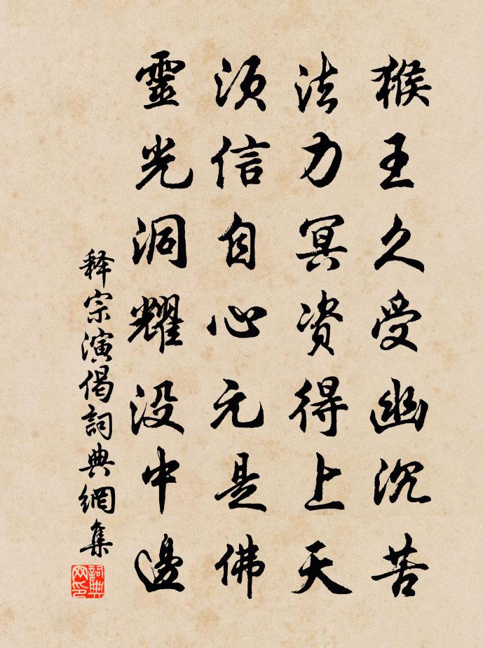 詩詞名句歷史字典書法欣賞書法字典國語詞典說文解字康熙字典古漢語字典標 題 作 者 詩 句 偈作者:釋宗演 朝代:宋代偈原文猴王久受幽沉苦,法力冥資得上天。須信自心元是佛,靈光洞耀沒中邊。詩詞問答問:偈的作者是誰?答:釋宗演問:偈寫於哪個朝代?答:宋代釋宗演偈書法欣賞偈書法作品詩詞推薦鄂州南樓其下為黃鶴樓故基馮時行〔宋代〕今日南樓獨上時,西風無復片雲飛。天連江水去不盡,雲傍遠山閒自歸。鸚鵡巧言終掇禍,麒麟高舉亦知幾。詩翁復和呈莫仲篪高質齋〔宋代〕溪石繡 * ,溪風飄晚涼。坐久得自若,物外知誰忙。渴飲竹泉冷,飢飯松花香。春光忽雲暮,□□□□陽。過胡文定公碧泉書堂張栻〔宋代〕入門認溪碧,循流識深源。念我昔此來,及今七寒暄。人事幾更變,寒花故猶存。堂堂武夷翁,道義世所尊。永袖戲答佛印蘇軾〔宋代〕遠公沽酒飲陶潛,佛印燒豬待子瞻。採得百花成蜜後,不知辛苦為誰甜。木蘭花慢(餞公孫倅)牟巘〔宋代〕山城如斗大,君肯為、兩年留。問讀易堂前,然松竹,留得君不。天邊乍傳訊息,趁春風、歸侍翠雲裘。留取去思夜歸陸游〔宋代〕晡時捩柂離西興,錢清夜渡見月升。浮橋沽酒市嘈囋,江口過埭牛凌兢。寒齏煮餅坐茆店,小鮮供饌尋魚罾。偶逢壽周樞密四首曾豐〔宋代〕一元發於春,萬物收以秋。公轉播物鈞,元氣在筆頭。頤指役漢將,願言似留侯。功成早辟穀,壽與喬松侔。冬夜二首張耒〔宋代〕慘慘諸山暮,寥寥老樹空。尚飛霜雁急,不動雪雲重。掛冷寒燈壁,悲傳夜柝風。隔窗無恨竹,蕭颯到晨鐘。和太傅平章賈魏公鹹淳庚午冬大雪遺安撫潛侍文及翁〔宋代〕身遊廊廟意山林,六出花開一寸心。平地尺書叨載史,瞻天班賀齒諸任。屢豐歲事常如昔,太素風光直到今。收斂晚泊湘江宋之問〔唐代〕五嶺恓惶客,三湘憔悴顏。況復秋雨霽,表里見衡山。路逐鵬南轉,心依雁北還。唯餘望鄉淚,更染竹成斑。感皇恩 有贈王寂〔元代〕寶髻綰雙螺,蹙金羅抹。紅袖珍珠臂。十三弦上,小小剝蔥銀甲。陽關三疊遍、花十八。雁行歷歷,鶯聲恰恰。次韻楊宰思庭竹陳造〔宋代〕數尋脆碧裊輕陰,歲不知寒暑不侵。屬厭吟風仍嘯雨,盡收縣解入琴心。致仕邵少卿輓辭二首王安石〔宋代〕謝朓城中守,梁鴻墓下歸。素車馳吉路,丹旐卷寒輝。撫幾虛容在,瞻圖實貌非。無因置一酹,空此嘆長違。壽張亨泉提刑三首吳泳〔宋代〕末學紛紛競為人,公能康濟自家身。形軀元備人間世,肝肺盡收天下春。觀我自應知愛重,識心須會起經綸。壽觥雙路劉學箕〔宋代〕王命弛驅不敢輕,文書要覈去來情。青山步步生幽意,碧澗悠悠趁遠程。春淺禽聲猶自小,泥酥馬跡正宜晴。地名酬滁州李十六使君見贈劉長卿〔唐代〕滿鏡悲華發,空山寄此身。白雲家自有,黃卷業長貧。懶任垂竿老,狂因釀黍春。桃花迷新地,桂樹狎幽人。幢蓋唐受命讖佚名〔唐代〕法律存,道德在,白旗天子出東海。桃李子,莫浪語。黃鵠繞山飛,宛轉花園裡。桃花園,宛轉屬旌幡。桃李子,武陵春 贈李道人拆字譚處端〔元代〕日勸君君不省,下越貪忙。識常常內轉傷。肯恁思量。養靈根牢固取,目好回光。兀騰騰萬事忘。內*仙香。觀物二首白玉蟾〔宋代〕蜂占薔薇封食邑,蟻侵蜾蠃借軍須。雨天風急鳩呼婦,水國煙寒雁喚奴。晚春登大雲寺南樓贈常禪師白居易〔唐代〕花盡頭新白,登樓意若何?歲時春日少,世界苦人多。愁醉非因酒,悲吟不是歌。求師治此病,唯勸讀楞伽。名句推薦語來江色暮,獨自下寒煙。李白《尋雍尊師隱居》 明妃一朝西入胡,胡中美女多羞死。李白《于闐採花》 見說五湖供飲馬,滄浪何處著漁舟?陳子龍《秋日雜感(十首選一)》 驚起卻回頭,有恨無人省。蘇軾《卜運算元·黃州定慧院寓居作》 把酒送君天上去,瓊玉琚玉佩軝鴻列。嚴羽《滿江紅·送廖叔仁赴闕》 貧賤非辱,貧賤而諂求於人者為辱王永彬《圍爐夜話·第三一則》 不是冤家不聚頭,冤家相聚幾時休?馮夢龍《警世通言·卷二》 涼月如眉掛柳灣,越中山色鏡中看。戴叔倫《蘭溪棹歌》 青天蜀道難,紅葉吳江冷。張可久《普天樂·秋懷》 遠牧牛,繞村四面禾黍稠。李涉《牧童詞》