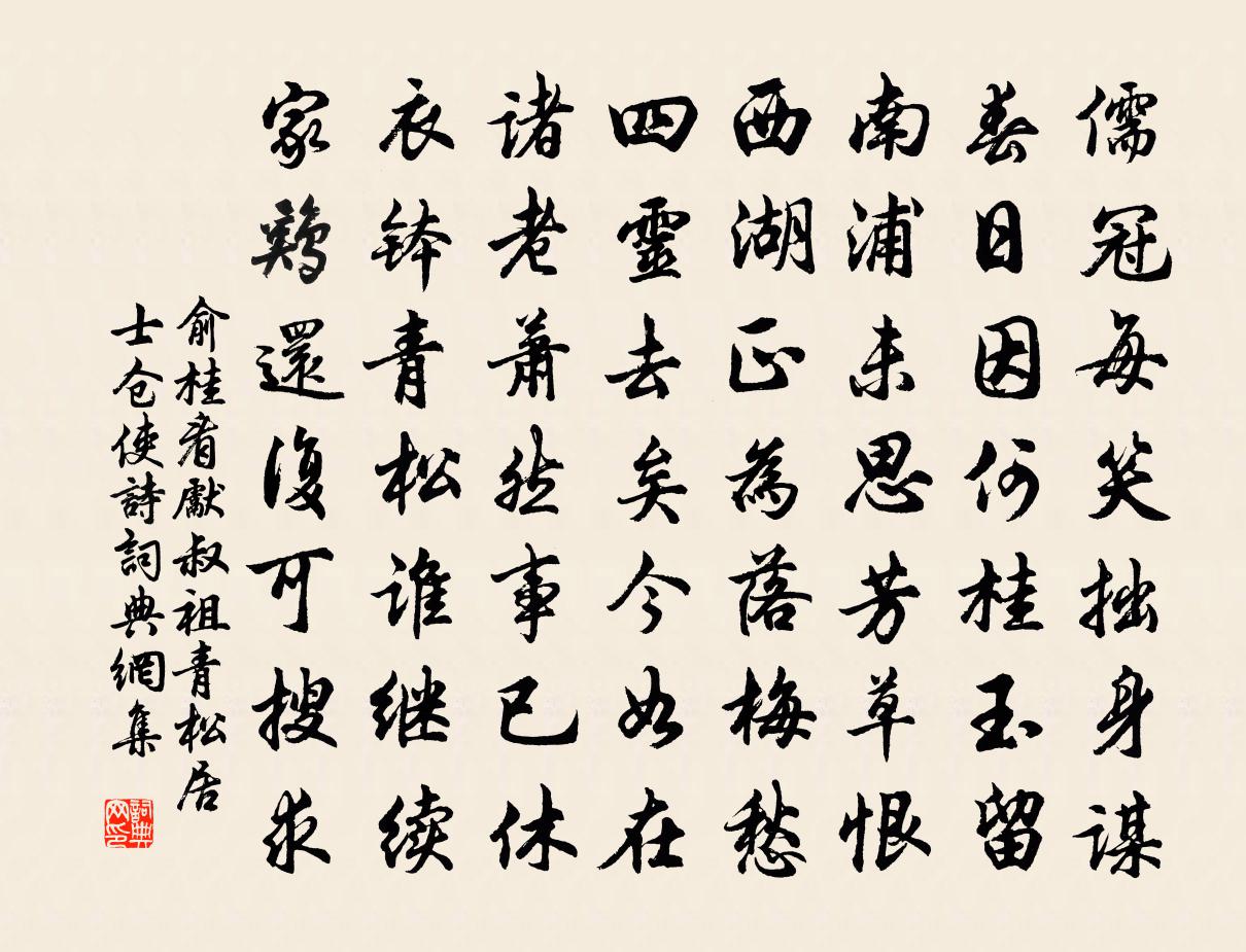 詩詞名句歷史字典書法欣賞書法字典國語詞典說文解字康熙字典古漢語字典標 題 作 者 詩 句 看先叔祖青松居士倉使詩作者:俞桂 朝代:宋代看先叔祖青松居士倉使詩原文儒冠每笑拙身謀,春日因何桂玉留。南浦未思芳草恨,西湖正為落梅愁。四靈去矣今如在,諸老蕭然事已休。衣缽青松誰繼續,家雞還復可搜求。詩詞問答問:看先叔祖青松居士倉使詩的作者是誰?答:俞桂問:看先叔祖青松居士倉使詩寫於哪個朝代?答:宋代俞桂看先叔祖青松居士倉使詩書法欣賞看先叔祖青松居士倉使詩書法作品詩詞推薦漁父釋文珦〔宋代〕在處變名姓,往來長嘯歌。一身無賦役,幾口共煙波。江月垂綸下,江雲宿棹和。卻應嫌渭叟,老去脫寒蓑。村居即事六言十首劉克莊〔宋代〕風窗有竹相敲,地爐無葉可燒。亂書翻覆未了,一燈明滅頻挑。奉和戶曹叔夏夜寓直寄呈同曹諸公並見示盧綸〔唐代〕斂板捧清詞,恭聞侍直時。暮塵歸眾騎,邃宇舍諸司。華月先燈至,清風與簟隨。亂螢光熠熠,行樹影離離。龍臥宮詞楊皇后〔宋代〕剪剪輕風二月天,柳絲飄颺倍堪憐。靜憑雕檻渾無事,細數穿花燕影偏。題棟馮觀國〔宋代〕水非溝壑龍方臥,木是梧桐鳳始棲。莫道男兒無去路,碧霄雲外有仙梯。菩薩蠻(富季申見約觀月,以病不能往。夜分獨臥橫山閣,作此寄之)李彌遜〔宋代〕餘霞收盡寒煙綠。江山一片團明玉。欹枕畫樓風。愁生草際蛩。金莖秋未老。兩鬢吳霜早。忍負廣寒期。清尊對語歸家(一作趙嘏詩)杜牧〔唐代〕稚子牽衣問,歸來何太遲。共誰爭歲月,贏得鬢邊絲。連日治圃至山亭又作五字陸游〔宋代〕門開度略彴,路盡上坡陀。農隙閒耕犢,樵歸起醉歌。青煙舞鸞鳳,白石伏黿鼉。剩有筇枝興,窮冬氣已和。郫縣春日吟吳泳〔宋代〕不寒不暖杏花天,爭看蠶叢古寺邊。舊日尚留耕雨具,新年難得買共錢。頌古一○一首釋子淳〔宋代〕滄海無風波浪平,煙收水色虛含月。寒光一帶望何窮,誰辯箇中龍退骨。董伯懿示裴晉公平淮右題名碑詩用其韻和酬王安石〔宋代〕元和伐蔡何危哉,朝廷百口無一諧。盜傷中丞偶不死,利劍白日投天街。裹瘡入相議軍旅,國火一再更檀槐。上前宗忠簡留守司二劄家書吾友三帖贊岳珂〔宋代〕人心大義,不作不奮。楚漢之間,較者尺寸。翼翼京邑,九聖所都。時方多艱,天下之樞。勢進則張,狙詐作使。句趙庚夫〔宋代〕詩句日從窗眼寫,墨丸夜入枕頭收。九日陪兩制諸公燕趙氏園亭強至〔宋代〕筋力追歡勝去年,不應吹帽愧華顛。壯心未折秋風裡,笑口頻開晚照邊。學士帶欺 * 爛,侍臣綬奪紫萸鮮。自憐西歸於武陵〔唐代〕不系與舟閒,悠悠吳楚間。羞將新白髮,卻到舊青山。一葉忽離樹,幾人同入關。長安家尚在,秋至又西還。挽昭懷皇后詩二首李呂〔宋代〕愍冊哀榮絕,鮮原卜兆安。世家金穴舊,大墜玉衣寒。何意簪花柰,空遺刈畹蘭。神遊泰陵廟,永護月衣冠。秋日金陵制幕書事王同祖〔宋代〕哨馬紛紛一水間,渡頭分戍要防奸。可憐生計漁舟者,官給旗牌禁往還。用韻贈李恭父孫應時〔宋代〕浮雲富貴適堪憐,烈士襟期定不然。拭目去為三島客,此心莫負九重天。雖雲小草容同味,敢與昌陽較引年。下直古梅熊瑞〔宋代〕風度飄飄一世豪,偃然猶自外離騷。諸公慣作交婆熊,動說山人索價高。題六代祖師畫像張元乾〔宋代〕一葦浮江雙履歸,花開震旦共傳衣。本來心印無文字,畫到盧能足是非。名句推薦塘上有塔院,中秋夜曾隨吾父觀潮於此。沈復《浮生六記·浪遊記快》 長楊跨武騎,細柳接戎軒。鄭愔《奉和幸望 * 送朔方大總管張仁亶》 悔既往之失,亦要防將來之非。洪應明《菜根譚·概論》 持斧伐遠揚,荷鋤覘泉脈。王維《春中田園作》 離恨恰如春草,更行更遠還生。李煜《清平樂·別來春半》 無人調護,自去經心。沈復《浮生六記·閨房記樂》 天外黑風吹海立,浙東飛雨過江來。蘇軾《有美堂暴雨》 荷芰風輕簾幕香,繡衣鸂鶒泳回塘,小屏閒掩舊瀟湘。顧敻《浣溪沙·荷芰風輕簾幕香》 休問梁園舊賓客,茂陵秋雨病相如。李商隱《寄令狐郎中》 茂苑人歸,秦樓燕宿,同惜天涯為旅。吳文英《齊天樂·新煙初試花如夢》