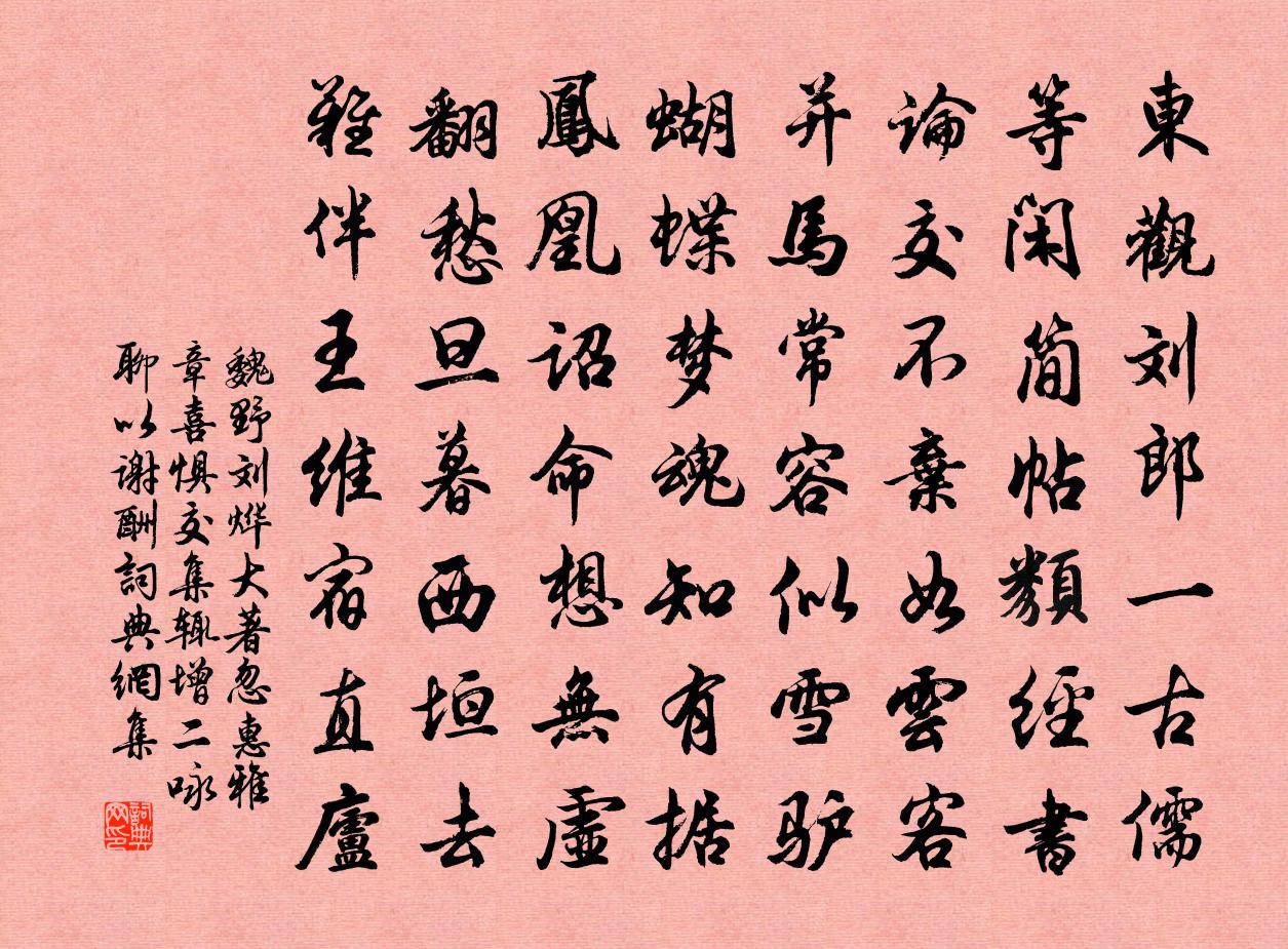 詩詞名句歷史字典書法欣賞書法字典國語詞典說文解字康熙字典古漢語字典標 題 作 者 詩 句 劉燁大著忽惠雅章喜懼交集輒增二詠聊以謝酬作者:魏野 朝代:宋代原文東觀劉郎一古儒,等閒簡帖類經書。論交不棄如雲客,並馬常容似雪驢。蝴蝶夢魂知有據,鳳凰詔命想無虛。翻愁旦暮西垣去,難伴王維宿直廬。詩詞問答問:《劉燁大著忽惠雅章喜懼交集輒增二詠聊以謝酬》的作者是誰?答:魏野問:該詩寫於哪個朝代?答:宋代書法欣賞劉燁大著忽惠雅章喜懼交集輒增二詠聊以謝酬書法作品詩詞推薦范文正公楷書昌黎伯夷頌平江李使君信之久藏方回〔宋代〕班固人表吾嘗疑,第一武王二伯夷。我謂伯夷可第一,武未盡善宜二之。退之第一唐文人,希文第一宋輔臣。韓為登制勝樓次韻閻蒼舒〔宋代〕百牢關下幾夔州,坐鎮休餘只倚樓。赤甲白鹽齊意氣,綸巾羽扇獨風流。夜間警柝拋金鎖,春樂熙台醉玉舟。化國南康縣圃賞梨花呈長官趙必象〔宋代〕種花之暇點春芳,把酒花邊試洗妝。差勝當年潘令尹,空載桃李滿河陽。至鄂期年以饟事不給於詩己亥夏五廿有八日始岳珂〔宋代〕一江漲碧碧於藍,健櫓鳴鵝舳正銜。才似過都空萬馬,又驚倚岸閱千帆。珊瑚筆格錢惟演〔宋代〕蘊粹滄波遠,搜奇鐵網勞。柔條鑽火樹,麗景奪星旄。叢倚棲油幾,枝疏薦兔毫。寶跗光互映,翠匣價相高。鉤謾雨夜言懷汪炎昶〔宋代〕淅淅復淅淅,雨微聲不休。蛩長遠村夜,風早疏檽秋。委蛇世路窄,隱忍吾道羞。時逢一笑適,豈足價多尤。道者復乾接待釋大觀〔宋代〕旋營屋子嵌雲山,舊日靈泉氣象還。但有過門教歇去,誰去道者少機關。挽叔祖戶部侍郎詩四首張鎡〔宋代〕八郡恢成績,江山入壯圖。風流羊叔子,才術管夷吾。絕筆詩猶在,酬君志不渝。經綸如有位,肯墮淺規摹。牧養監閱馬強至〔宋代〕骨瘦誰知驥騄名,駑群平視圉夫輕。夷塗好在重驤首,喜見今年春草生。望月懷江上舊遊雍陶〔唐代〕往歲曾隨江客船,秋風明月洞庭邊。為看今夜天如水,憶得當時水似天。題蓋竹廟六絕陳淳〔宋代〕夢生於想本來非,一自魂交百感隨。漠漠茫茫無定準,若何據此卜前達。秋遊六首邵雍〔宋代〕霜天寥落思無窮,不奈樓高逼望中。四面溪山徒滿目,九秋宮殿自危空。雲橫遠嶠千尋直,霞亂斜陽數縷紅。無限七星杉陳肅〔宋代〕峭石七星杉,凌雲勢森聳。月照林影寒,風起龍勢動。高低松檜枝,環如眾星拱。偈六十九首釋道寧〔宋代〕靈山標榜,五指舒光。少室真規。斷肱立雪。塵中辨主,盤山蹤跡猶存。杓柄妥來,象骨家風尚在。流通密旨,建贈楊處厚牟融〔唐代〕十年學道苦勞神,贏得尊前一病身。天上故人皆自貴,山中明月獨相親。客心淡泊偏宜靜,吾道從容不厭貧。幾度西湖三首周鍔〔宋代〕使君修禊與民游,十里笙歌水面浮。動地雄風雲外起,截天雌霓雨中收。登台已有難並樂,擊壤寧無寡和憂。卻憶勞歌張耒〔宋代〕暑天三月元無雨,雲頭不合惟飛土。深堂無人午睡余,欲動兒先汗如雨。忽憐長街負重民,筋骸長彀十石弩。半衲送薛能少府任盩厔李頻〔唐代〕不才甘下第,君子蹇何重。相送昆明岸,同看太白峰。數瓢留頃刻,殘照迫從容。好去煙霞縣,仙人有舊蹤。陌上花三首蘇軾〔宋代〕陌上山花無數開,路人爭看翠軿來。若為留得堂堂去,且更從教緩緩回。高山引宋之問〔唐代〕攀雲窈窕兮上躋懸峰,長路浩浩兮此去何從。水一曲兮腸一曲,山一重兮悲一重。松檟邈已遠,友於何日逢。況滿名句推薦數年前也放狂,這幾日全無況。康海《雁兒落帶得勝令·飲中閒詠》 執子之手,與子偕老。詩經《擊鼓》 如夢,如夢,殘月落花煙重。李存勖《如夢令·曾宴桃源深洞》 小立紅橋柳半垂,越羅裙颺縷金衣。納蘭性德《山花子·小立紅橋柳半垂》 君看石芒碭,掩淚悲千古李白《丁督護歌》 老柘葉黃如嫩樹,寒櫻枝白是狂花。白居易《早冬》 小桃枝下試羅裳,蝶粉斗遺香。陳子龍《訴衷情·春遊》 江東子弟多才俊,捲土重來未可知。杜牧《題烏江亭》 工欲善其事,必先利其器。佚名《論語七則》 人皆可罪,罪人須定其人。來俊臣《羅織經·問罪卷第十》