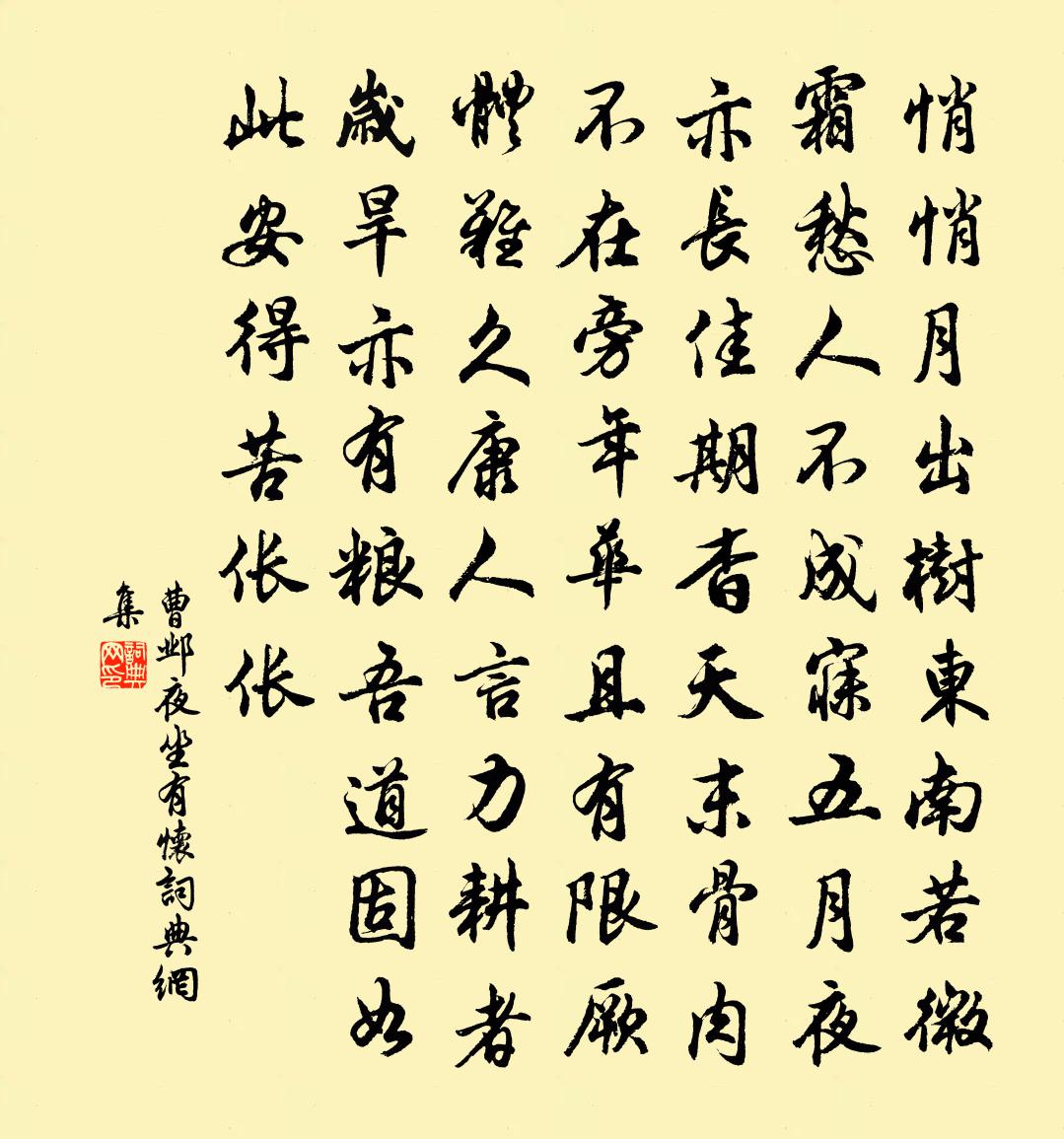 詩詞名句歷史字典書法欣賞書法字典國語詞典說文解字康熙字典古漢語字典標 題 作 者 詩 句 夜坐有懷作者:曹鄴 朝代:唐代夜坐有懷原文悄悄月出樹,東南若微霜。愁人不成寐,五月夜亦長。佳期杳天末,骨肉不在旁。年華且有限,厥體難久康。人言力耕者,歲旱亦有糧。吾道固如此,安得苦倀倀。詩詞問答問:夜坐有懷的作者是誰?答:曹鄴問:夜坐有懷寫於哪個朝代?答:唐代問:夜坐有懷是什麼體裁?答:五古曹鄴夜坐有懷書法欣賞夜坐有懷書法作品注釋全唐詩詩詞推薦秋夜讀書示謙廖行之〔宋代〕常記吾公誨語存,豈唯撫育念深恩。要將禮義扶門戶,常把詩書訓子孫。眾耳尚聞垂絕語,爾曹無負起家原。殷勤和卓季萬寄示五絕德操為唱王洋〔宋代〕紅旆朝天彩色新,主人心在五湖春。君王不鑄良金象,莫愛扁舟共載人。初秋夢故山覺而有作陸游〔宋代〕昔我東歸時,父老迎船頭。開篷相勞苦,怪我領雪稠。故山何負君,且作數月留。豈知席未暖,疋馬來南州。蠻花句王文卿〔宋代〕紅塵富貴無心戀,紫府真仙有志攀。和方丞陳宓〔宋代〕平生筆健足神奇,況復高懷與古期。台閣風流今貳令,不妨時出解頤詩。擬唐臣春苑池應制汪炎昶〔宋代〕聖君垂拱殿,游豫及時和。輦駐花邊靜,舟攢柳外多。泛遙齊解纜,載重密垂河。傅楫輕高手,變詔讕棹歌。魚方寄西湖友人林尚仁〔宋代〕湖邊春更好,別後費吟思。載酒曾游處,憶君同醉時。面風花落易,背日雪消遲。早晚攜琴去,山中與鶴期。題玉芝雙奉院顧在鎔〔唐代〕入門如洞府,花木與時稀。夜坐山當戶,秋吟葉滿衣。犬隨童子出,鳥避俗人飛。至藥應將熟,年年火氣微。翰林作劉鄴〔唐代〕曾是江波垂釣人,自憐深厭九衢塵。浮生漸老年隨水,往事曾聞淚滿巾。已覺遠天秋色動,不堪閒夜雨聲頻。多慚題金明府平易堂方回〔宋代〕桑疇麥隴頌聲歡,競說琴書政事寬。方寸惟知存豈弟,絲毫不肯作艱難。愛民何啻如兒子,行路休教避長官。來往尤尚書輓詩項安世〔宋代〕舊學淵衷記,新阡玉色疑。似聞形嘆慨,未忍失容儀。海道空齏志,西州只貯悲。平生謝公願,後世子云知。舍北野步仇遠〔宋代〕野步上西門,寬平又一村。疏籬圍古井,密樹擁高墳。家有田園樂,氓知守令尊。因思興廢事,變滅似秋雲。泊舟趙汝鐩〔宋代〕前頭無泊處,且住荻花林。水沸知灘淺,煙蜂花在瓶。呼童治茶具,有客扣柴扃。共說山林話,休嗟兩鬢星。爇心香 贈張劉二都料馬鈺〔元代〕奉勸清河,酷告彭城。暨諸公、休苦勞神。速離火院,早出迷津。縱水雲遊,歸物外,作閒人。端的修行,洗滌心楊柳枝侯善淵〔元代〕頓識圓明象易沖。妙無窮。祥煙飛入玉清宮。月臨空。物性自然 * 道,與誰同。楊柳枝插寶瓶中。好家風。九月十日同尤延之觀淨慈新殿楊萬里〔宋代〕昨雨敗重九,謂並敗此行。雲師出小譎,垂曉偷放晴。初愁落君後,我反先出城。佇立已小倦,喜聞馬來聲。南山浦早望孫岩〔宋代〕千峰倒影碧粼粼,摹寫桐江最逼真。每逢佳處謀書屋,漸恐山靈不信人。用明有攜酒賞梅之約久而未至復和以督之胡寅〔宋代〕美酒名花並,無情即易忘。小槽應注瀑,大樹欲殘妝。雖則通達道,其如隔繚牆。寄人慚大庾,求伴愧高陽。好傍虞美人(送別)趙長卿〔宋代〕燈前忍見紅面。別酒頻斟勸。愁蛾斂翠不勝情。報導看看天色、待平明。殷勤重把陽關唱。休要教人望。出門猶自寄王五四將仕華岳〔宋代〕周田且謂曾占易,商野何嘗識夢書。假使二君無感召,不成終老在樵漁。名句推薦千錘萬鑿出深山,烈火焚燒若等閒。于謙《石灰吟》 強自取柱,柔自取束。荀子《荀子·勸學》 道生一,一生二,二生三,三生萬物。老子《老子·德經·第四十二章》 不將辛苦意,難近世間財。馮夢龍《醒世恆言·卷十四》 落日塞塵起,胡騎獵清秋。辛棄疾《水調歌頭·舟次揚州和人韻》 綠池芳草滿晴波,春色都從雨里過。高啟《春暮西園》 試玉要燒三日滿,辨材須待七年期。白居易《放言五首·其三》 疾風知勁草,板蕩識誠臣。李世民《賜蕭瑀》 簫鼓喧,人影參差,滿路飄香麝。周邦彥《解語花·上元》 門外垂楊岸側,畫橋誰系蘭舟。万俟詠《木蘭花慢·恨鶯花漸老》