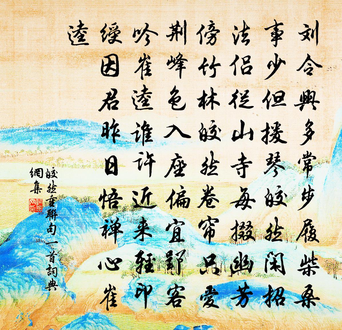 詩詞名句歷史字典書法欣賞書法字典國語詞典說文解字康熙字典古漢語字典標 題 作 者 詩 句 重聯句一首作者:皎然 朝代:唐代重聯句一首原文劉令興多常步履,柴桑事少但援琴。 ——皎然閒招法侶從山寺,每掇幽芳傍竹林。 ——皎然捲簾只愛荊峰色,入座偏宜郢客吟。 ——崔逵誰許近來輕印綬,因君昨日悟禪心。 ——崔逵詩詞問答問:重聯句一首的作者是誰?答:皎然問:重聯句一首寫於哪個朝代?答:唐代問:重聯句一首是什麼體裁?答:聯句皎然重聯句一首書法欣賞重聯句一首書法作品注釋全唐詩:卷794-22詩詞推薦蘆山寺舒坦〔宋代〕昨日南山今北山,山南山北幾時還。世人只道僧閒好,未必僧閒似我閒。二友陸游〔宋代〕清芬六出水槴子,堅瘦九節石菖蒲。放翁閉門得二友,千古夷齊今豈無?頤軒詩六首黃庭堅〔宋代〕無外一精明,六契約出自。公能知本源,佛亦不相似。和太子懺悔詩蕭衍〔南北朝〕玉泉漏向盡。金門光未成。繚繞聞天樂。周流揚梵聲。蘭湯浴身垢。懺悔淨心靈。蔞草獲再鮮。落花蒙重榮。戒飲三詩陳造〔宋代〕自我銘盤盂,覆杯遠麴櫱。人或安清修,身亦享黃髮。柰何悠悠者,沈酗無虛日。言之每逢怒,周誥存苦闕。狂悖挾書一卷至湖上戲作陸游〔宋代〕買地孤村結草廬,蕭然身世落樵漁。一編在手君無怪,曾典蓬山四庫書。臨江仙陳與義〔宋代〕高詠《楚詞》酬午日,天涯節序匆匆。榴花不似舞裙紅。無人知此意,歌罷滿簾風。萬事一身傷老矣,戎葵凝笑牆卜運算元陳師道〔宋代〕纖軟小腰身,明秀天真面。淡畫修眉小作春,中有相思怨。背立向人羞,顏破因誰倩。不比陽台夢裡逢,親向尊前三次蘇字韻曾幾〔宋代〕陶詩雖瘠元非枯,確論近出眉山蘇。君詩不贈世作者,以暗投我如投珠。鄙人摹寫不成就,妄指畫狗為於菟。安得七月四夜十過差涼閒坐和徐子融晦日所寄四絕陳文蔚〔宋代〕此理分明見中偏,何時講習到同然。寄書好與隨庵道,千里元來共一天。昆湖夜歸趙希邁〔宋代〕渡湖歸古縣,一望水程賒。月正帆無影,風橫浪有花。寒更知戍屋,野火是漁家。擬待春洲暖,重來採荻芽。華亭十詠陵機宅唐詢〔宋代〕舊諜傅遺趾,悠然歷祀深。人無令威至,門異下邽箴。谷水當年溜,崑山昔日陰。魯堂那復見,絲竹若為尋。漁父詞方岳〔宋代〕晚晴鋪網占鷗沙,各自分魚就酒家。洞品醉眠船正暖,碧桃流出兩三花。鷓鴣天周密〔宋代〕相傍清明晴便慳。閉門空自惜花殘。海棠半坼難禁雨,燕子初歸不耐寒。金鴨冷,錦鵷閒。銀釭空照小屏山。翠羅送僧姚合〔唐代〕人間擾擾唯閒事,自見高人只有詩。寂寞嵩峰雲外寺,常多夢裡過齋時。城中聽得新經論,卻過關東說向人。舊國公餘漫興黃伯固〔宋代〕蓼花秋水漫官衙,令尹情懷自一家。退食小齋無俗事,閒呼童子問桑麻。關陳郎中棅知嚴州翁卷〔宋代〕頻年經虎害,人望使君來。地重分旄節,州清管釣台。涼天星象動,吉日印符開。帝擢平津策,曾知有用才。送李廓侍御赴劍南顧非熊〔唐代〕鳥道見狼煙,元戎正急賢。圖書借朋友,吟詠入戈鋋。山色城池近,江聲鼓角連。不應夸戰勝,知在檄蠻篇。初祖贊釋法薰〔宋代〕航海越漠來,幾度藥不殺。壞我震旦人,至今廝淈{左氵右盾}。禁直王安石〔宋代〕翠木交陰覆兩檐,夜天如水碧湉湉。帝城風月看常好,人世悲哀老自添。名句推薦但箭雁沈邊,梁燕無主。劉辰翁《蘭陵王·丙子送春》 無善而致人譽,不如無惡而致人毀。洪應明《菜根譚·概論》 君安游兮西入秦,願為影兮隨君身。傅玄《車遙遙篇》 水激則悍,矢激則遠劉向《說苑·談叢》 天涯也有江南信。梅破知春近。黃庭堅《虞美人·宜州見梅作》 江山故宅空文藻,雲雨荒台豈夢思。杜甫《詠懷古蹟五首·其二》 一朝春盡紅顏老,花落人亡兩不知。曹雪芹《紅樓夢·第二十七回》 人方為刀俎,我為魚肉司馬遷《史記·項羽本紀》 三百年間同曉夢,鐘山何處有龍盤。李商隱《詠史二首·其一》 俯視洛陽川,茫茫走胡兵。李白《古風·其十九》