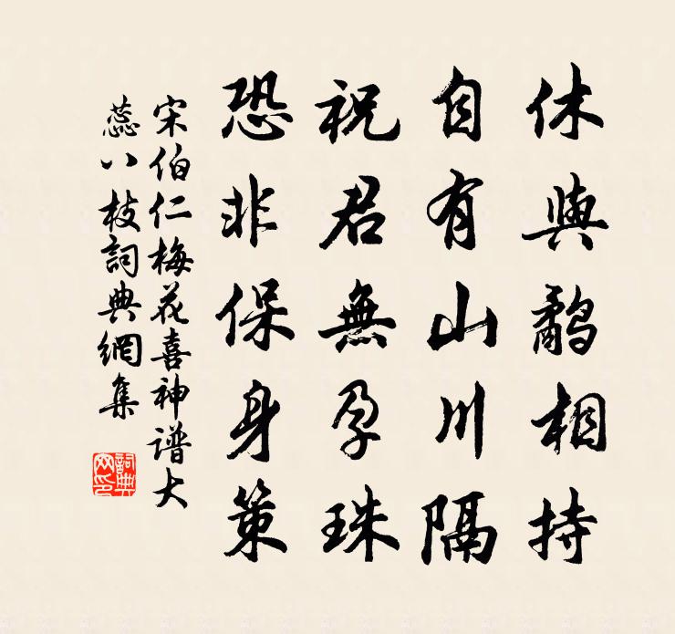 詩詞名句歷史字典書法欣賞書法字典國語詞典說文解字康熙字典古漢語字典標 題 作 者 詩 句 梅花喜神譜大蕊八枝作者:宋伯仁 朝代:宋代梅花喜神譜大蕊八枝原文休與鷸相持,自有山川隔。祝君無孕珠,恐非保身策。詩詞問答問:梅花喜神譜大蕊八枝的作者是誰?答:宋伯仁問:梅花喜神譜大蕊八枝寫於哪個朝代?答:宋代宋伯仁梅花喜神譜大蕊八枝書法欣賞梅花喜神譜大蕊八枝書法作品詩詞推薦水琴趙汝鐩〔宋代〕盎缶停涵水一泓,中存雅意超器形。欲滴未滴天地寂,須臾宮商若相賡。妙趣不勞徽外索,泛聲不自弦上生。小點令狐相公見示新栽蕙蘭二草之什,兼命同作劉禹錫〔唐代〕上國庭前草,移來漢水潯。朱門雖易地,玉樹有餘陰。艷彩凝還泛,清香絕復尋。光華童子佩,柔軟美人心。惜晚句李拱〔宋代〕雨後有人耕綠野,月明無犬吠花村。己卯正月十八日與申屠彥德游虎丘得客字倪瓚〔元代〕余適偶入城,本是山中客。舟經二王宅,弔古覽陳跡。松陰始亭午,嵐氣忽斂夕。欲去仍裴徊,題詩滿苔石。閉居五詠其一杜門蘇轍〔宋代〕可憐杜門久,不覺杜門非。床銳日日銷,髀肉年年肥。眼暗書罷讀,肺病酒亦稀。經年客不至,不冠仍不衣。視聽郴江百詠並序西湖阮閱〔宋代〕岸草江花對夕陽,滿船新月夜鳴榔。秋清菡萏紅千柄,風靜琉璃碧一方。九鎖山十詠石壁呂同老〔宋代〕清飈吹衣裳,縹緲凌層巔。玲瓏峭壁下,杖策窮迴旋。名圖謝模寫,大巧無雕鐫。窅如晴雲影,靄靄行青天。飄如自戲三絕句。心重答身白居易〔唐代〕因我疏慵休罷早,遣君安樂歲時多。世間老苦人何限,不放君閒奈我何。偈頌一百六十首釋宗杲〔宋代〕無邊剎境,自他不隔於毫端。十世古今,始終不離於當念。丈夫自有沖天志,休向如來行處行。贈魏衍三首陳師道〔宋代〕妙年文墨秀儒林,老眼今晨得再明。歷塊過都聊可待,未須回首一長鳴。孟津歲晚十首宋庠〔宋代〕芳序雖搖落,吾生任屈伸。日催輕璧士,天赦戴盆人。宵雁多號月,冰魚暗待春。自憐麋鹿性,晚節頓纓頻。題謝氏西谷陳宗道〔宋代〕江東風流會稽伯,玉壺貯香傾琥珀。春風十里東山雲,一局寒楸晚空碧。盤盤石磴紅泉仙,春夢草斷瑤池箋。蒙茸蜂兒榧歌葉適〔宋代〕平林常榧啖俚蠻,玉山之產升金盤。其中一樹斷崖立,石乳蔭根多歲寒。形嫌蜂兒尚粗率,味嫌蜂兒少標律。昔人對雪獨酌文同〔宋代〕雲陰低重玉花繁,獨擁貂裘對一樽。不語佳賓是何物,古書名畫滿西軒。踏莎行高觀國〔宋代〕花染煙香,柳搖風翠。春工寫出清明意。翠灣還趁畫船開,粉牆到處驕驄系。歌喚紅裙,酒招青旆。吟情又許春風道室雜詠陸游〔宋代〕精神有限惟當嗇,造化無心不汝私。此事安須知決擇,雞鳴勿後老人期。暮春戲贈吳端公曹唐〔唐代〕年少英雄好丈夫,大家望拜執金吾。閒眠曉日聽鶗鴂,笑倚春風仗轆轤。深院吹笙聞漢婢,靜街調馬任奚奴。牡丹玉人歌楊炎正〔宋代〕風西起。又老盡籬花,寒輕香細。漫題紅葉,句里意誰會。長天不恨江南遠,苦恨無書寄。最相思,盤桔千枚,膾讀書有感戴表元〔宋代〕魯女悲嗟起夜深,當年枉卻淚沾襟。如今已免鄰人笑,老大知無欲嫁心。文宗嗜蛤蜊圖贊釋心月〔宋代〕一點悲心擘不開,鑊湯袞處笑盈腮。希奇之事朕深信,是與君王說不地來。名句推薦人有不及,可以情恕。房玄齡《晉書·列傳·第六章》 無情最是台城柳,依舊煙籠十里堤。韋莊《台城》 名不正,則言不順;言不順,則事不成孔子弟子《論語·子路篇》 王者不令人放生,而無故卻不殺生,則物命可惜也王永彬《圍爐夜話·第二四則》 落葉委埏側,枯荄帶墳隅。潘安《悼亡詩三首》 我當二十不得意,一心愁謝如枯蘭。李賀《開愁歌》 午枕夢初殘,高樓上,獨憑闌乾。朱栴《青杏兒·秋》 歲暮遠為客,邊隅還用兵。杜甫《歲暮》 蘭陵美酒鬱金香,玉碗盛來琥珀光。李白《客中行 / 客中作》 得之易,失之易。得之難,失之難。施耐庵《水滸傳·第一百一十六回》