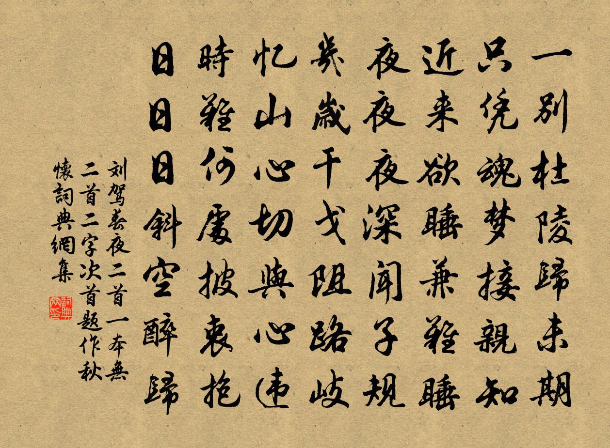 詩詞名句歷史字典書法欣賞書法字典國語詞典說文解字康熙字典古漢語字典標 題 作 者 詩 句 春夜二首(一本無二首二字,次首題作秋懷)作者:劉駕 朝代:唐代原文一別杜陵歸未期,只憑魂夢接親知。近來欲睡兼難睡,夜夜夜深聞子規。幾歲干戈阻路岐,憶山心切與心違。時難何處披衷抱,日日日斜空醉歸。詩詞問答問:《春夜二首(一本無二首二字,次首題作秋懷)》的作者是誰?答:劉駕問:該詩寫於哪個朝代?答:唐代書法欣賞春夜二首(一本無二首二字,次首題作秋懷)書法作品注釋全唐詩:卷585-62詩詞推薦擷菜蘇軾〔宋代〕秋來霜露滿東園,蘆菔生兒芥有孫。我與何曾同一飽,不知何苦食雞豚。寄沛縣姜承議陳師道〔宋代〕平生魯國老先生,晚見諸郎識老成。怪有武功蒙寵錫,果緣陰德貫神明。金池已作歸田計,玉版方書濟物情。百里江革徐鈞〔宋代〕虜求妙筆威難屈,石載歸舟貧獨甘。若使此風聞一世,真能立懦與廉貪。紅林擒近楊 * 〔宋代〕梅信初回暖,風棱猶壯寒。禾稼響圭璧,簾旌隱琅玕。門外群山尚滿,窗前數片餘殘。凍底潛有魚翻。東風漸生瀾武林山十詠煉丹井梅詢〔宋代〕仙翁道未成,棲神在岩石。酌彼山下泉,窮年鍊金液。洞陰春始綠,苔甃秋涵碧。細慕不可期,憑欄望島舄。乙巳九月登冶城作王安石〔宋代〕欲望鍾山岑,因知冶城路。躋攀隱木杪,稍記曾游處。紅沉渚上日,蒼起榛中霧。即事有哀傷,山川自如故。繼之尚書自余病來寄遺非一,又蒙覽醉吟先生白居易〔唐代〕衰殘與世日相疏,惠好唯君分有餘。茶藥贈多因病久,衣裳寄早及寒初。[所寄贈之物皆及時。]交情鄭重金相似四月中休日聞蟬楊萬里〔宋代〕荔枝葉底暑陰清,已有新蟬一兩聲。荷露柳風餐未飽,怪來學語不分明。青玉案楊無咎〔宋代〕南州獨數多名士。誰富貴、歸桑梓。晝錦如公難比似。傍湖開徑,雨簾雲棟,平地居仙子。行須勳業超青史。再侍和段季承左藏惠四絕句楊萬里〔宋代〕個個詩家各築壇,一家橫割一江山。秪知輕薄唐將晚,更解攀翻晉以還。暮春錢瑞琮〔宋代〕園林深處綠成堆,更著松陰一徑苔。煙欲過牆風約轉,水將爭港石沖回。斷雲收雨鳩呼婦,嫩麥盈堤雉應媒。獨有和李潤父資聖寺壁間韻易士達〔宋代〕古徑縈迂碧蘚深,瘦藤得得叩業林。雪浮茗枕陪僧話,風度松窗奏法音。斷壁剔蟲傷古畫,拂塵揮兔斷清吟。留衣罷徐州往南京馬上走筆寄子由五首蘇軾〔宋代〕吏民莫扳援,歌管莫淒咽。吾生如寄耳,寧獨為此別。別離隨處有,悲惱緣愛結。而我本無恩,此涕誰為設。紛紛繡停針 嗚鶴餘音卷六三於真人〔元代〕道難說。要□悟般般,盡皆明徹。剔透玲瓏,迴光返照,不在拈花摘葉。動生差別。休舉念、強生枝節。本來模樣寄題真愛堂三首裘萬頃〔宋代〕築堂誰不要看山,往往襟期了不關。欲識此翁高絕處,一心長在白雲間。送梁道士周朴〔唐代〕舊居桐柏觀,歸去愛安閒。倒樹造新屋,化人修古壇。晚花霜後落,山雨夜深寒。應有同溪客,相尋學煉丹。如夢令王哲〔元代〕九四寒風似箭。威勢遍行方便。射退這群魔,吉慶嘉祥得見。堪羨。堪羨。隱顯晴光一片。酬泗州韋中丞埇上日寄贈兼次本韻薛能〔唐代〕魯儒相悟欲成空,學盡文章不見功。官自掖垣飄海上,鎮從隨岸入山中。嘗遭火發瞿雲宅,爭得天如老氏弓。何意袁宮講飲西湖葛紹體〔宋代〕重吟坡老芳鮮句,飲客西湖半醉中。一段風光帶秋色,瘦荷疎柳嫩芙蓉。頌古三首釋智愚〔宋代〕一拳拳倒黃鶴樓,一趯趯反鸚鵡洲。有意氣時添意氣,不見流處也風流。名句推薦琴里知聞唯淥水,茶中故舊是蒙山。白居易《琴茶》 同來不得同歸去,故國逢春一寂寥!杜牧《宣州送裴坦判官往舒州時牧欲赴官歸京》 長江巨浪征人淚,一夜西風共白頭。宋琬《江上阻風》 夫知人之性,莫難察焉。諸葛亮《將苑·卷一·知人性》 猶有遺簪,不展秋心,能卷幾多炎熱。張炎《疏影·詠荷葉》 海水夢悠悠,君愁我亦愁。佚名《西洲曲》 青山依舊在,幾度夕陽紅。楊慎《臨江仙·滾滾長江東逝水》 孤舟向廣武,一鳥歸成皋。岑參《鞏北秋興寄崔明允》 樹陰滿地日當午,夢覺流鶯時一聲。蘇舜欽《夏意》 獨行潭底影,數息樹邊身。賈島《送無可上人》