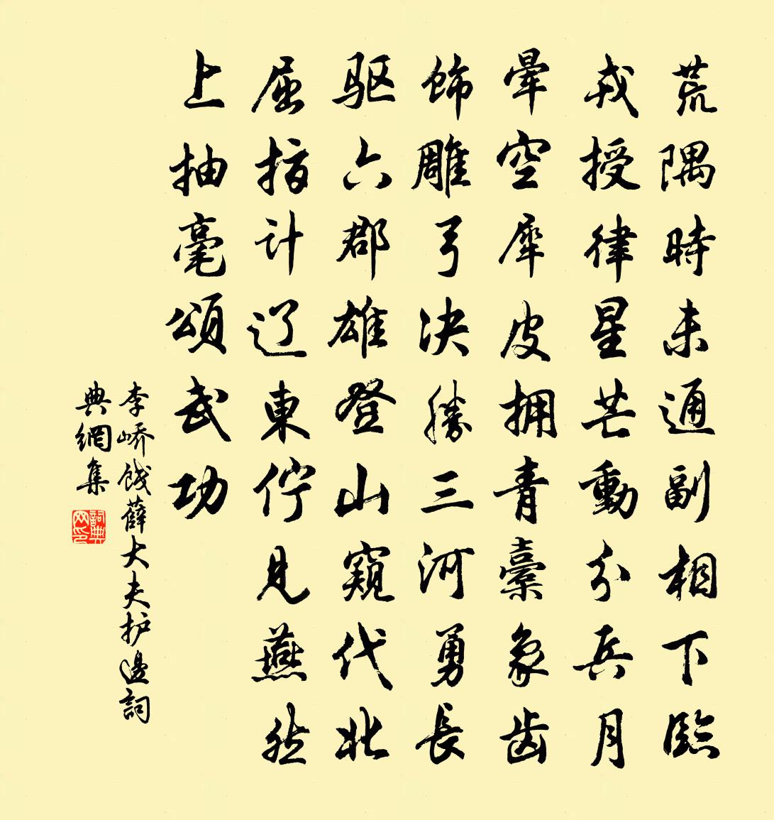 詩詞名句歷史字典書法欣賞書法字典國語詞典說文解字康熙字典古漢語字典標 題 作 者 詩 句 餞薛大夫護邊作者:李嶠 朝代:唐代餞薛大夫護邊原文荒隅時未通,副相下臨戎。授律星芒動,分兵月暈空。犀皮擁青橐,象齒飾雕弓。決勝三河勇,長驅六郡雄。登山窺代北,屈指計遼東。佇見燕然上,抽毫頌武功。詩詞問答問:餞薛大夫護邊的作者是誰?答:李嶠問:餞薛大夫護邊寫於哪個朝代?答:唐代問:餞薛大夫護邊是什麼體裁?答:五排李嶠餞薛大夫護邊書法欣賞餞薛大夫護邊書法作品注釋全唐詩:卷61_13詩詞推薦田侍郎歸鎮(一作上魏博田侍中八首)王建〔唐代〕去處長將決勝籌,回回身在陣前頭。賊城破後先鋒入,看著紅妝不敢收。熨帖朝衣拋戰袍,夔龍班裡侍中高。對時出郭視田訟三絕王炎〔宋代〕撥置文書小據鞍,舉頭歷歷見青山。老農指點黃雲好,為駐雙鳧一解顏。寄所知金君卿〔宋代〕正色當官取悔尤,清時無靠獨包羞。獄中劍氣猶盤郁,火里琴材未見收。自古聖賢由直道,遭時誣毀亦幽囚。願持書寺中所見四首張耒〔宋代〕江市樵蘇早散,山家燈火常昏。紗帽搘筇獨立,龕中佛像無言。隴頭吟曹勛〔宋代〕烏落黃雲塞草秋,隴頭之水東西流,水聲嗚咽鳴啾啾。馬聞思舊櫪,人聞思舊丘,年年征戰無時休。無時休,誰能入秦川界盧照鄰〔唐代〕隴阪長無極,蒼山望不窮。石徑縈疑斷,回流映似空。花開綠野霧,鶯囀紫岩風。春芳勿遽盡,留賞故人同。游蓮峰曹勛〔宋代〕絕壑垂蘿蓮出泥,靈根瀉碧潄春曦。支筇得住煙雲上,剩看飛流濺沫時。淳熙乙未登科是夏再中教官得綠紹興府教授秋項安世〔宋代〕五星高會記當年,笑語喧江夜不眠。今日江頭看獨往,人生聚散亦堪憐。次韻邢敦夫秋懷十首秦觀〔宋代〕渤海有巨鰲,其顛冠嵯峨。宿昔嘗小拚,八弦相盪摩。忽遭龍伯人,一舉空潮波。取皮煎作膠,清此崑崙河。九日家釀未熟蘇轍〔宋代〕平生不喜飲,九日猶一酌。今年失家釀,節到真寂寞。床頭瀉余樽,畦菊吐微萼。洗盞對妻孥,餚蔬隨厚薄。興來送別奉常林使君黃中易守延平林光朝〔宋代〕去時胡不到瓜時,上日多應柳絮飛。臥轍只緣滕壤少,懷章須要越人肥。三千儀禮非綿蕝,五十行春尚采衣。莫愛次出門韻楊萬里〔宋代〕有酒何須富?無車卻好行。眼中長得句,身外豈關情。遠嶺寒逾瘦,乾楓落更聲。好懷非自悶,且道向誰傾。蠟梅二首李石〔宋代〕莫學臥鬢花,嬌黃媚粉額。仙官道家妝,靜處立標格。和毗陵傅知錄送其侄得雋廣童科王邁〔宋代〕渥窪書驥子展足書長,朝發書燕都夕夜郎。一腹如椰貯書,揮毫落紙爛成章。誦筴無遺忘,風采聳動中書堂。伯父黃葵蘇軾〔宋代〕弱質困夏永,奇姿蘇曉涼。低昂黃金杯,照耀初日光。檀心自成暈,翠葉森有芒。古來寫生人,妙絕誰似昌。晨妝聞釋子棲玄欲奉道因寄許渾〔唐代〕欲求真訣戀禪扃,羽帔方袍盡有情。仙骨本微靈鶴遠,法心潛動毒龍驚。三山未有偷桃計,四海初傳問菊名。今日玉蝴蝶李綱〔宋代〕萬古秣陵江國,艤舟煙岸,千里雲林。故壘高樓,凝望遠水遙岑。景陽鍾、那聞舊響,玉樹唱、空有餘音。感春心一室陸游〔宋代〕九萬笑鵬摶,幽居一室寬。雨聲便早睡,酒力壓新寒。嬾覺閒多味,衰知死有端。此生吾自斷,不必夢邯鄲。寄友人姚合〔唐代〕日暮掩重扉,抽簪復解衣。漏聲林下靜,螢色月中微。秋霽露華結,夜深人語稀。殷勤故山路,誰與我同歸。胡帥見和用韻再寄黃彥平〔宋代〕喬木猶春色,名家亦世臣。安危思有寄,文武不無人。翰墨昭前烈,功勳踵後塵。八蕭終鼎鼐,二賈且絲論。名句推薦終罷斯結廬,慕陶直可庶。韋應物《東郊》 惶恐灘頭說惶恐,零丁洋里嘆零丁。文天祥《過零丁洋》 異鄉物態與人殊,惟有東風舊相識歐陽修《春日西湖寄謝法曹歌》 常思某人境界不及我,某人命運不及我,則可以知足矣王永彬《圍爐夜話·第六一則》 對菊難逢元亮酒,登樓愧乏仲宣才。秋瑾《九日感賦》 崑崙之高有積雪,蓬萊之遠常遺寒。王令《暑旱苦熱》 相思相見知何日?此時此夜難為情!李白《三五七言 / 秋風詞》 可惜重陽,不把黃花與。吳文英《蝶戀花·九日和吳見山韻》 綠杯紅袖趁重陽。人情似故鄉。晏幾道《阮郎歸·天邊金掌露成霜》 忠恕違道不遠。施諸己而不願,亦勿施於人。子思《中庸·第十三章》