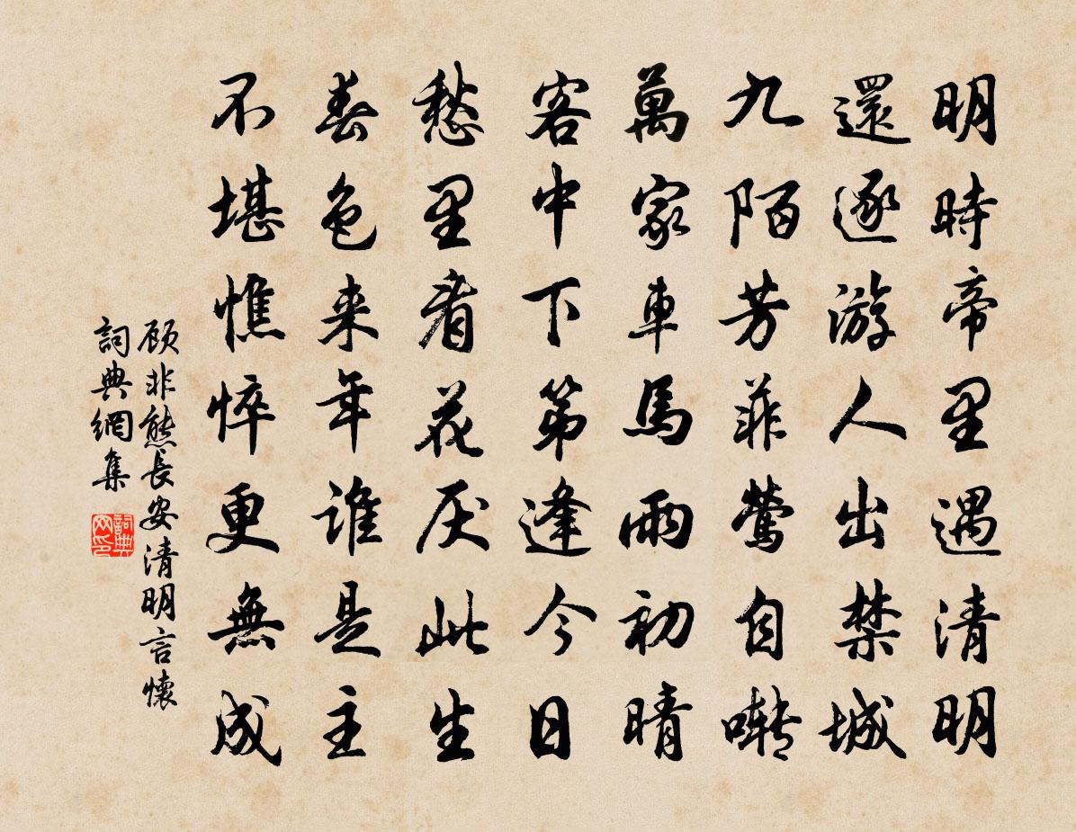 詩詞名句歷史字典書法欣賞書法字典國語詞典說文解字康熙字典古漢語字典標 題 作 者 詩 句 長安清明言懷作者:顧非熊 朝代:唐代長安清明言懷原文明時帝里遇清明,還逐遊人出禁城。九陌芳菲鶯自囀,萬家車馬雨初晴。客中下第逢今日,愁里看花厭此生。春色來年誰是主,不堪憔悴更無成。詩詞問答問:長安清明言懷的作者是誰?答:顧非熊問:長安清明言懷寫於哪個朝代?答:唐代問:長安清明言懷是什麼體裁?答:七律顧非熊長安清明言懷書法欣賞長安清明言懷書法作品注釋全唐詩:卷509-52詩詞推薦陳叔易學士母阮氏輓詞二首陳與義〔宋代〕典刑奕奕照來今,鶴髮魚軒汝女潯。避地梁鴻不偕老,弄烏萊子若為心。送葬忽見三千乘,奉祱那聞五百金。婦德張工部至薄寒山下有書無由馳報輤車之至倍切悲懷權德輿〔唐代〕書來遠自薄寒山,繚繞洮河出古關。今日難裁秣陵報,薤歌寥落柳車邊。春中興慶宮酺宴李隆基〔唐代〕九達長安道,三陽別館春。還將聽朝暇,回作豫游晨。不戰要荒服,無刑禮樂新。合酺覃土宇,歡宴接群臣。玉斝道傍紡女姚勉〔宋代〕道傍女予雙髻鴉,兩足如雪踏紡車。村莊人家只如此,齊宮 * 花。賀游先生再入元樞宋伯仁〔宋代〕粵從寶紹歷嘉淳,國事如棋局幾新。欲識萬年占氣脈,須教一著頓精神。重臣休憚頭盈雪,赤子鹹期屋自春。天下賢良一和五篇不可及戴復古〔宋代〕世路從他險,輸君酒盞深。立談雙白璧,一諾百黃金。志大不少屈,詩工非苦吟。相隨萬里去,老鶴豈無心。游彰法寺打擢秀閣詩以行趙蕃〔宋代〕四海擢秀閣,茲晨彰法游。名隨寺俱徙,地入道家流。尚喜黃詩在,仍容墨本求。從今茅屋底,自有皖山幽。偶書黃庚〔宋代〕老眼看書暗,桑榆景漸催。文章身後貴,懷抱酒邊開。燈火夢猶在,功名心已灰。客來休問字,且覆掌中杯。百舌鳥二首無則〔唐代〕千愁萬恨過花時,似向春風怨別離。若使眾禽俱解語,一生懷抱有誰知。長截鄰雞叫五更,數般名字百般聲。饒伊和李校書新題樂府十二首驃國樂元稹〔唐代〕驃之樂器頭象駝,音聲不合十二和。促舞跳趫筋節硬,繁辭變亂名字訛。千彈萬唱皆咽咽,左旋右轉空傞傞。俯地夜坐有感高斯得〔宋代〕自嘆吾生行且休,誰能長抱畏塗憂。三番自取刳腸害,百練多成繞指柔。鞭鳳笞鸞勞夢想,鬥雞走狗好沉浮。從今聚景園追涼曾由基〔宋代〕五雲縹緲護檐牙,不是尋常富貴家。樹樹風蟬涼意足,衣巾時復墮槐花。覃山人隱居杜甫〔唐代〕南極老人自有星,北山移文誰勒銘。征君已去獨松菊,哀壑無光留戶庭。予見亂離不得已,子知出處必須經。高車喜晴應詔勑自疏韻詩庾信〔南北朝〕御辯誠膺錄。維皇稱有建。雷澤昔經漁。負夏時從販。柏梁驂駟馬。高陵馳六傳。有序屬賓連。無私表平憲。河堤十月二十二夜同方寺丞宿瀑庵讀劉賓客集劉克莊〔宋代〕瀑山木落霜寒夜,共讀吾家夢得詩。坐對遺篇忘漏盡,手遮殘燭怕風吹。森嚴似聽元戎令,機警如看國手棋。千載上竺池院歸鷲峰庵釋智愚〔宋代〕鷲嶺心旌動,池邊影漸疏。一生無定力,七十尚多居。細雨灑松塢,涼風挽竹輿。白雲相望處,跼蹐自渠渠。次韻通判都官和諸公雪中席上之作強至〔宋代〕龍沙千里絕纖埃,銀色渾疑王母台。宴席此時驚酒薄,曉枝無處認梅開。騁辭梁苑客方至,乘興越溪人自來。從古法駕導引(壽城山,用壽胡潭東韻)劉辰翁〔宋代〕臣尚少,臣尚少,少似此翁些。點半點斑今似雪,飛來飛去自如花。醉眼看紅霞。人間事,人間事,倒杖柱頤斜。見三山翁插山茶花一朵二首蘇泂〔宋代〕人老簪花卻自然,花紅就不厭華顛。人間無此風流樣,何止源流二百年。喜雪二首吳潛〔宋代〕黃竹歌中百姓歡,去天近處雪花乾。蔡洄事業方歸度,剡曲風流欲訪安。便覺光輝生萬里,定知潤澤被三韓。衰頹名句推薦勸君終日酩酊醉,酒不到劉伶墳上土。李賀《將進酒》 君家玉女從小見,聞道如今畫不成。黃庭堅《謝張仲謀端午送巧作》 商女不知亡國恨,隔江猶唱後庭花。杜牧《泊秦淮》 仍憐故鄉水,萬里送行舟。李白《渡荊門送別》 青,取之於藍而青於藍;冰,水為之而寒於水。荀子《荀子·勸學》 臣聞君子樂得其志,小人樂得其事。姜子牙《六韜·文韜·文師》 賢不肖不雜則英傑至,是非不亂則國家治荀子《荀子·王制》 無作牛山悲,惻愴淚沾臆。李白《君子有所思行》 關河底事空留客?歲月無情不貸人。于謙《立春日感懷》 好名羈行,重利無虧。來俊臣《羅織經·保身卷第七》
