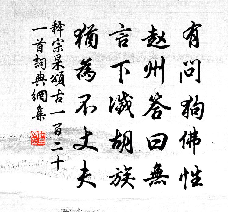 詩詞名句歷史字典書法欣賞書法字典國語詞典說文解字康熙字典古漢語字典標 題 作 者 詩 句 頌古一百二十一首作者:釋宗杲 朝代:宋代頌古一百二十一首原文有問狗佛性,趙州答曰無。言下滅胡族,猶為不丈夫。詩詞問答問:頌古一百二十一首的作者是誰?答:釋宗杲問:頌古一百二十一首寫於哪個朝代?答:宋代釋宗杲頌古一百二十一首書法欣賞頌古一百二十一首書法作品詩詞推薦和元規拜違張繼先〔宋代〕才到巍峨畔,還登翠碧重。調青賡白雪,琴靜撫黃鐘。履踐古人道,追遊仙者蹤。自來多福力,想念各疏慵。何處南坡不以科目自累而以風雅處鳴請余為賦沈說〔宋代〕鳳銜科詔出祥雲,底事儒林有逸民。四海聲名難著我,一坡風月正宜人。鏡留白髮非遮俗,家釀黃柑可接春。只許至灌溪予瑰老二首王炎〔宋代〕食肉定知非虎頸,騰身自笑不鳶肩。相逢莫話青雲事,借我清風一枕眠。次前人似任叔實陳著〔宋代〕字字真真幻幻心,講氈須體美中箴。分明示我豬龍訓,剪刷成他鸞鵠襟。行小圃偶成唐律呈直翁自昭叔夏吳潛〔宋代〕今年花信已成空,白白紅紅苦雨中。老境摧頹春更好,愁城高聳酒難攻。一生當號知非子,萬事都歸亡是公。巴得宴清都·連理海棠吳文英〔宋代〕繡幄鴛鴦柱。紅情密,膩雲低護秦樹。芳根兼倚,花梢鈿合,錦屏人妒。東風睡 * 枝,正夢枕、瑤釵燕股。障灩越王樓歌(太宗子越王貞為綿州刺史,作台於州城西北)杜甫〔唐代〕綿州州府何磊落,顯慶年中越王作。孤城西北起高樓,碧瓦朱甍照城郭。樓下長江百丈清,山頭落日半輪明。君王題耕織圖二十四首奉懿旨撰趙孟頫〔元代〕白露下百草,莖葉日紛委。是時禾黍登,充積遍都鄙。在郊既千庾,入邑復萬軌。人言田家樂,此樂誰可比。租賦早出小北門趙蕃〔宋代〕聞道灊皖下,雜然仙佛居。心期窮杖屨,宿昔戒車輿。晨起先僧磬,逢人盡趁虛。煙霏欣在望,風露盡侵裾。園中口占二首張鎡〔宋代〕荇帶荷錢漸滿池,吹香隔岸盡荼醾。潛魚忽擲金梭起,補足今朝未了詩。李堅甫淨居雜題一十三首退庵文同〔宋代〕未老先求退,題庵乃自呼。有才須進用,能保此名無。題山寺釋紹嵩〔宋代〕江上山頭寺,陰階竹掃苔,舟橫漁唱晚,松暮鶴飛回。野渡花爭發,春荷葉半開。嬉遊不可極,留眼要重來。和苦寒韻王洋〔宋代〕秋容落落轉頭空,誰與玄冥競長雄。侵剝老條無硬對,栽培玉村是家風。漫夸鶴骨飛饒健,強說龜腸語轉工。對此次韻弟觀雪中二首陳著〔宋代〕翦耳嚴風利似刀,吹噓滕六做功勞。大包天地為一色,老盡山林無二毛。借暖尚能賒綠蟻,禦寒終不羨裘羔。天涯伏蒙十六叔寄示喜慶感懷三十韻因獻之權德輿〔唐代〕受氏自有殷,樹功緬前秦。圭田接土宇,侯籍相紛綸。道義集天爵,菁華極人文。握蘭中台並,折桂東堂春。祖德早朝王維〔唐代〕皎潔明星高。蒼茫遠天曙。槐霧暗(一作郁)不開。城鴉鳴稍去。始聞高閣聲。莫辨更衣處。銀燭已成行。金(一送鄭孝廉淮西覲省皎然〔唐代〕離袂翠華滿,晨羞欲早行。春風生楚樹,曉角發隋城。野靄濕衣彩,江鴻增客情。征途不用戒,坐見白波清。首夏三首白玉蟾〔宋代〕滿目晴巒總是詩,詩情飛絮逐遊絲。雨肥碧澗落花水,風瘦青松啼鳥枝。無題馮伯規〔宋代〕暇時結客小舂容,路直重岩紫翠峰。雲閣翬飛翼鸞鳳,石楠盤屈老虬龍。林扉雨過便秋菊,山寺風清度晚鐘。快展仆領貢舉未出錢穆父雪中作詩見及三月二十日蘇軾〔宋代〕雪知我出已全消,花待君來未敢飄。行避門生時小飲,忽逢騎吏有嘉招。魚龍絕技來千里,斑白遺民數四朝。知有名句推薦君子耳不聽淫聲,目不視邪色,口不出惡言荀子《荀子·樂論》 不知其子視其友,不知其君視其左右。荀子《荀子·性惡》 不見又思量,見了還依舊。李之儀《謝池春·殘寒銷盡》 己不自信,何以信於人?張廷玉《明史·列傳·卷四十九》 霜天秋曉,正紫塞故壘,黃雲衰草。蔡挺《喜遷鶯·霜天秋曉》 牧人驅犢返,獵馬帶禽歸。王績《野望》 慎在於畏小;智在於治大尉繚《尉繚子·十二陵》 離一切諸相則名諸佛。鳩摩羅什譯《金剛經·離相寂滅》 不可同日而語畢沅《續資治通鑑·宋紀·宋紀七十三》 我本不棄世,世人自棄我。李白《送蔡山人》