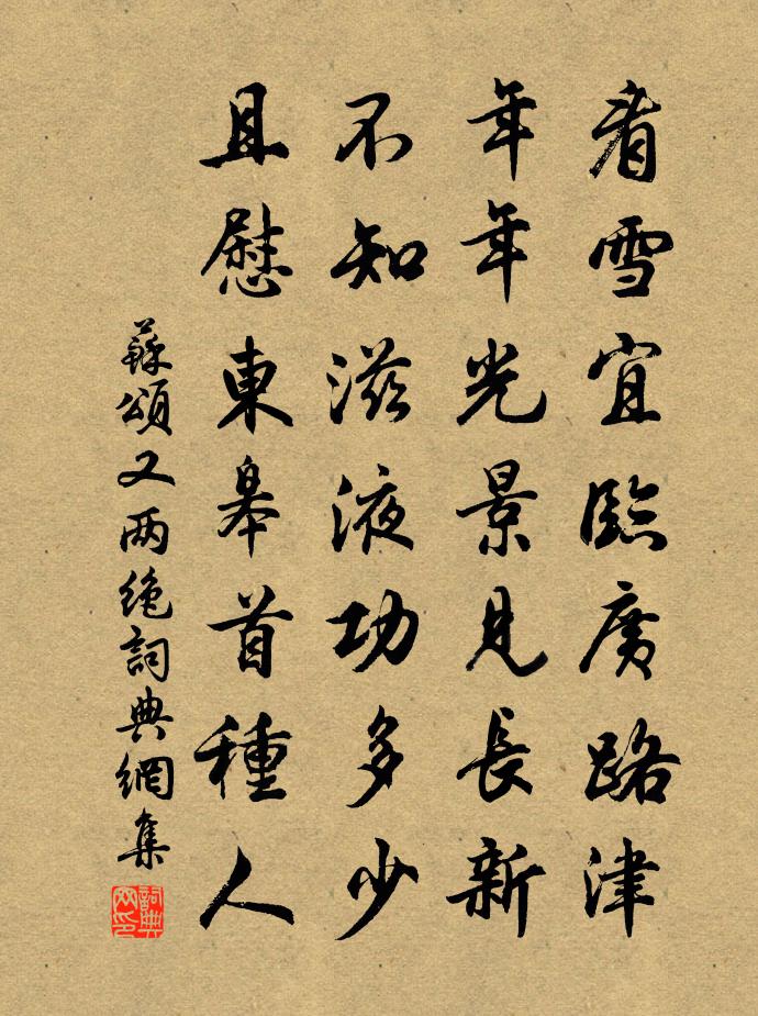 詩詞名句歷史字典書法欣賞書法字典國語詞典說文解字康熙字典古漢語字典標 題 作 者 詩 句 又兩絕作者:蘇頌 朝代:宋代又兩絕原文看雪宜臨廣路津,年年光景見長新。不知滋液功多少,且慰東皋首種人。詩詞問答問:又兩絕的作者是誰?答:蘇頌問:又兩絕寫於哪個朝代?答:宋代蘇頌又兩絕書法欣賞又兩絕書法作品詩詞推薦賀張帥王洋〔宋代〕門弧瑞靄曉氤氳,天錫熙朝社稷臣。京兆赭裾多譽久,甘泉紫橐眷恩新。一城和氣仁風書,萬口歡聲壽語春。端有烏夜啼(西叔兄生日)魏了翁〔宋代〕不肯呈身覓舉,那能隨俗為官。梅花寒颭書窗月,一味漂陽酸。梅里無邊春事,書中千古遐觀。鄰翁不識清閒樂,織錦回文戴表元〔宋代〕君不見秦州城中雙蔕花,春風吹散著流沙。流沙千縈復萬轉,織入采機歌為斷。歌不斷,可奈何,人生富貴憂患多孤坐北齋因懷出處之難偶成感詠宋庠〔宋代〕白頭榮路念何之,出處空驚未得宜。劉放老於宮裡樹,莊生愁煞廟中犧。嵩岩桂塢堪休影,潁曲芝廛好療飢。但願過橫山塔下楊萬里〔宋代〕六年三度過蘭溪,總是殘春首夏時。最感橫山山上塔,迎人東去送人西。元日喜聞大禮寄上翰林四學士中書六舍人二十韻竇牟〔唐代〕有事郊壇畢,無私日月臨。歲華春更早,天瑞雪猶深。玉輦回時令,金門降德音。翰飛鴛別侶,叢植桂為林。粉澤琵琶亭董嗣杲〔宋代〕艱難罹歉歲,寂寞向他州。分絕青雲上,家遙滄海頭。空江盪寒月,枯葦積荒洲。不奈譙城角,嗚嗚吹亂愁。挽陳潮州伯霆劉克莊〔宋代〕當年舍選最居優,上到青雲亦白頭。律賦數篇天下誦,遺書幾卷館中留。入游太乙曾臨地,出牧昌黎所典州。耆舊春雨衛宗武〔宋代〕青皇初布令,大塊已流濕。霏霏散沖融,一一成膏液。駸尋夜漏分,掀揚風箭疾。孤燈月明眼,漸覺檐花密。滴瀝偈頌一百二十三首釋祖欽〔宋代〕個事本成現,覓則不可見。白圭本無瑕,琢磨乃成玷。執之以實法,空中生閃電。視之以等閒,腳下添紅線。若是樂語王義山〔宋代〕秘傳玉訣自靈修。家在仙山最上頭。更有仙茅香馥郁,年年今日,薰風時候,掇取獻龍樓。枕流軒關希聲〔宋代〕山出太虛外,溪流千古高。臨窗喧客枕,洗耳濺僧袍。夜月氣猶凜,秋風聲更豪。二年游賞劇,欲別首頻搔。初秋閒記園池草木范成大〔宋代〕越城芳徑手親栽,紅淺黃深次第開。不用小山招陷賦,身如強健日千回。趙倅昴發第四十六文天祥〔宋代〕風雷颯萬里,大江動我前。青衿一惟悴,名與日月懸。次韻丁制置遠迎三絕魏了翁〔宋代〕溪瘴蠻煙隔市朝,十年山徑長蒿茅。好風吹送知時雨,生意洋洋大國郊。和曾子實題畫箋韻宋自遜〔宋代〕鷺引歸船犬吠籬,片時風景萬千詩。向來柳下曾沽酒,不似如今看畫時。治心吟邵雍〔宋代〕心親於身,身親於人。不能治心,焉能治身。不能治身,焉能治人。曲肱詩二十首白玉蟾〔宋代〕不識看經不坐祥,飢來喫飯困來眠。玉皇若不開青眼,卻是凡夫骨未仙。詠初日趙匡胤〔宋代〕太陽初出光赫赫,千山萬山如火發。一輪頃刻上天衢,逐退群星與殘月。題碧沼裴極〔宋代〕一沼光涵四座寒,夕陽回首更憑欄。憑師早把香蓮種,他日期來結社看。名句推薦得人之道,在於知人;知人之法,在於責實。脫脫《宋史·列傳·卷九十七》 東風不管琵琶怨。落花吹遍。許棐《後庭花·一春不識西湖面》 山高月小,水落石出。蘇軾《後赤壁賦》 寶奩明月不欺人,明日歸來君試看。嚴仁《玉樓春·春思》 投我以木瓜,報之以瓊琚。佚名《木瓜》 茶性儉,不宜廣,廣則其味黯澹。陸羽《茶經·五之煮》 我行殊未已,何日復歸來。宋之問《題大庾嶺北驛》 人歸山郭暗,雁下蘆洲白。韋應物《夕次盱眙縣》 三分春色二分愁,更一分風雨。葉清臣《賀聖朝·留別》 不覺碧山暮,秋雲暗幾重。李白《聽蜀僧濬彈琴 / 聽蜀僧浚彈琴》